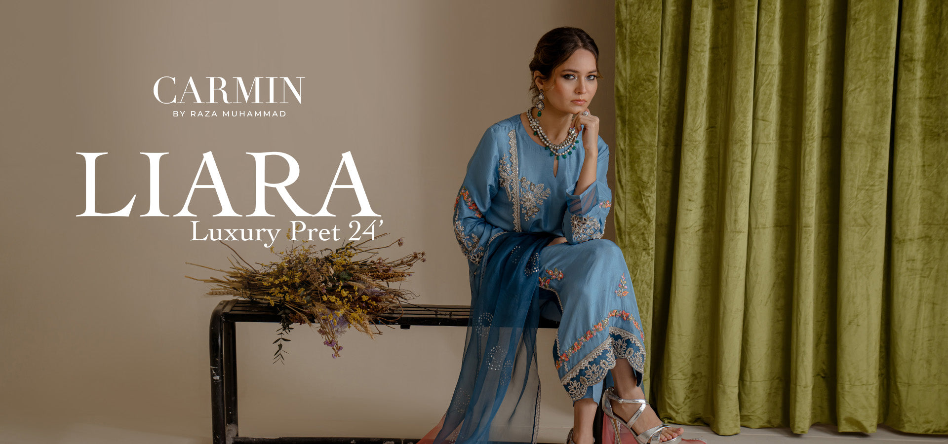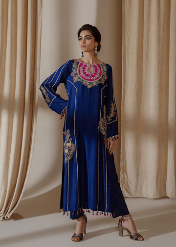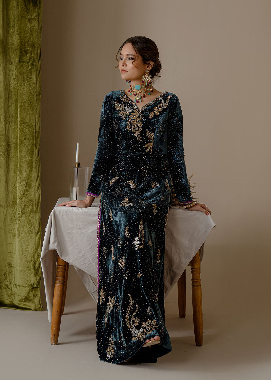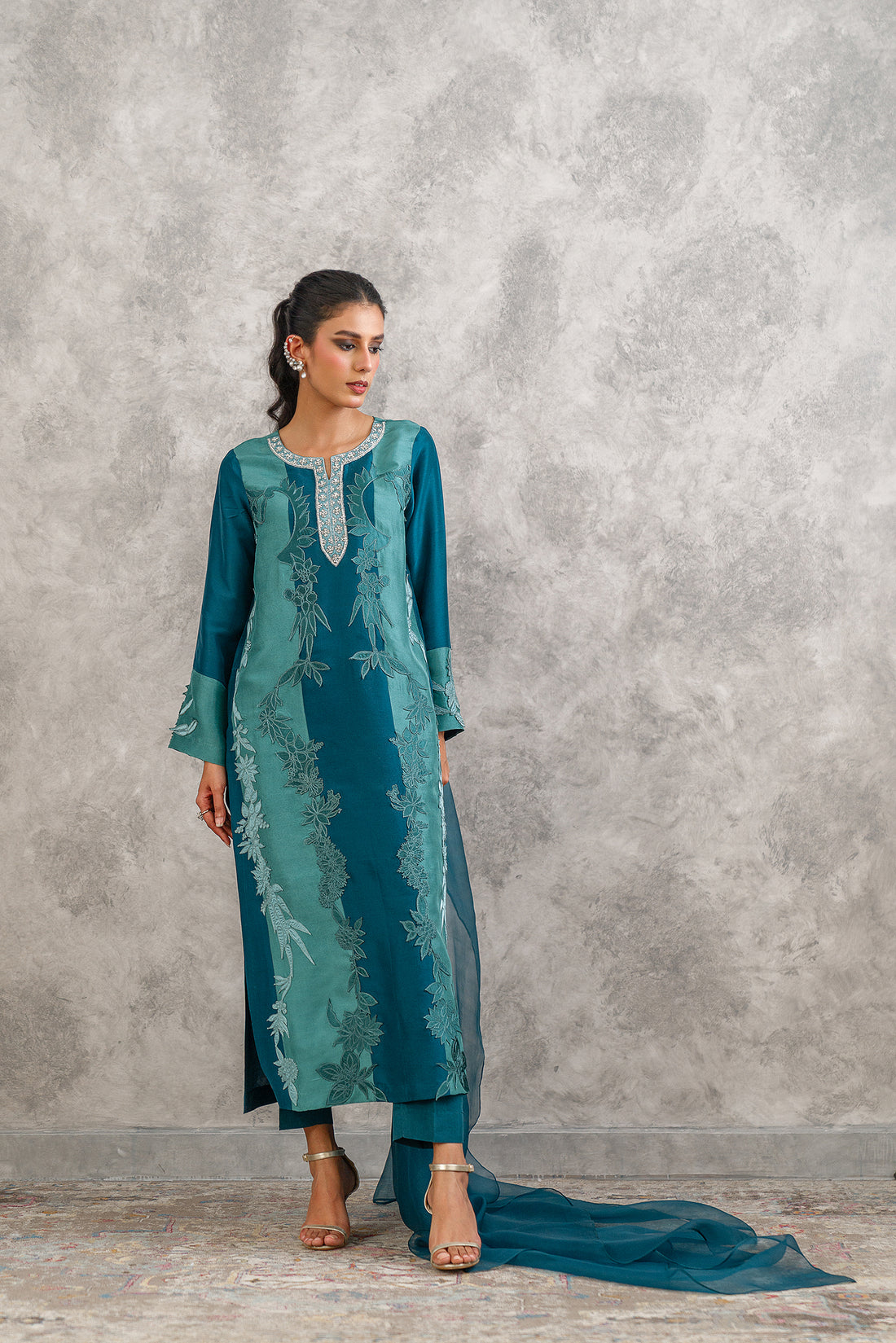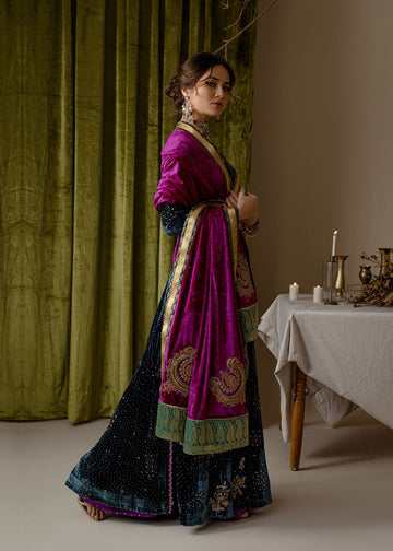 Our alluring sea green colored valvet and raw-silk shirt is delicately rendered with delicate zardoze work. It is paired with matching pants with embroidery motifs and organza dupatta, just ready to be styled for the festive occasion.