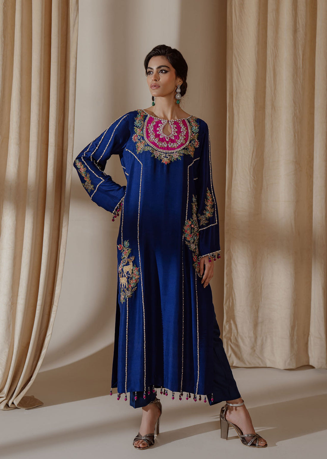 A traditional yet chic silhouette, this raw-silk shirt with with contrasting embroidery, featuring oriental motifs...