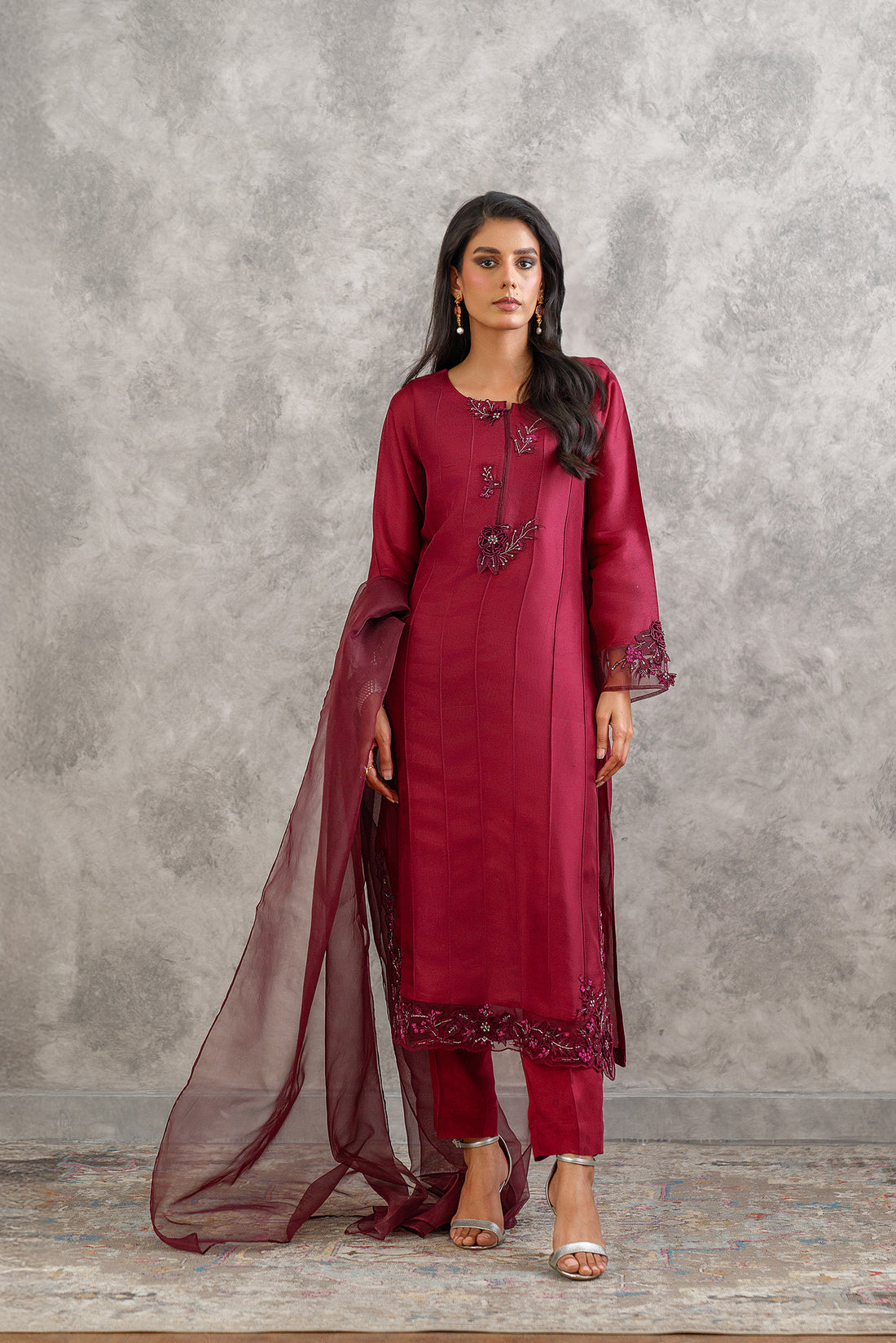 The outfit features a plum silk net shirt with flower imagery beautifully and intricately hand...