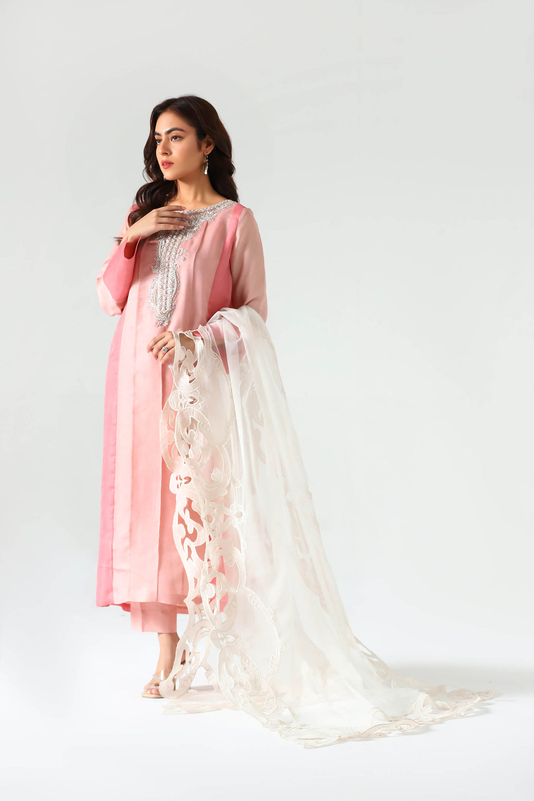 This light pink lawn creation features a charming chicken kari front panel, a traditional embroidery...
