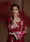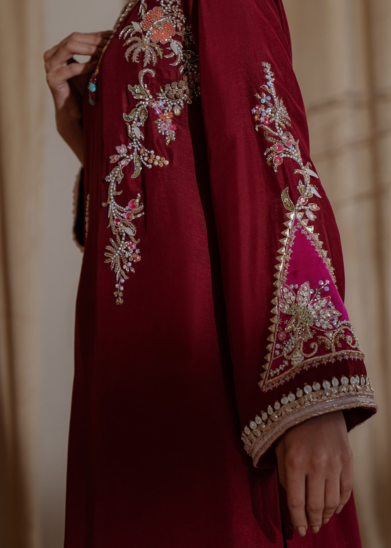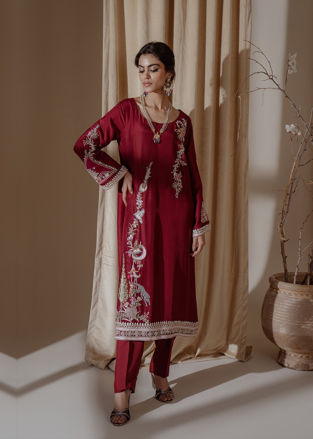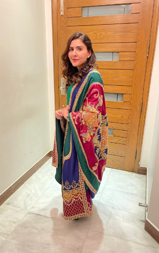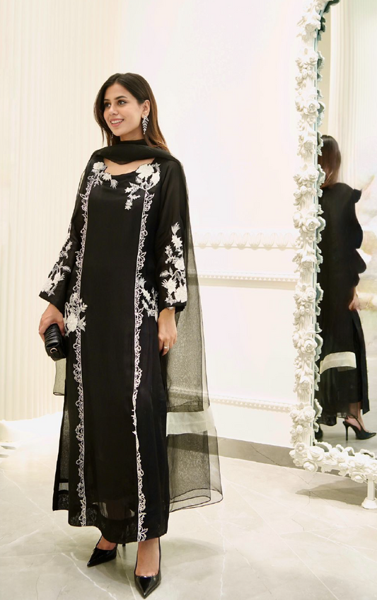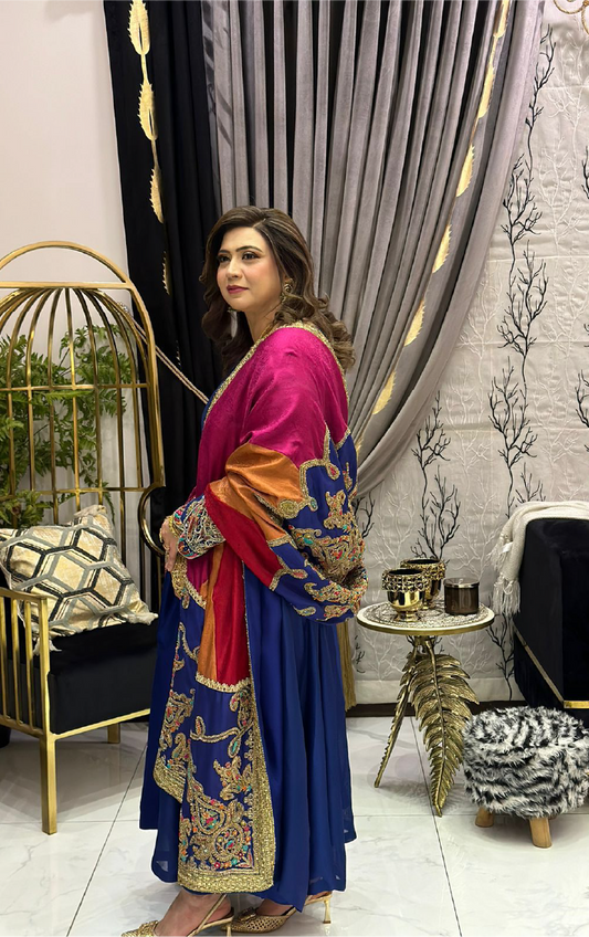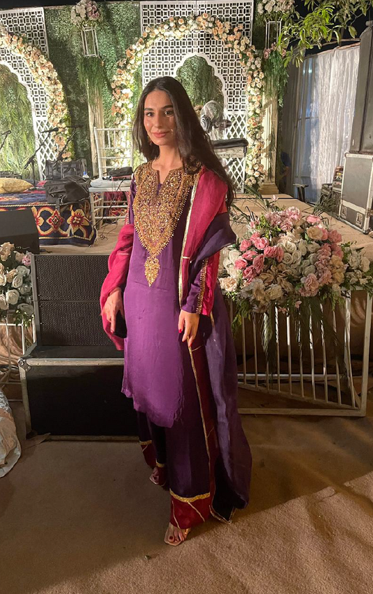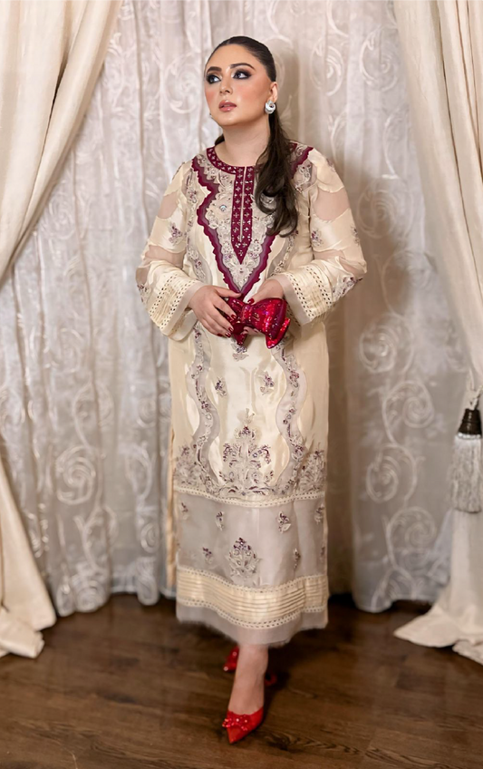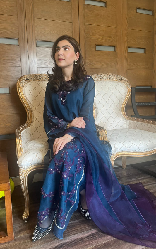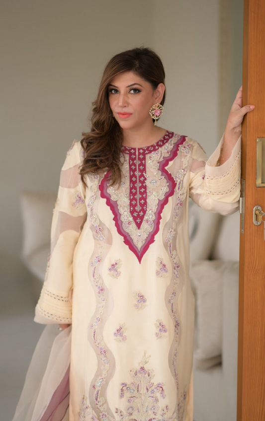 The ensemble showcases a A line shirt in a metallic silver zardozi and thread work in multi colored oriental motifs. Paired matching rawsilk pants and organza duppata, this dress is a prefect choice for the festive season.