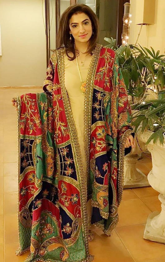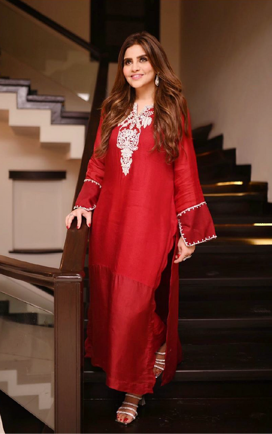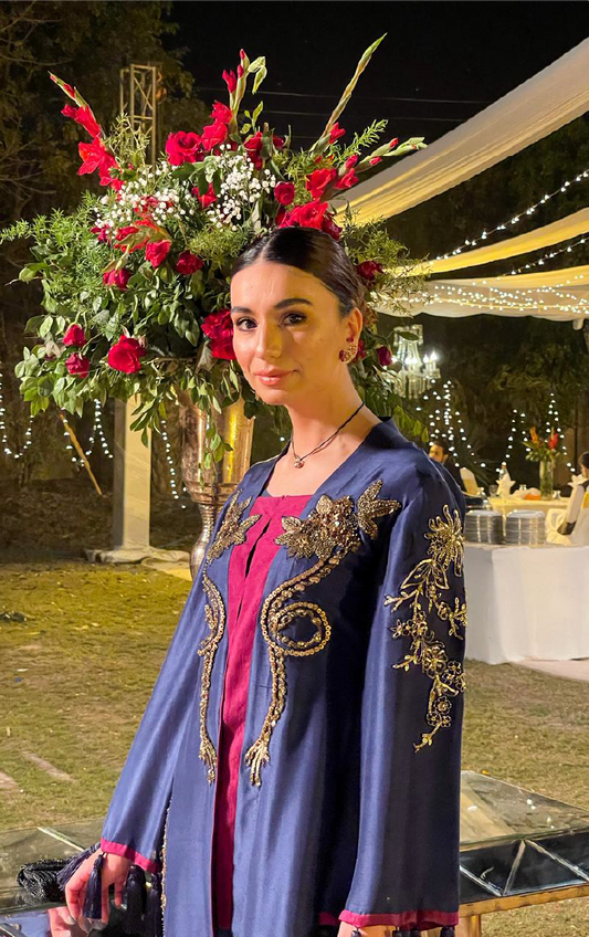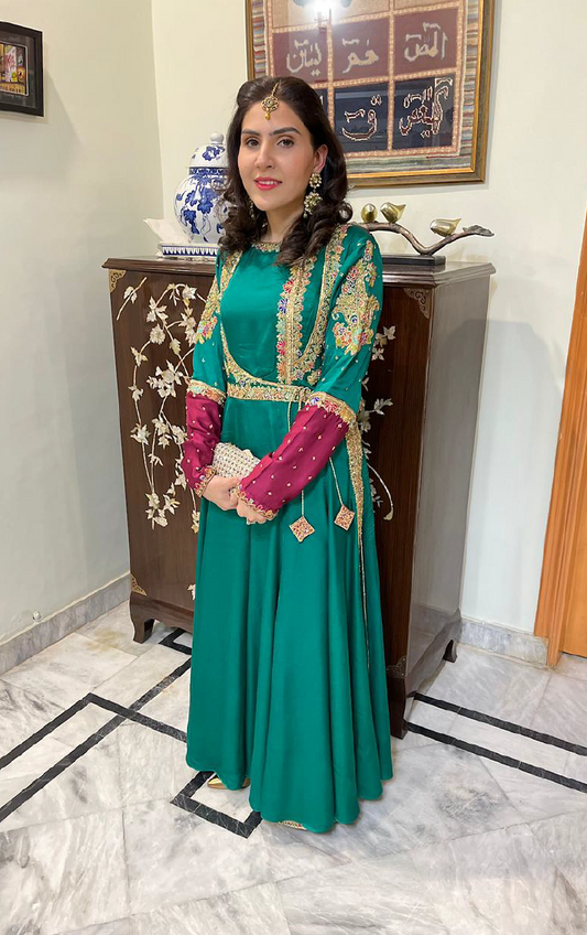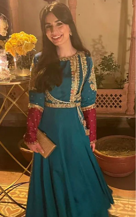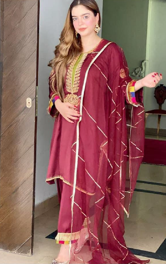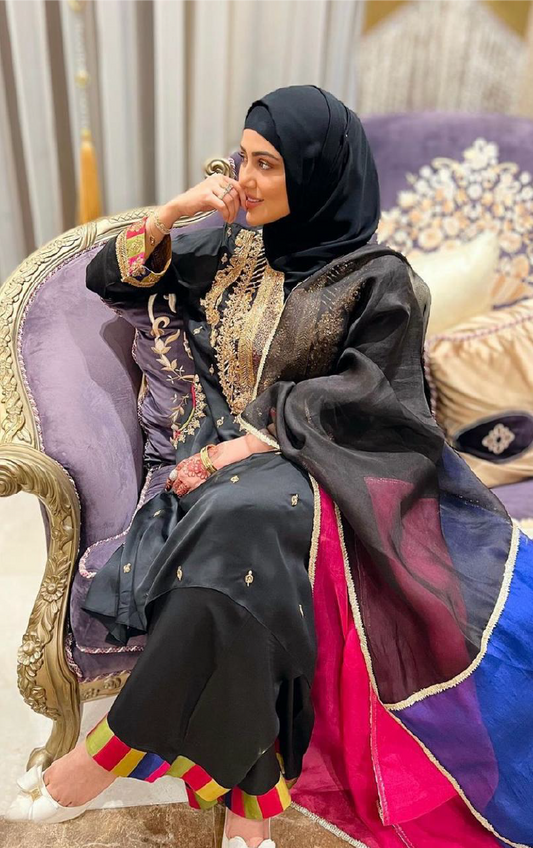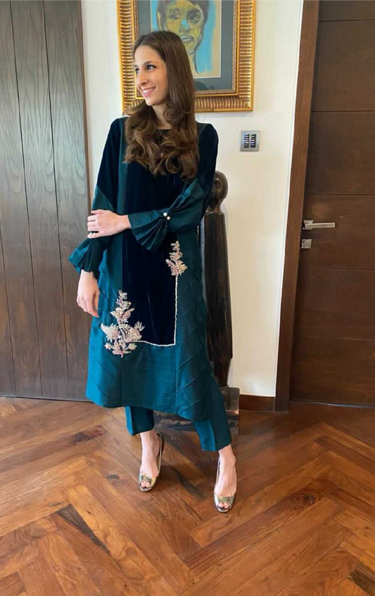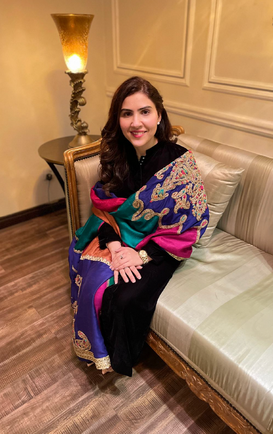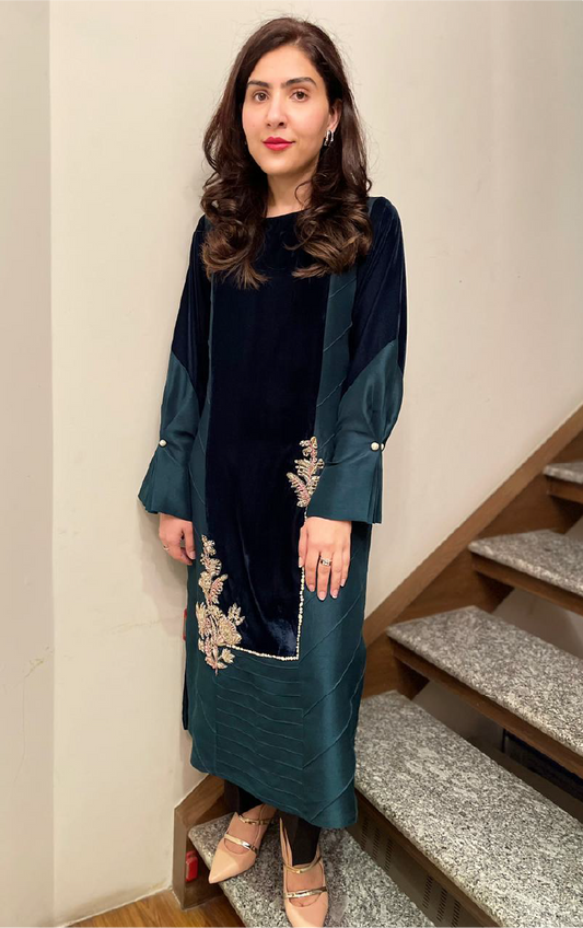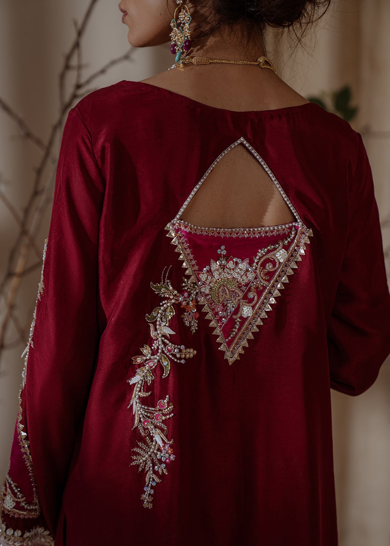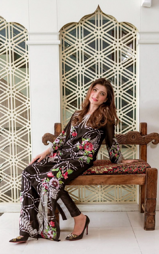 The ensemble showcases a A line shirt in a metallic silver zardozi and thread work in multi colored oriental motifs. Paired matching rawsilk pants and organza duppata, this dress is a prefect choice for the festive season.
