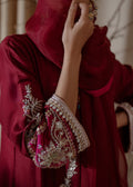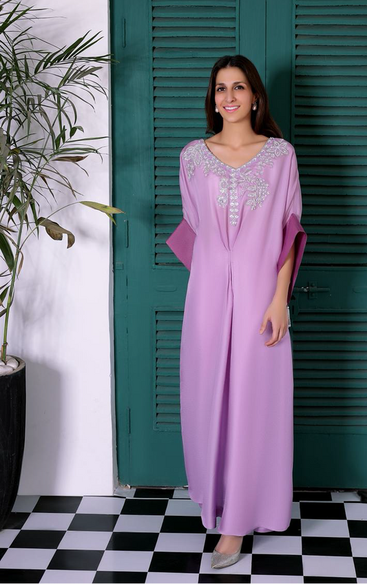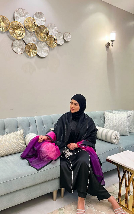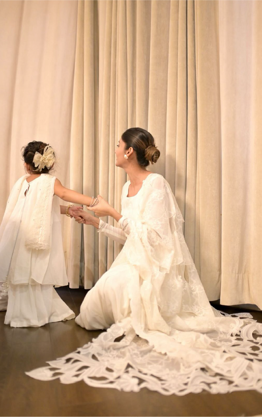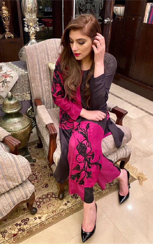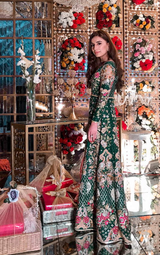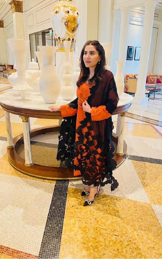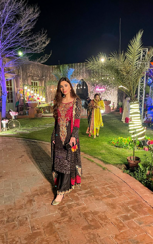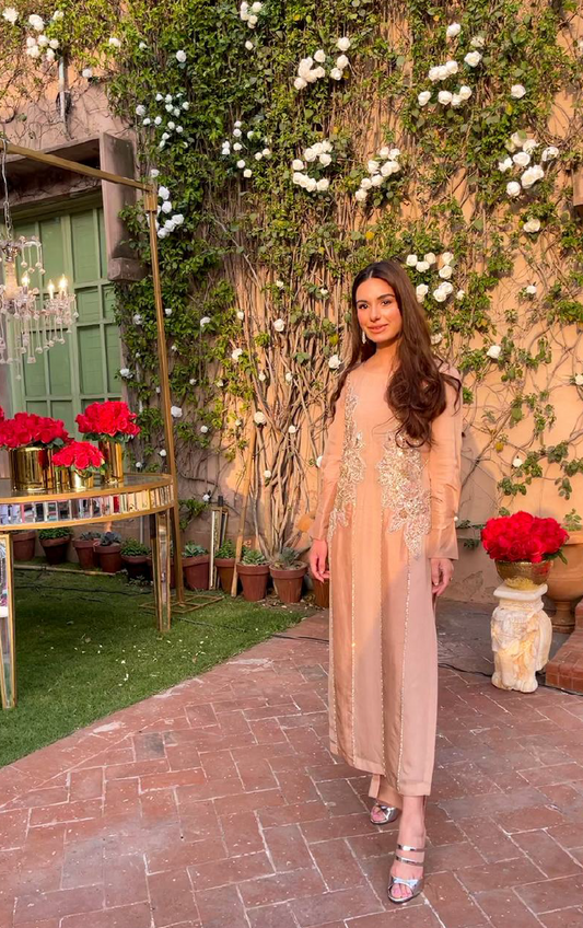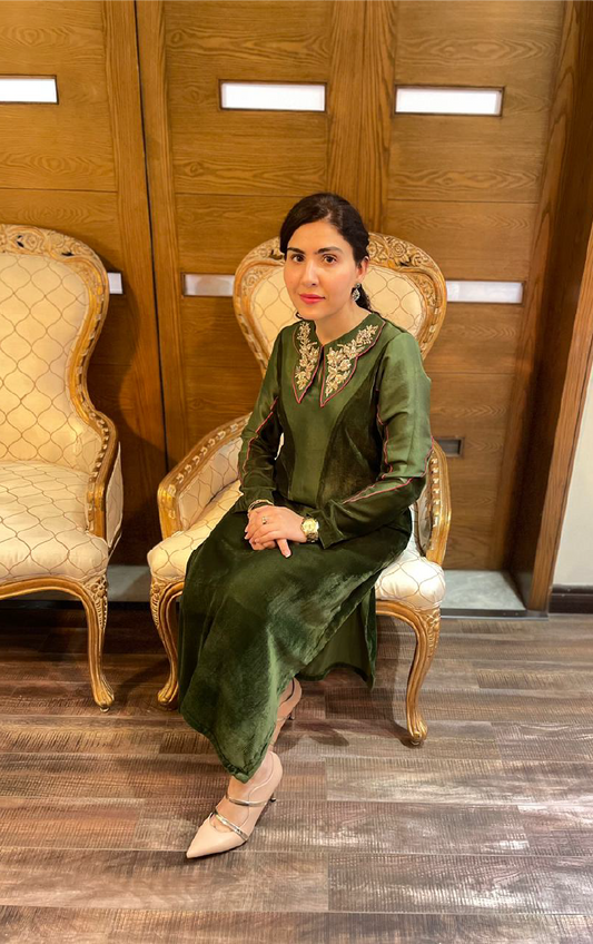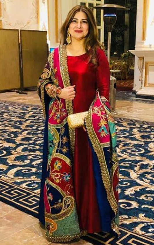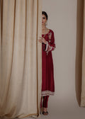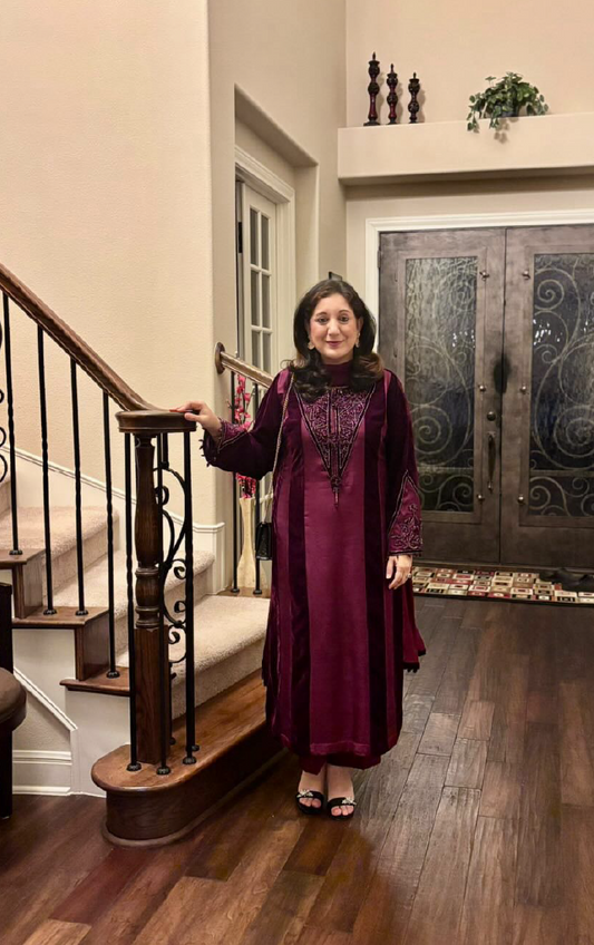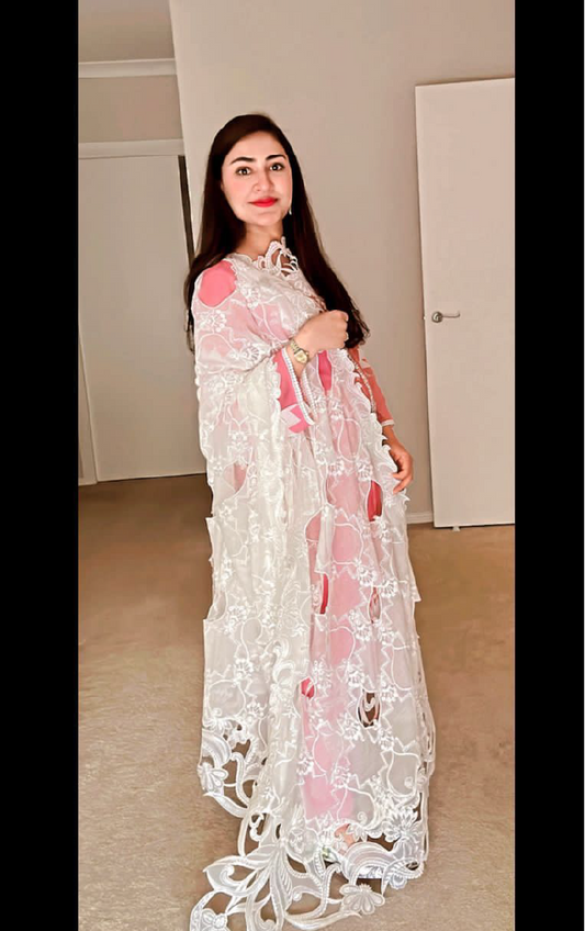 The ensemble showcases a A line shirt in a metallic silver zardozi and thread work in multi colored oriental motifs. Paired matching rawsilk pants and organza duppata, this dress is a prefect choice for the festive season.
