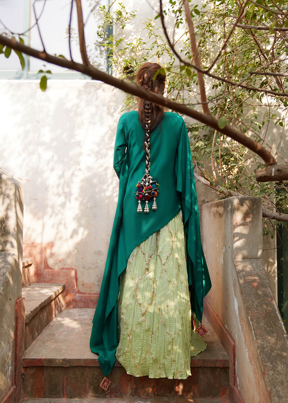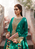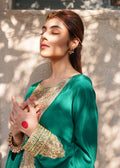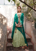 Aleah is an exquisite emerald green a-symmetric cape style top with intricate marori embroidery on the neck and sleeve. Paired with a mint green gota kinari embroidery crushed lehenga, this feminine and edgy design is perfect for any festivity.