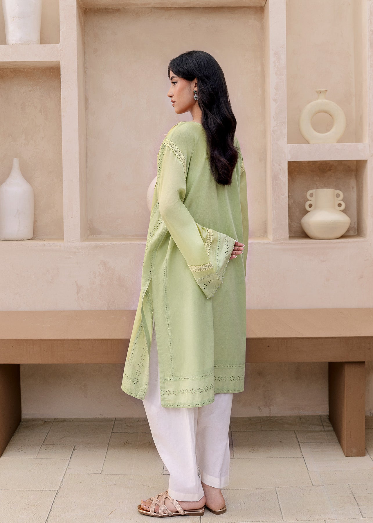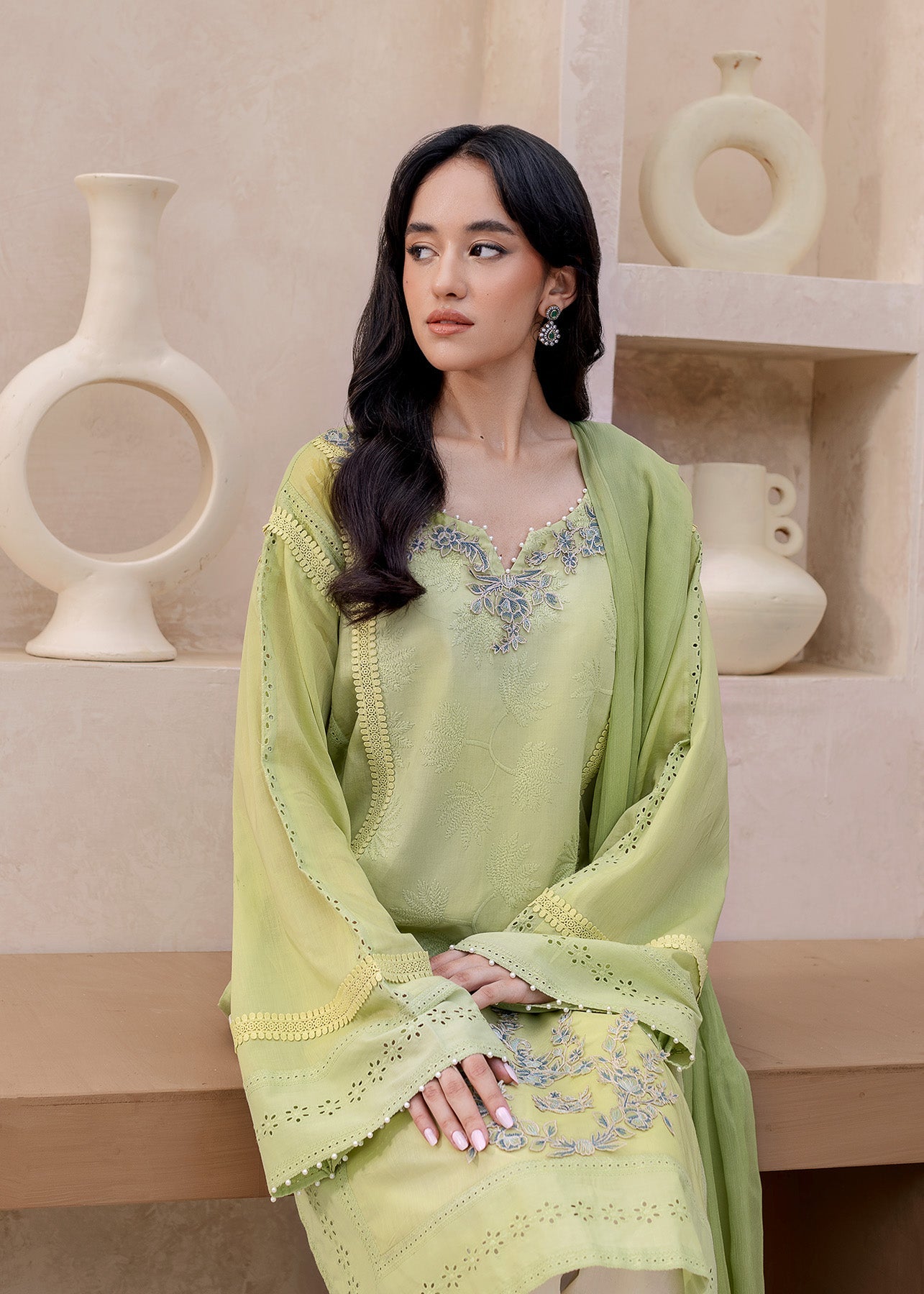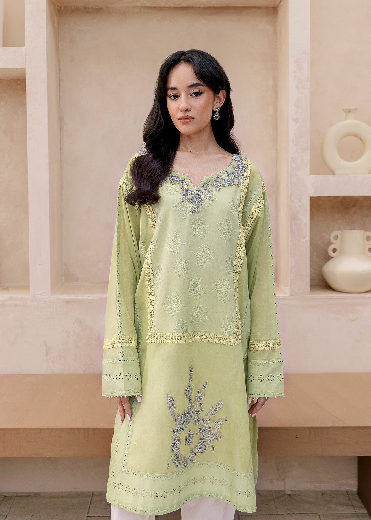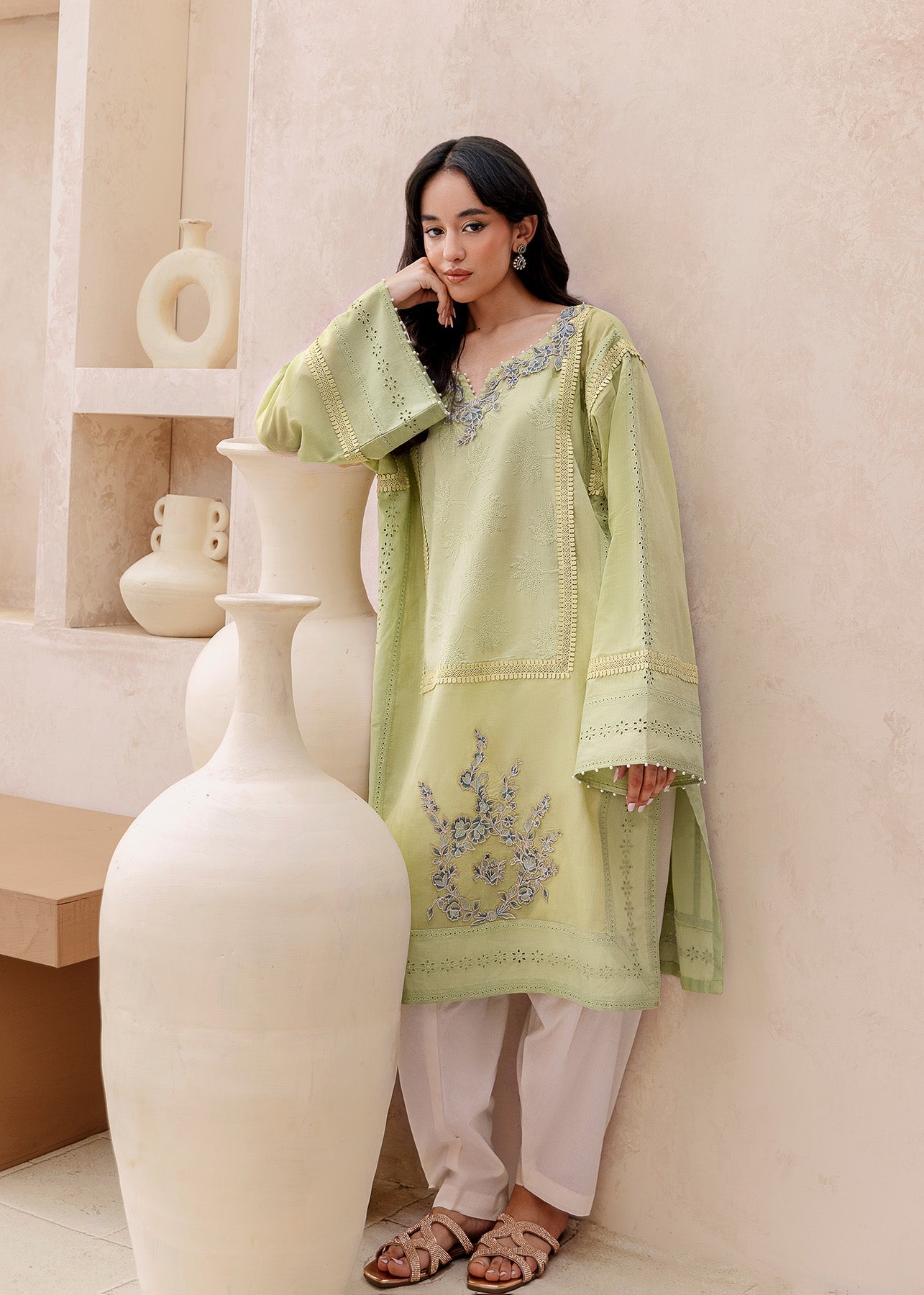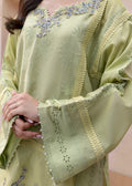 The Amaya ensemble offers a delightful fusion of tradition and modern flair. Crafted from cool, pistachio-colored lawn, it boasts a refreshing summer vibe. The neckline and daman come alive with beautiful blue floral embroidery. Playful chicken kari patches adorn the sleeves and the shirt itself, showcasing intricate designs. A subtle lace detail graces the front of the shirt and sleeves. The off-white trousers completes the look, creating a perfect balance between vibrant details and a calming base.
