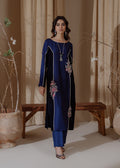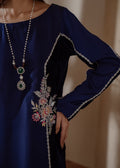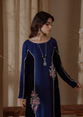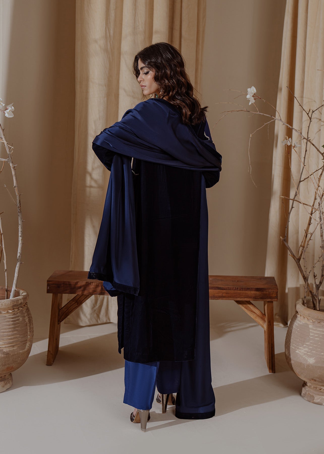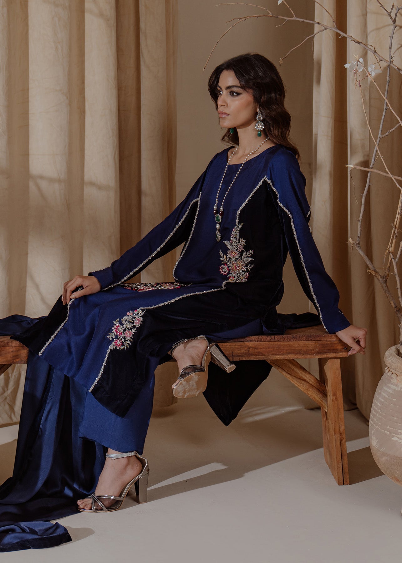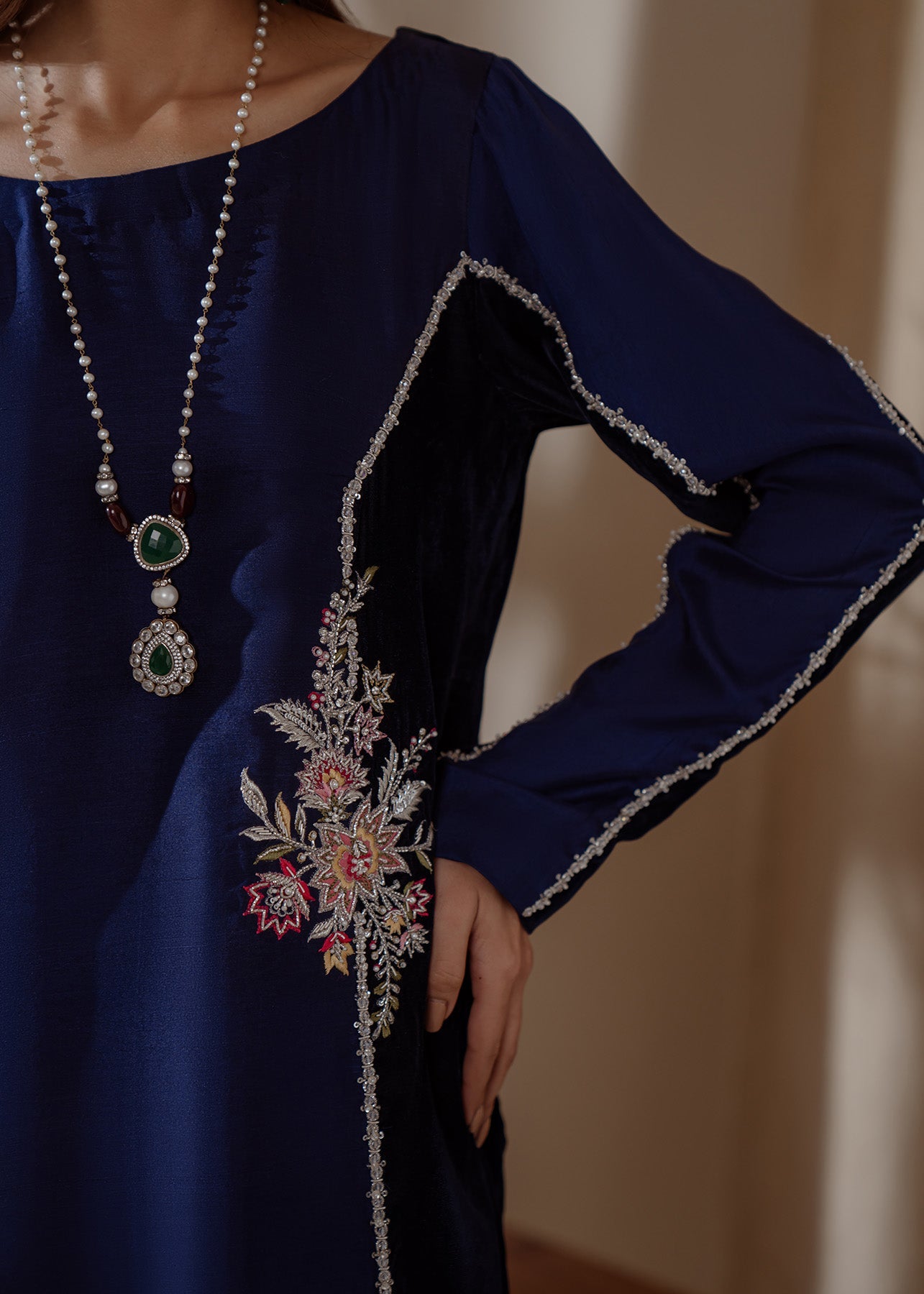 This raw silk shirt with valvet panels, is a perfect blend of class and elegance. In a luxe navy blue shade, the shirt features floral hand embroidery , which further complement the ensemble.