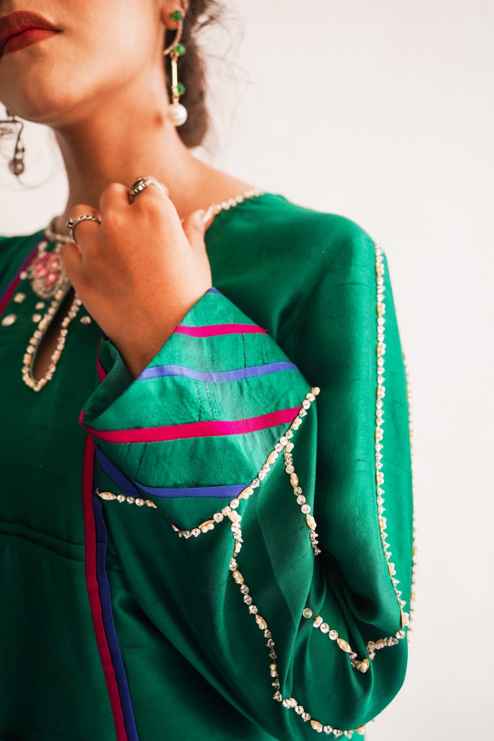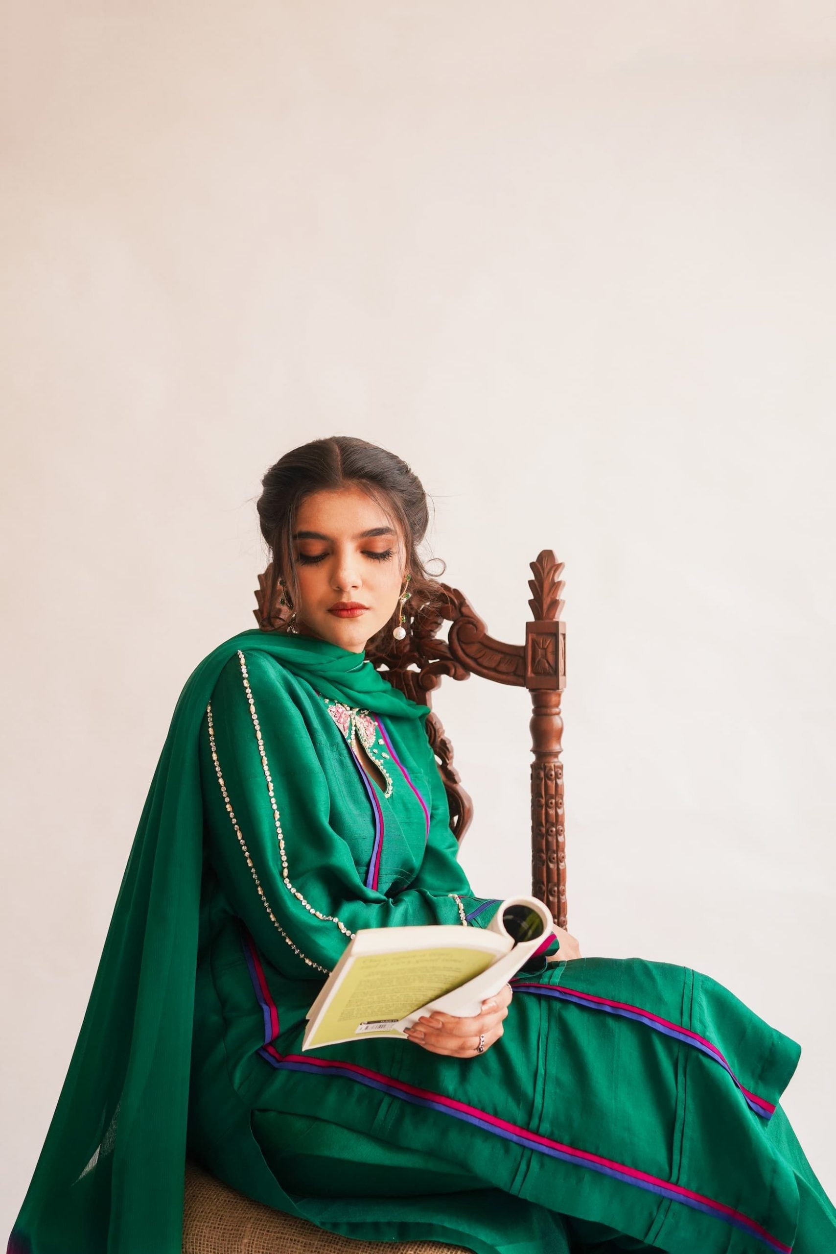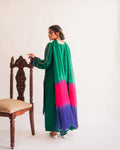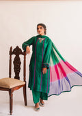 Arzu is a sublime outfit, portraying a deep, emerald shade with minimalistic pink and purple stripes to enrich this stunning look. The intricate pintuck detailed work around the neckline and sleeves add a touch of glamor to this simplistic ensemble that exudes grace and sophistication. The matching emerald trouser is the perfect companion piece that allow the brilliant chiffon dupatta and delicate shirt to shine.