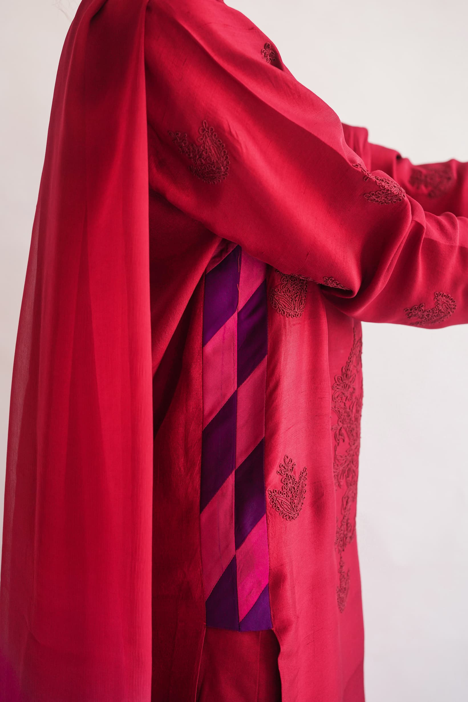 Ayanna is a vibrant, deep crimson set that emanates elegance and sophistication. Adorned with beautiful embellishments and an innovative, graceful neckline, the raw silk shirt is an exquisite tribute to modern style with a hint of a traditional trace. Paired with monochromatic trousers and a chiffon dupatta portraying a gradient of red, pink, and purple shades, this stunning set depicts a harmonious symphony of charm and glamor.