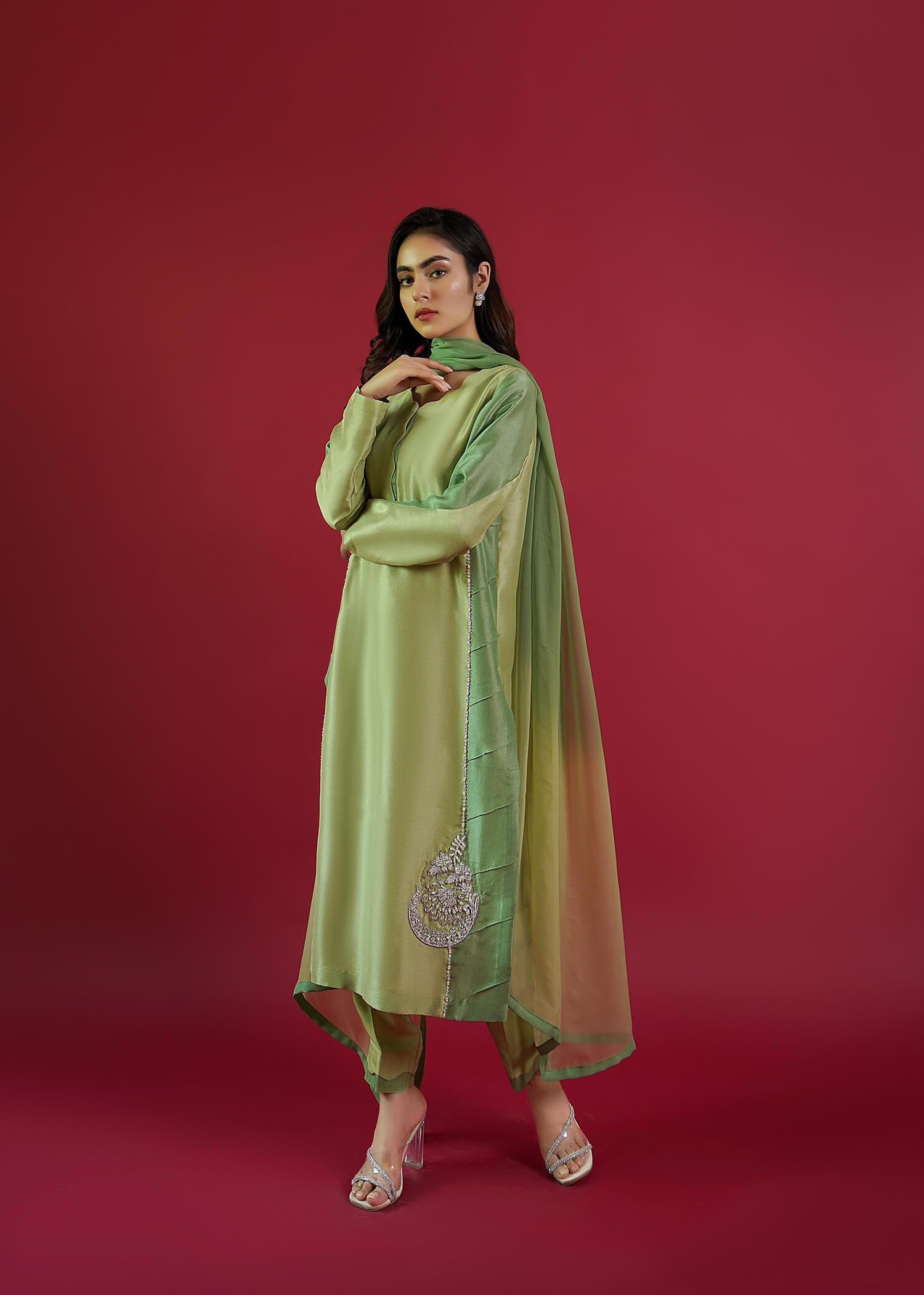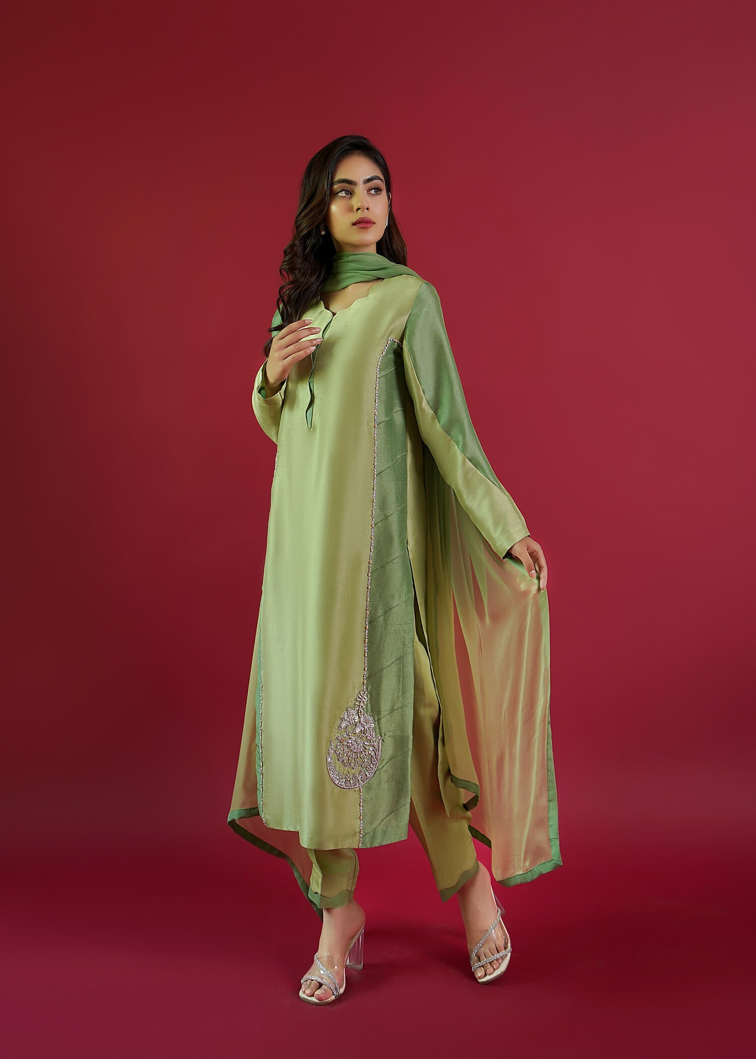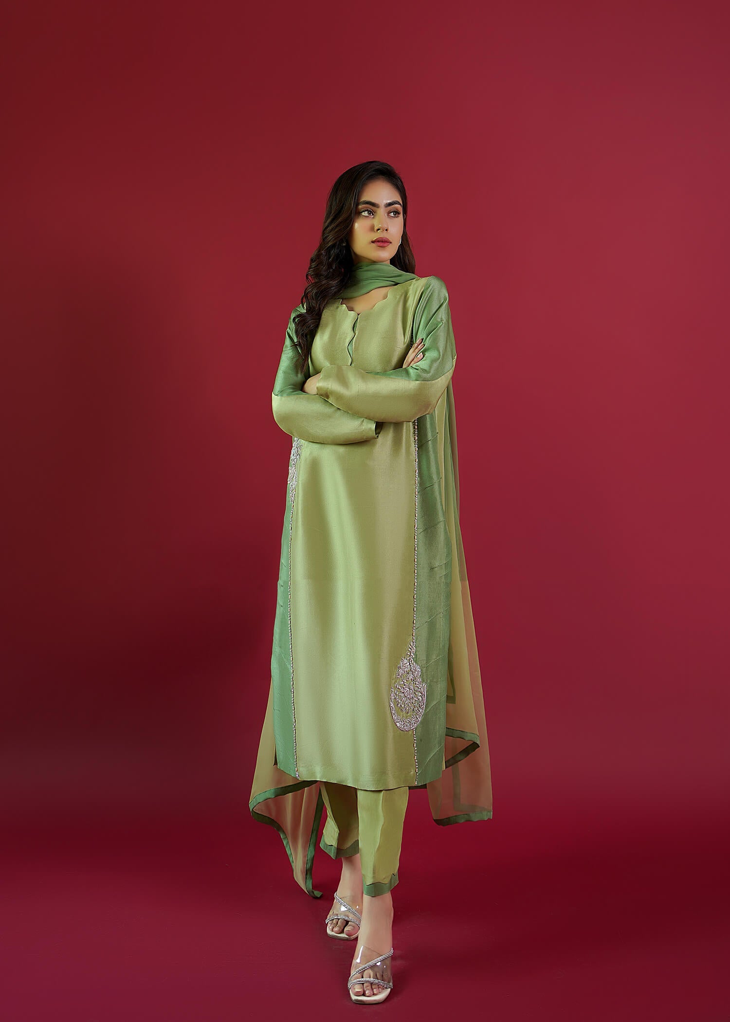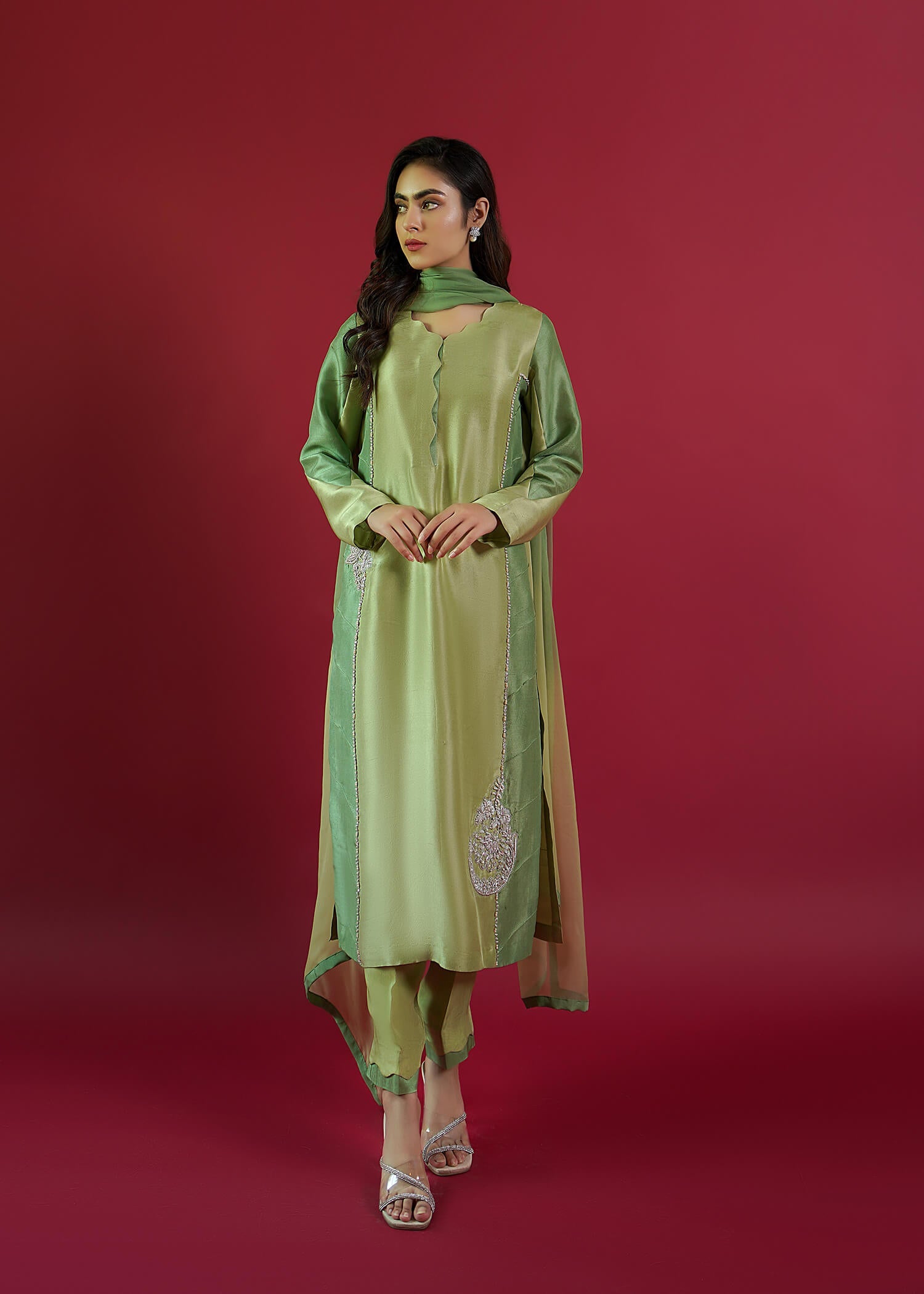 Ayra is an angelic and heavenly outfit pictured artistically on a raw silk canvas dipped in a mint-green hue ornamented with hand-embellished motifs and dark-toned panels exuding modern glamour. This refined look comes with a glorious two-tonal chiffon dupatta and a raw silk trouser making it an embodiment of elegance and eternity.