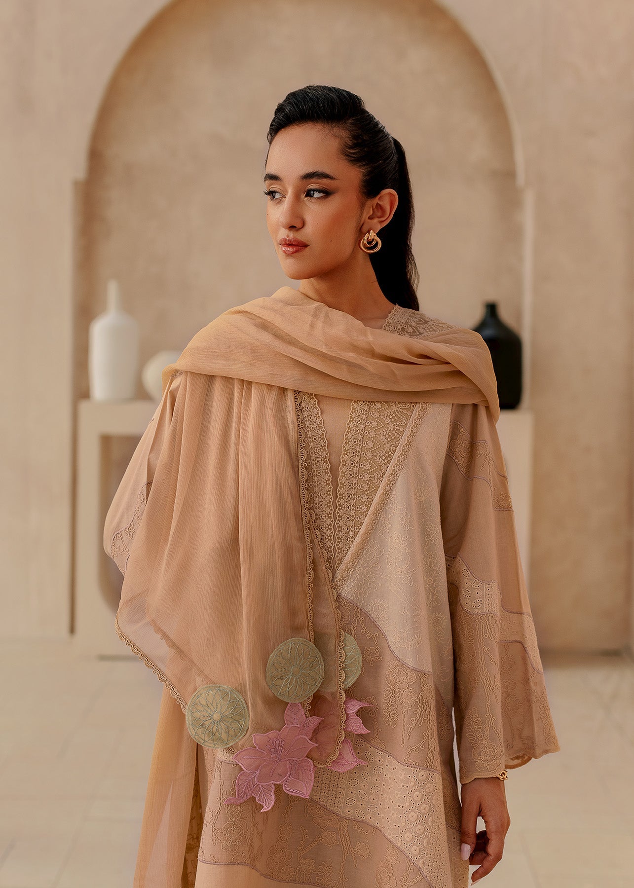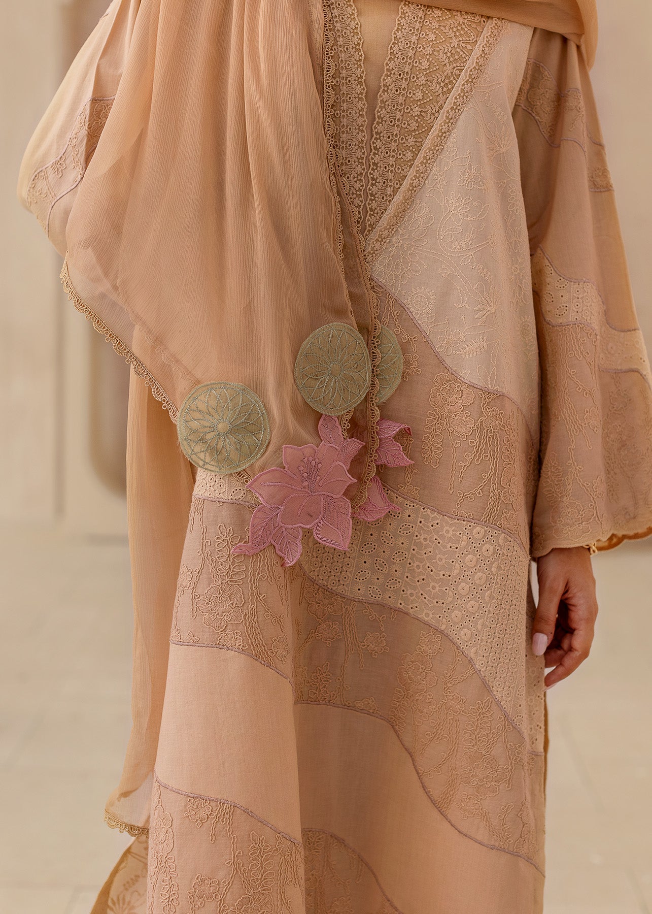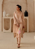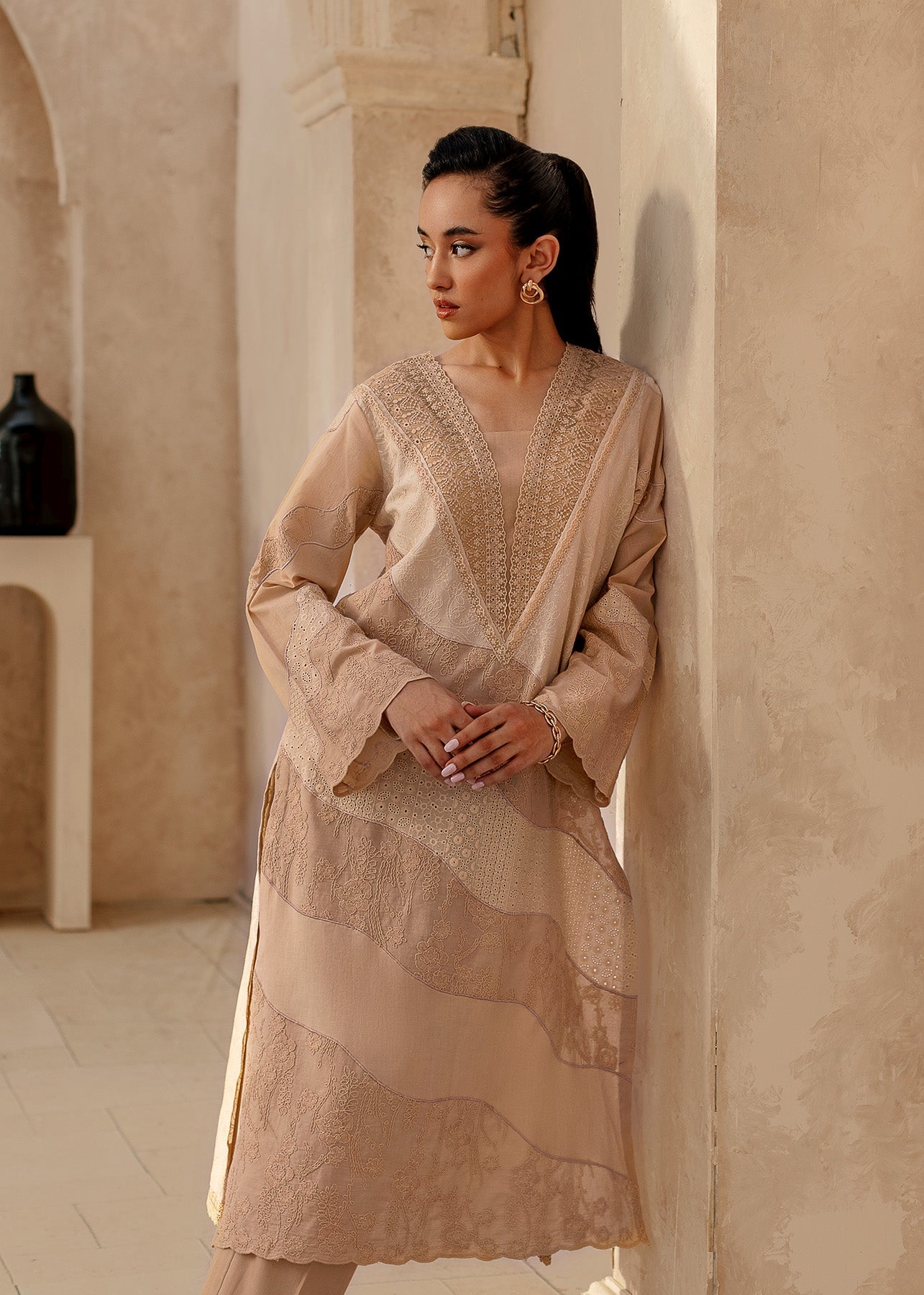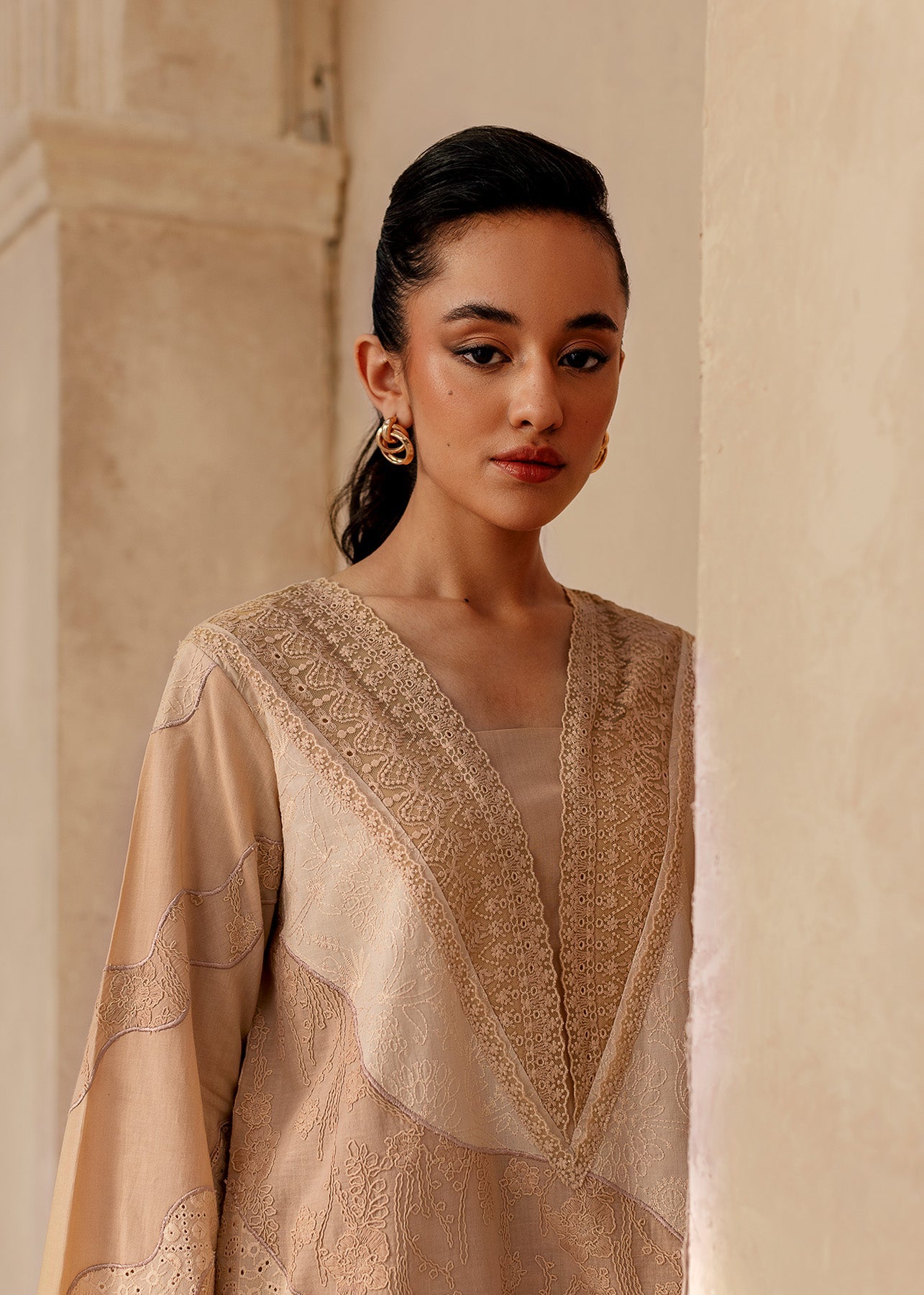 The Ayzel ensemble whispers sophistication in a palette of neutral tones. The shirt, in a unique combination of beige and skin color, creates a subtle and elegant base. Delicate lace embroidery in beige and brown adorns the V-neck, cascading down the shirt and sleeves for a touch of intricate detail. The look is completed with matching beige trousers, also featuring a touch of lace for a cohesive statement.