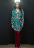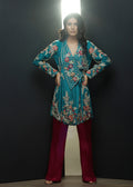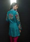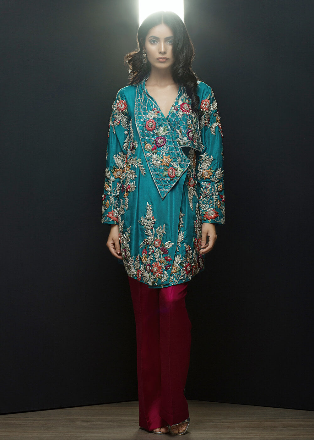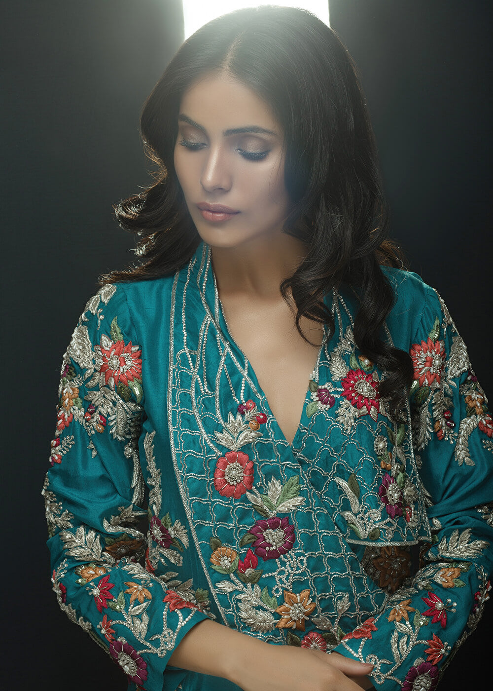 Blue Bells is a lustrous raw silk jacket with multi-coloured floral embroidery on the front and back. It is adorned with exquisite dori work and sequins along with striking coloured bell bottoms.