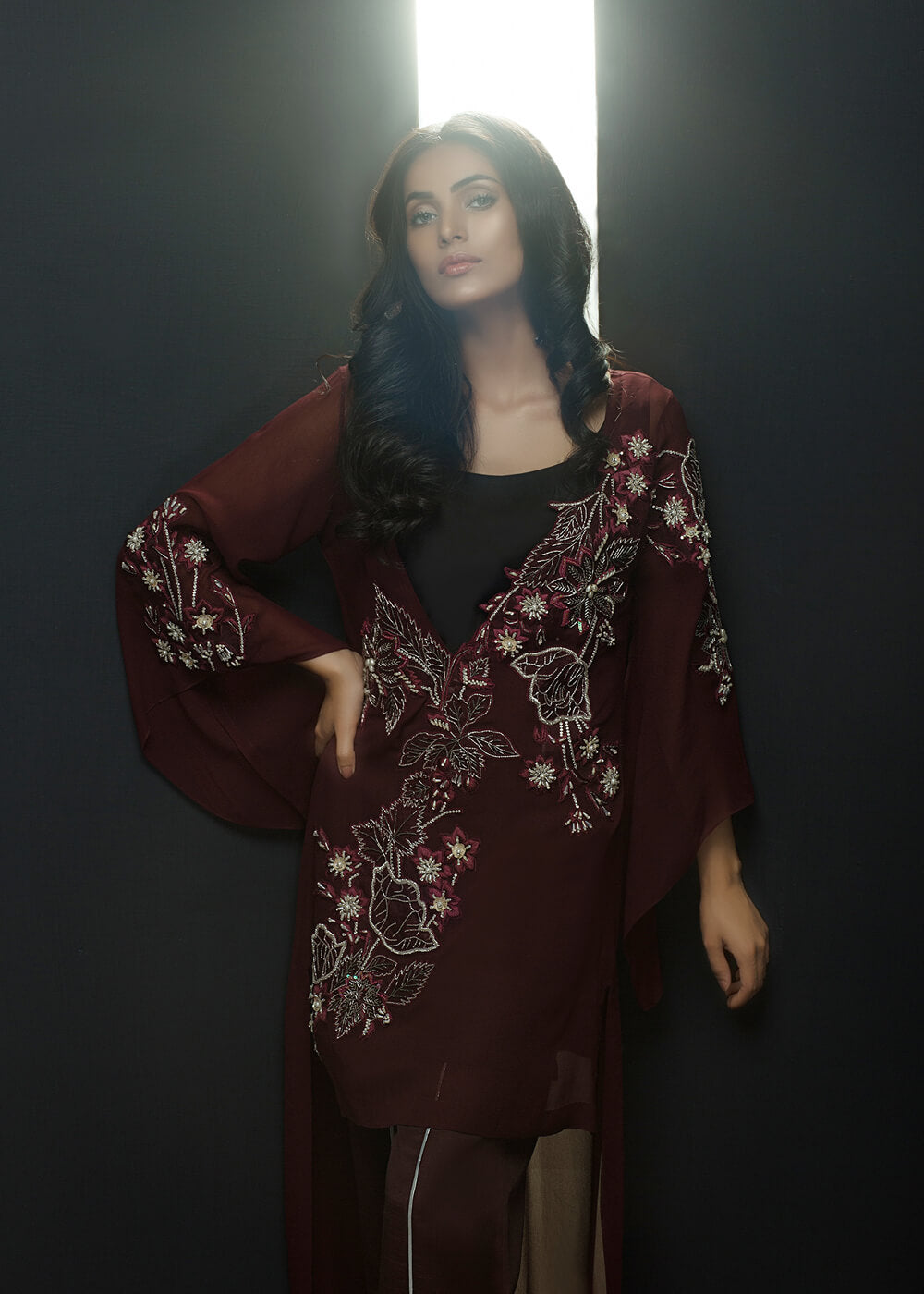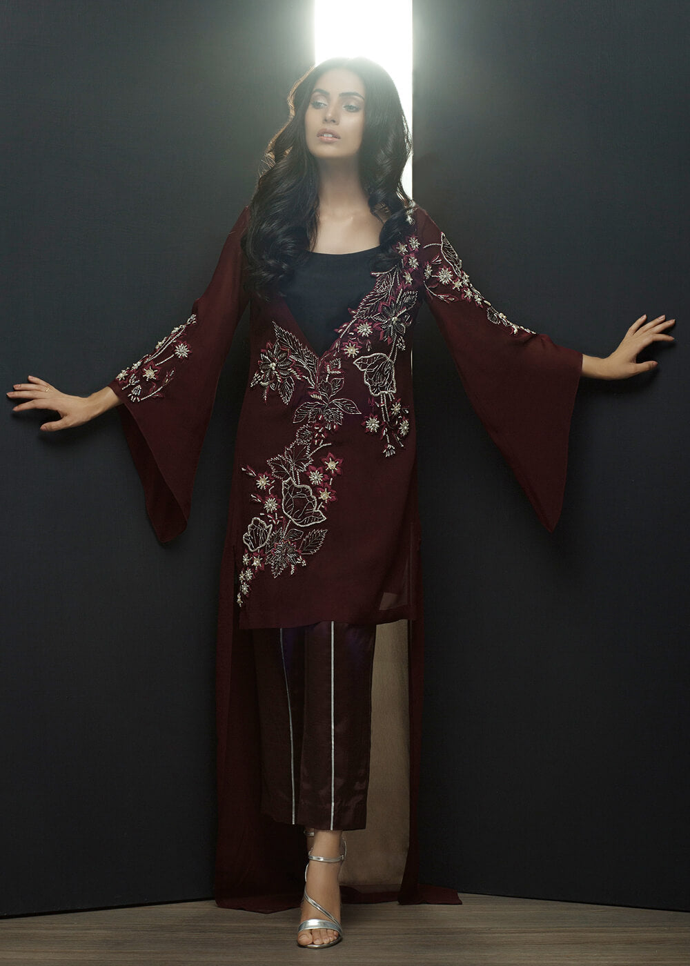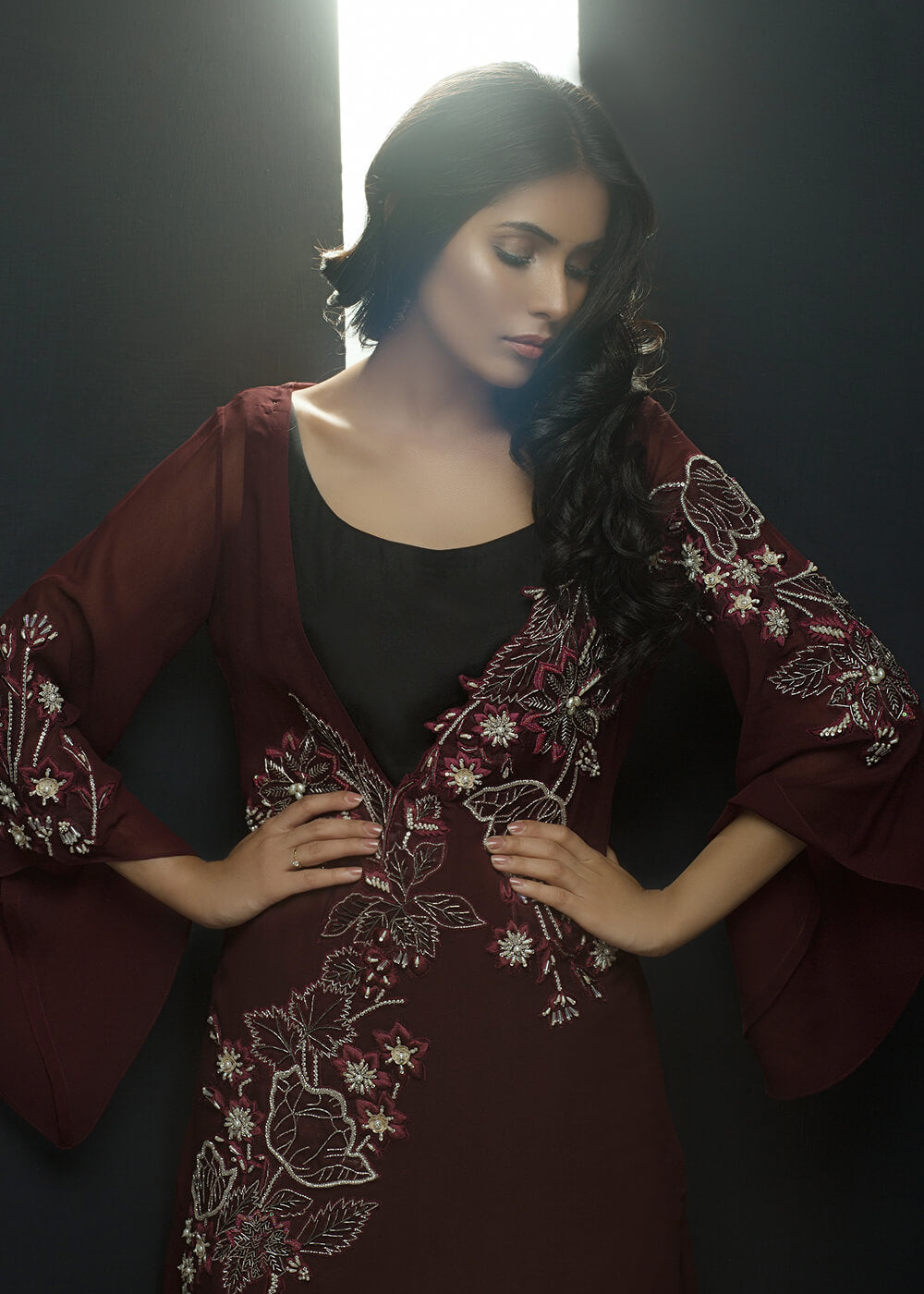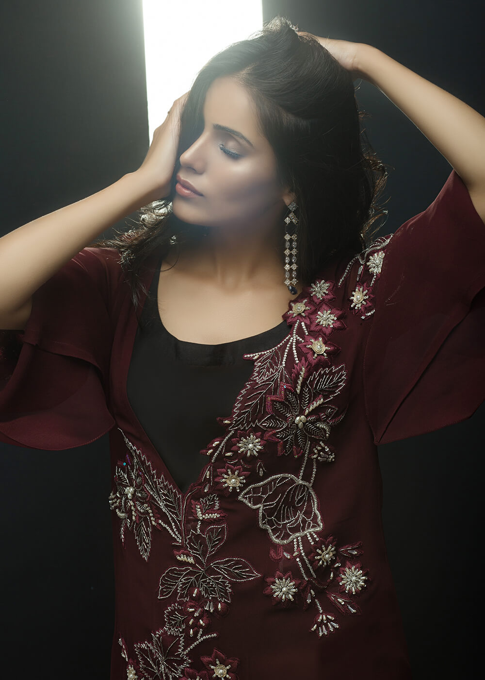 This Deep Maroon embroidered stylish shirt comes with crystals and pearls embedded in a large floral pattern. With a short front and floor length back, this dress is a top choice for all fashionistas