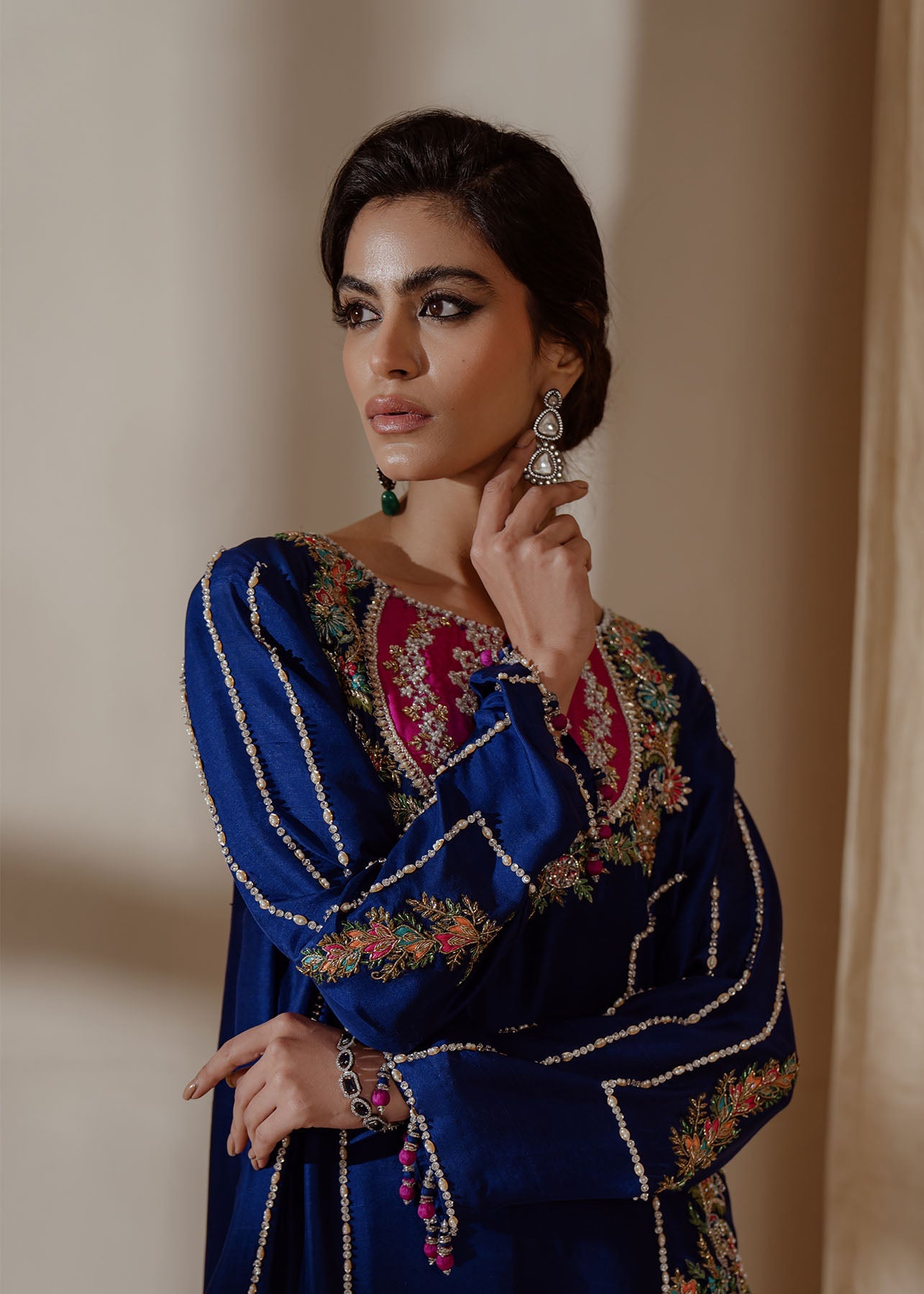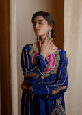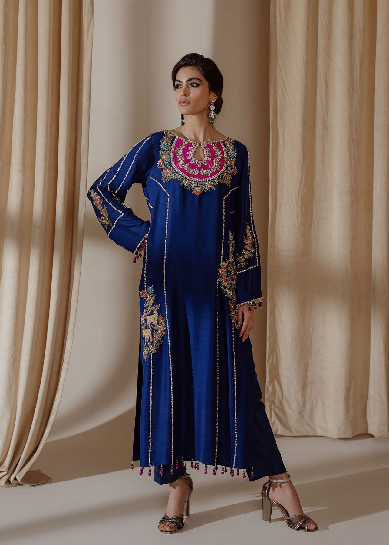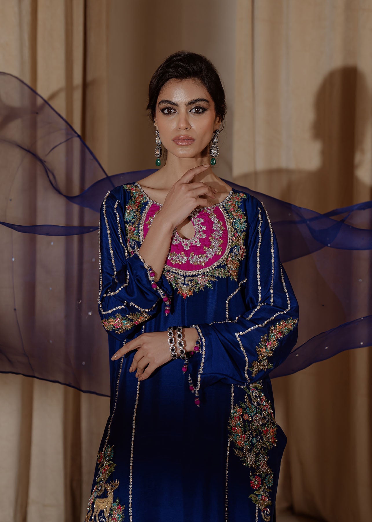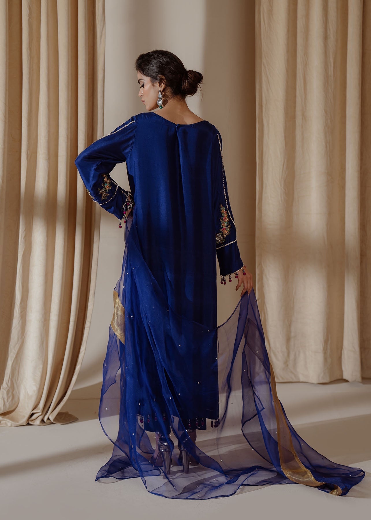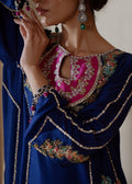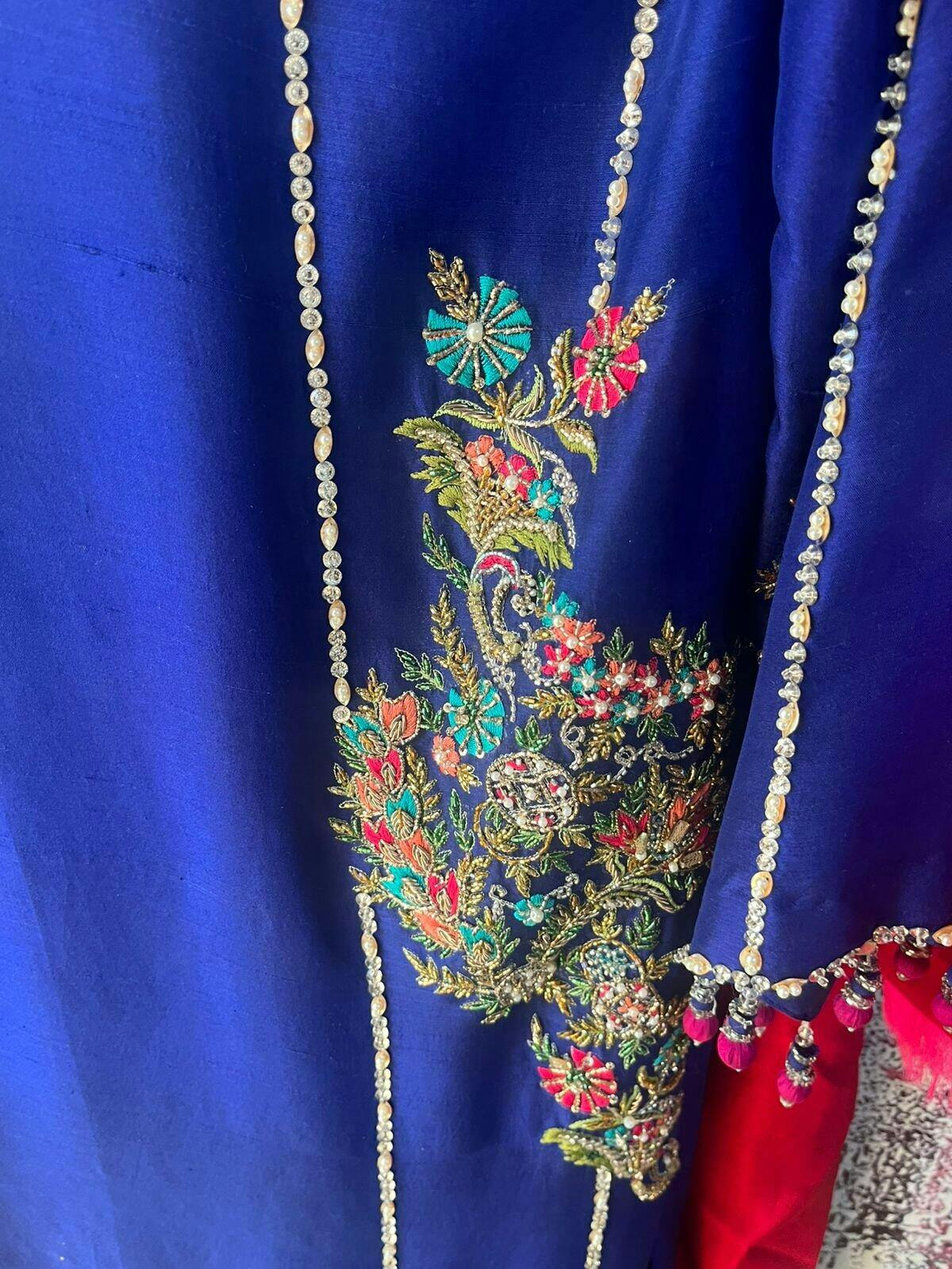 A traditional yet chic silhouette, this raw-silk shirt with with contrasting embroidery, featuring oriental motifs on neckline and sides, is styled with matching pants and organza duppata thus complementing the entire look.