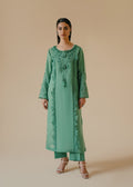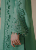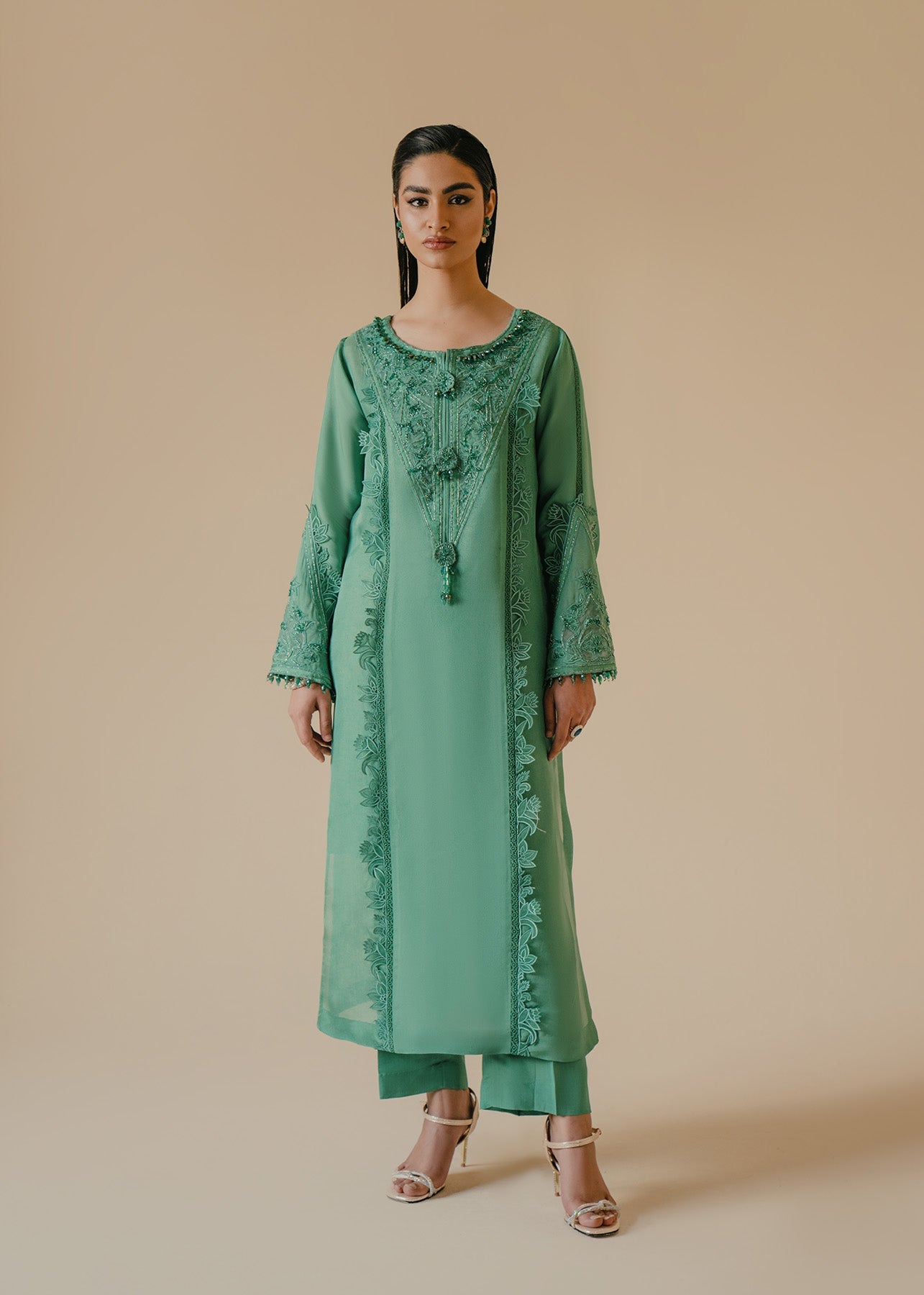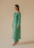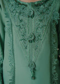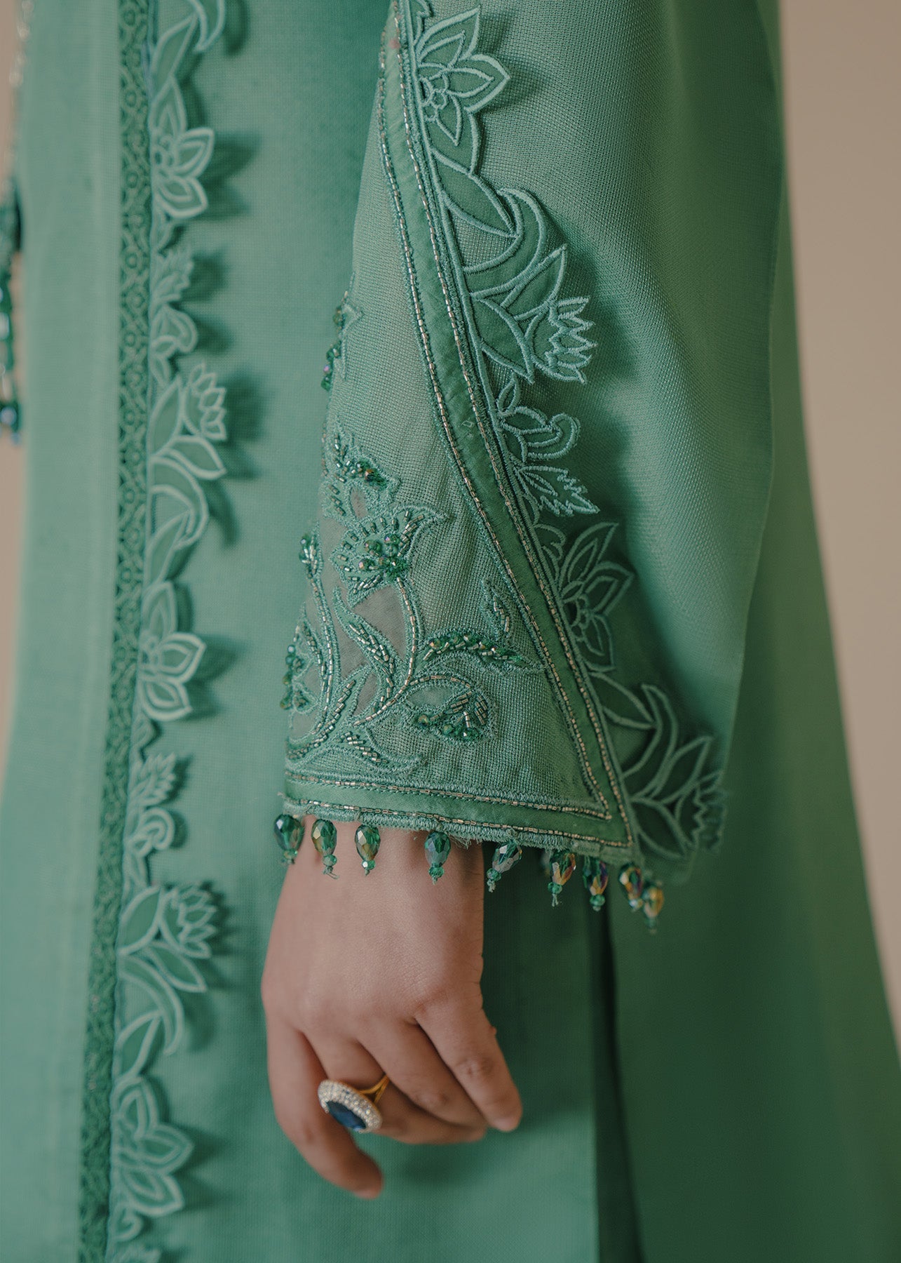 A breathtaking marvel in the enchanting shade of teal. Crafted from pure silk net, this exquisite dress features intricate patchwork and is complemented by a delicate organza dupatta. The highlight of the ensemble lies in its mesmerizing hand embroidery, adorned with intricate beadwork, gracing the sleeves, neckline, and shirt.