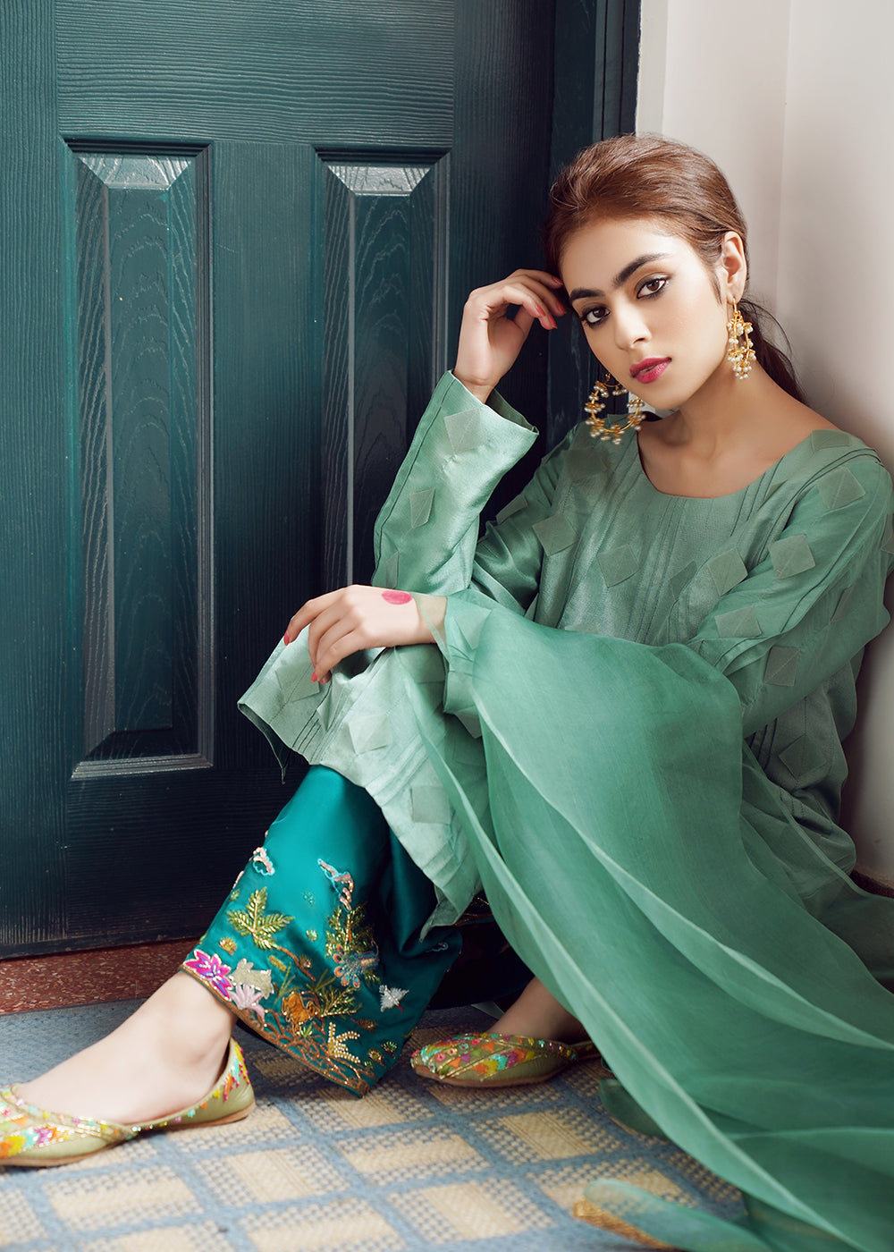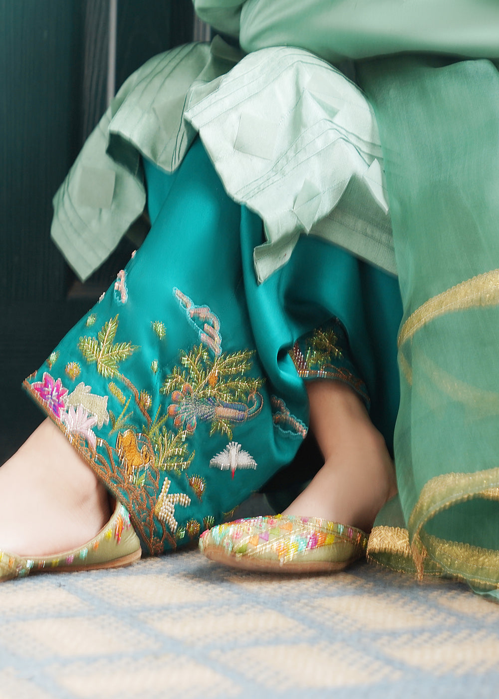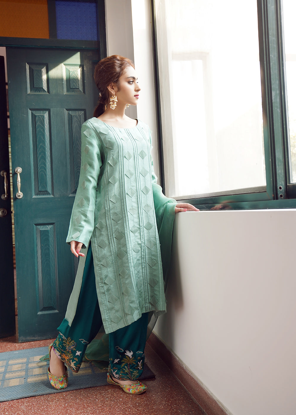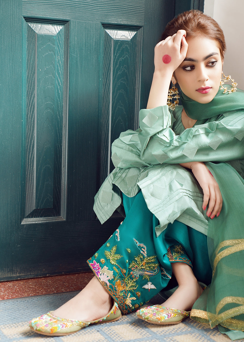 A sophisticated mint green canvas, layered with pintucks and organza patches in ‘Gulzaar’. Paired with beautiful delicately embroidered teal green shikargah pants and an organza dupatta, this elegant ensemble will take you through the festive season in style.
