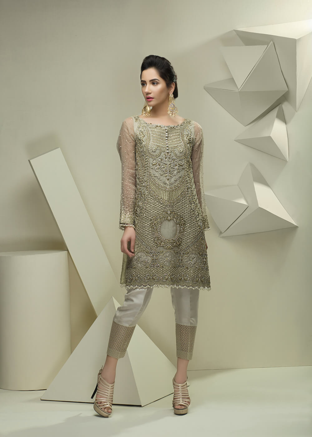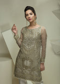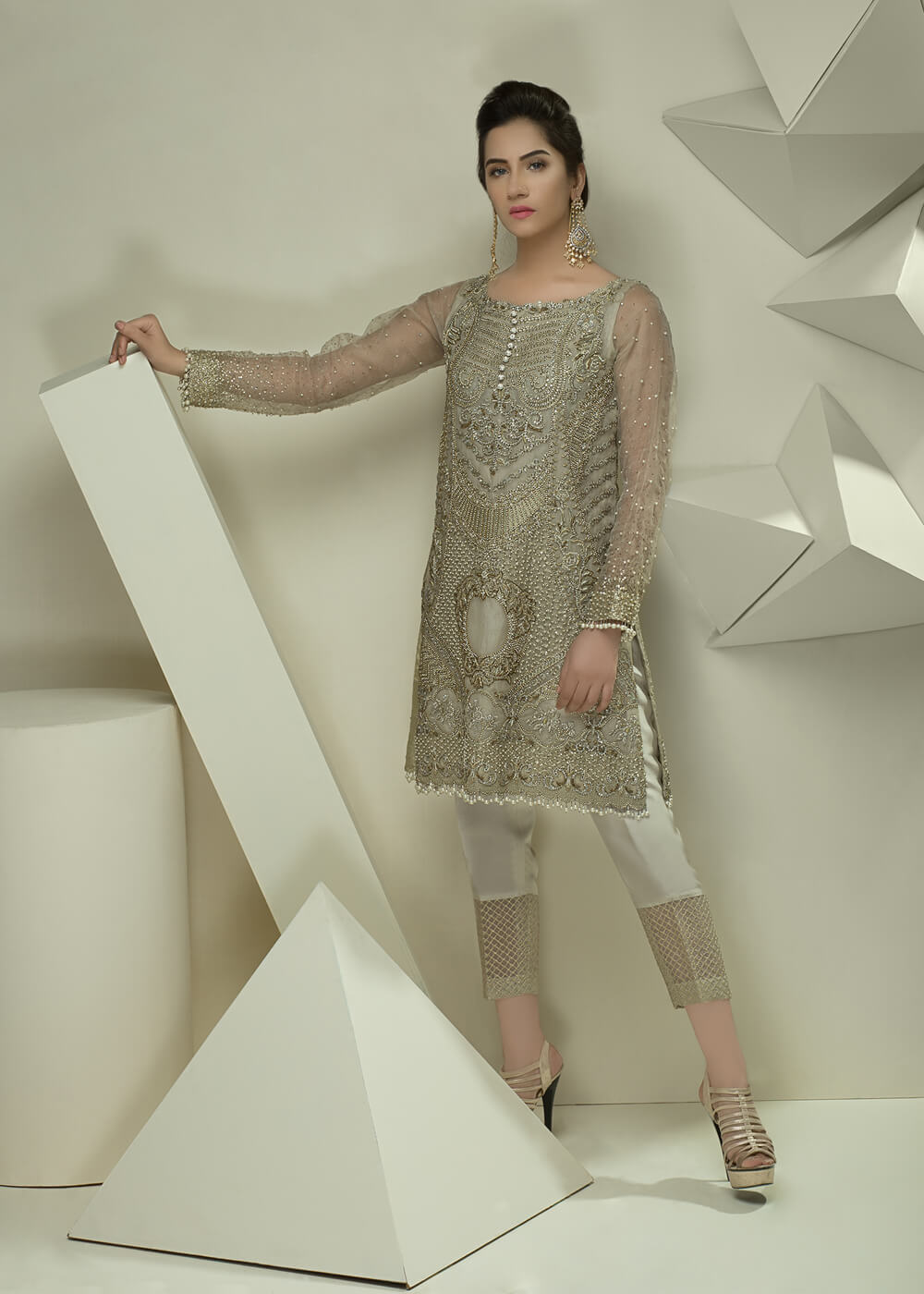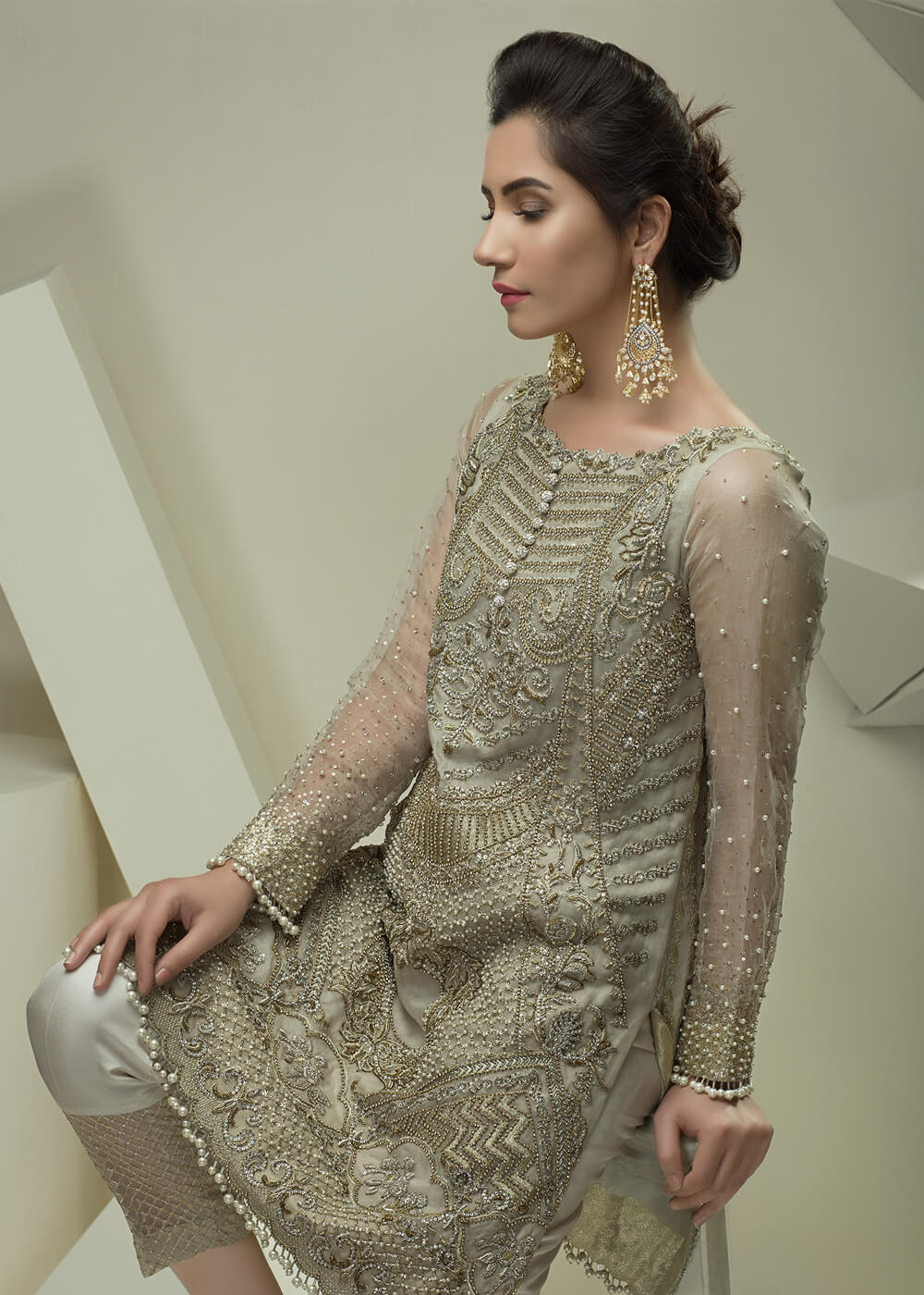Ivory Treasure is an ivory fully embroidered shirt with silver/golden resham and zardozi work. The sleeves and the back of the shirt have pearl chun all over them. The exquisite look is completed with silver bordered pants.