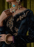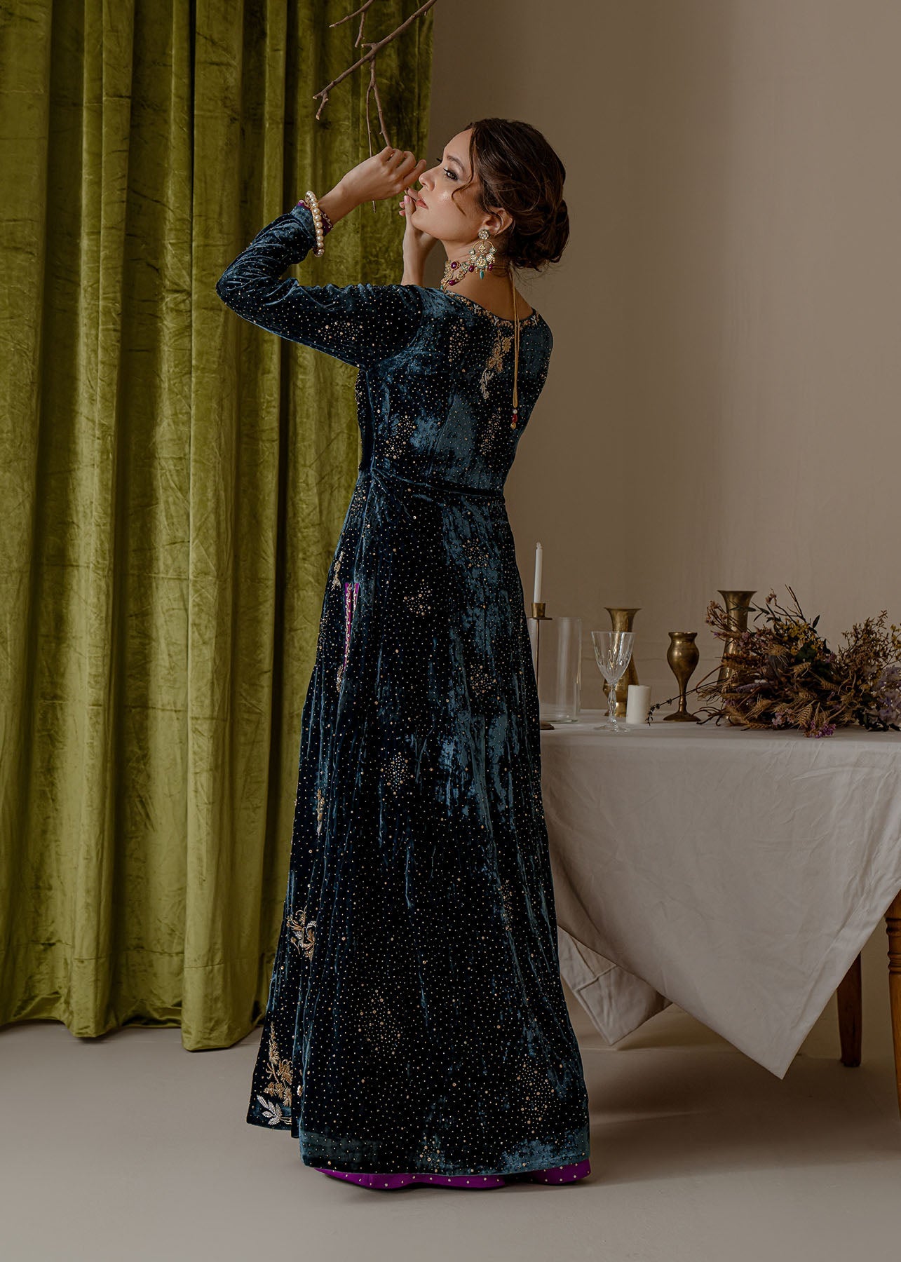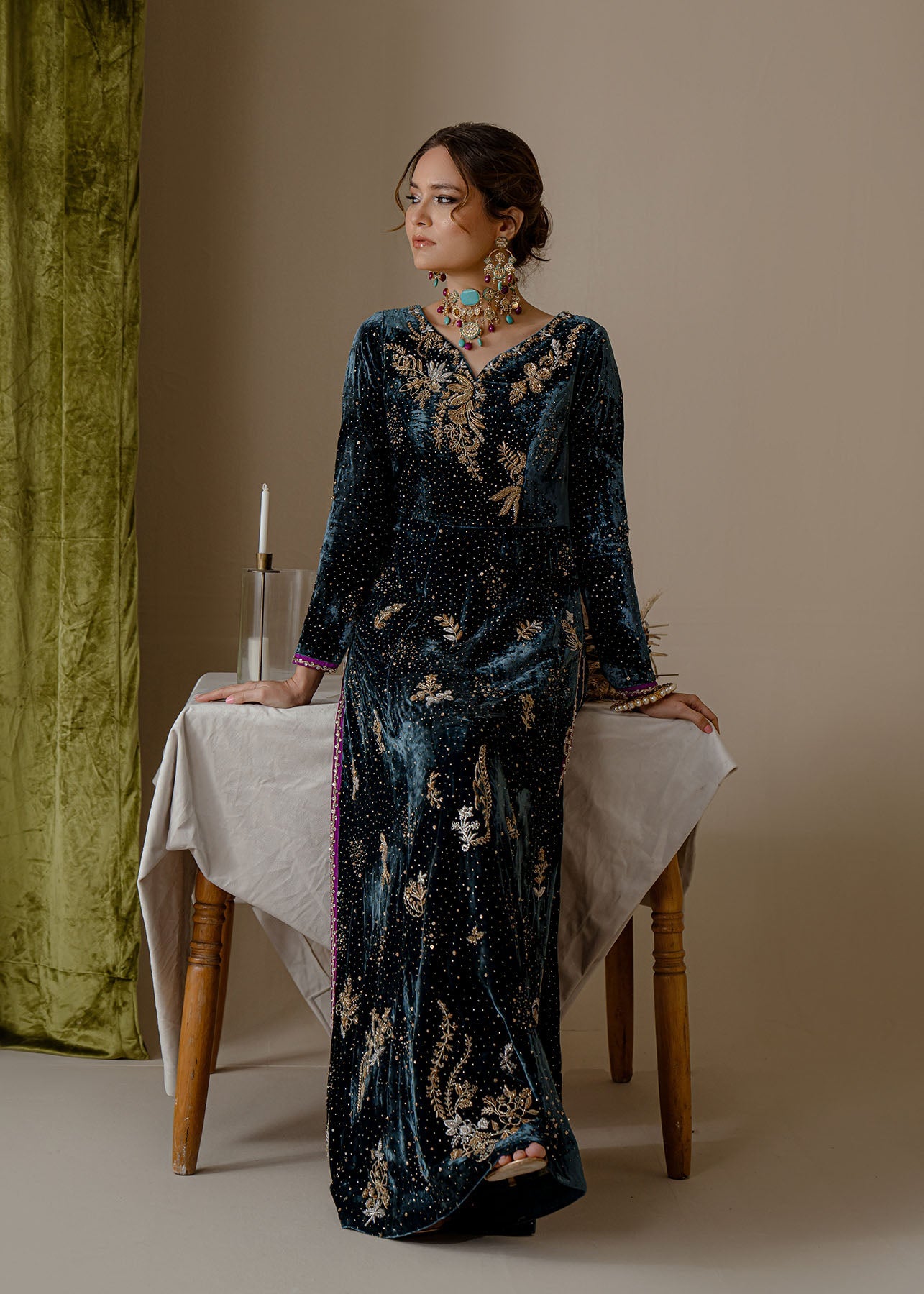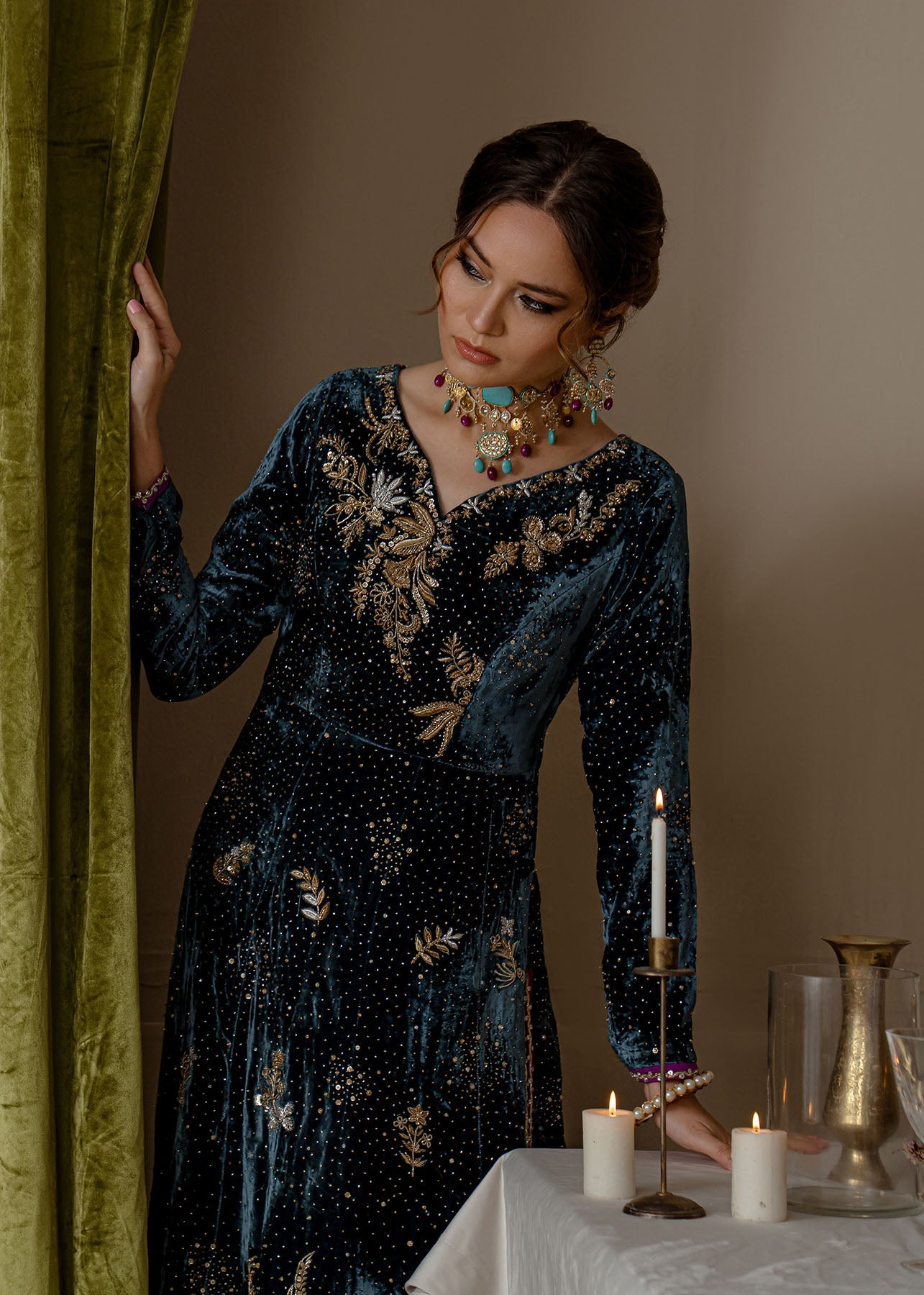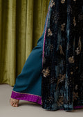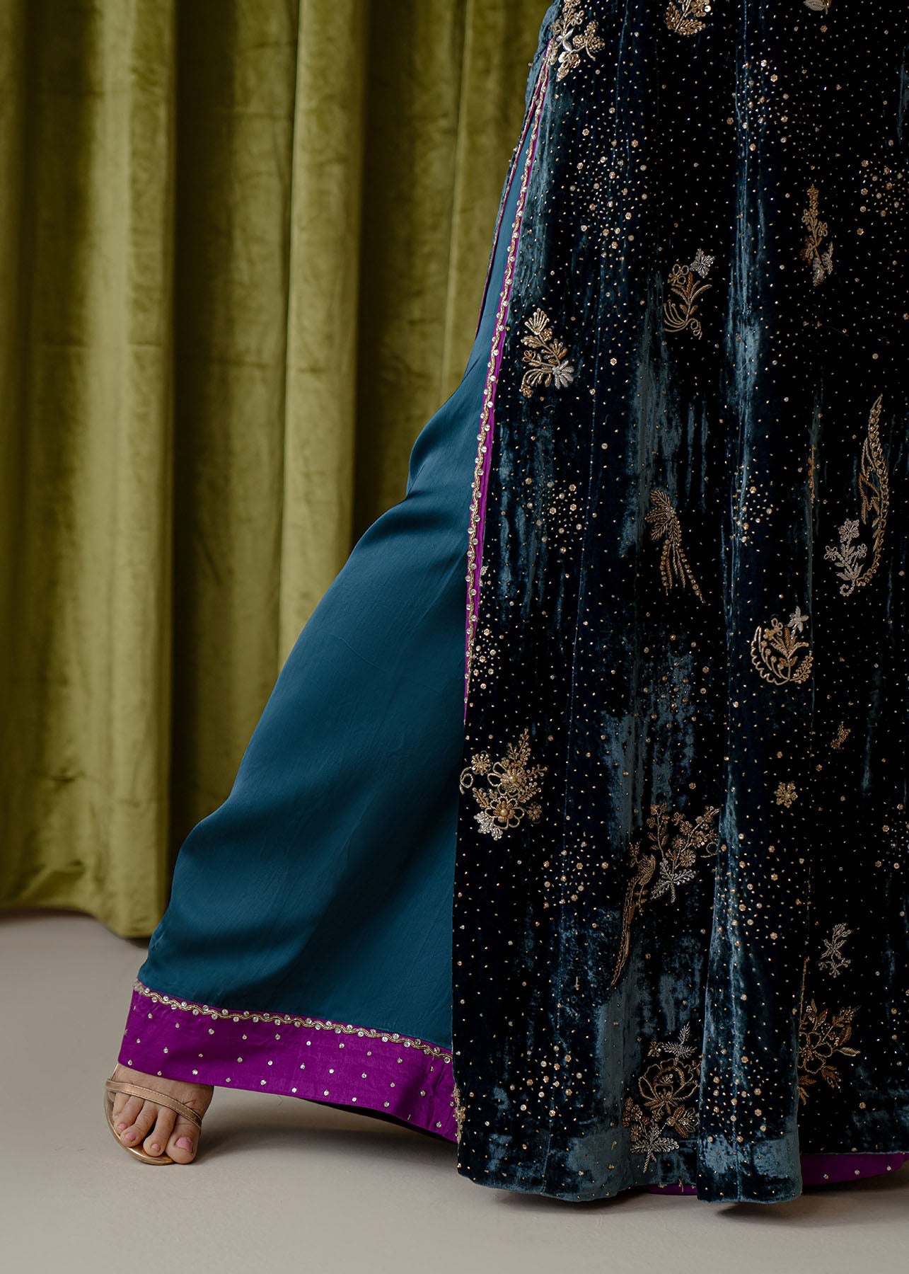 Embrace the spirit of this season's festivities with this long-flared velvet shirt rendered with delicate zardozi work. It is paired with embroidered silk trousers and a contrasting embroidered velvet dupatta finished with banarasi borders and gotta detailing.