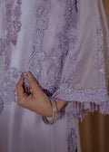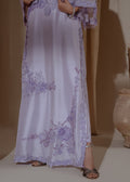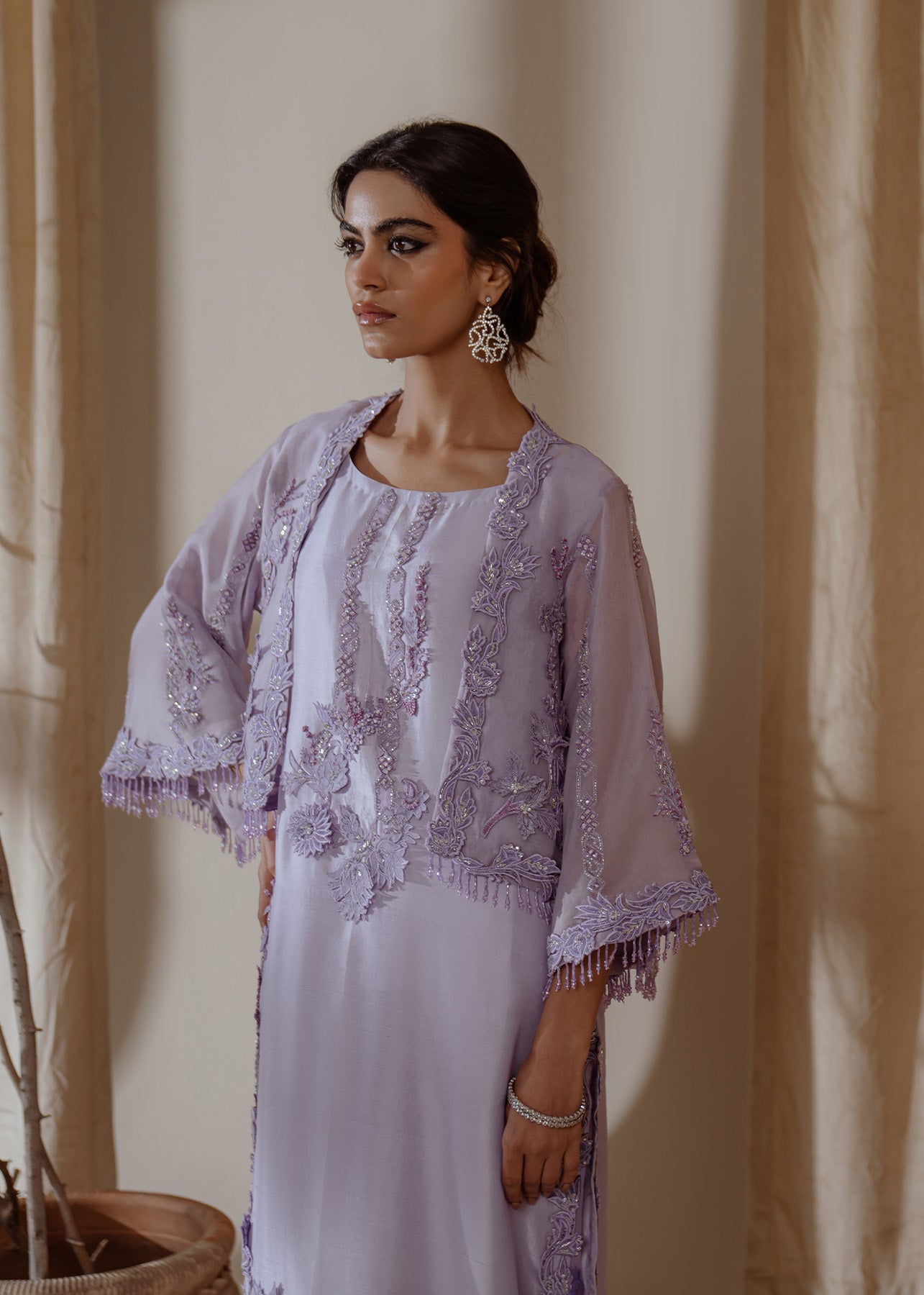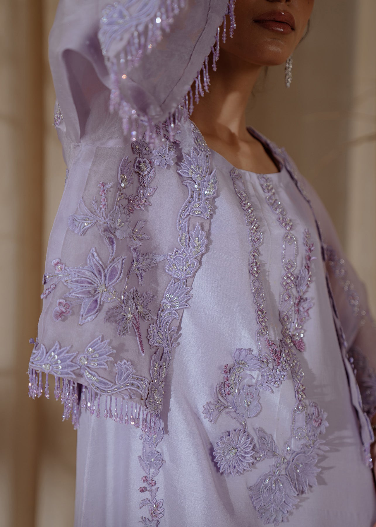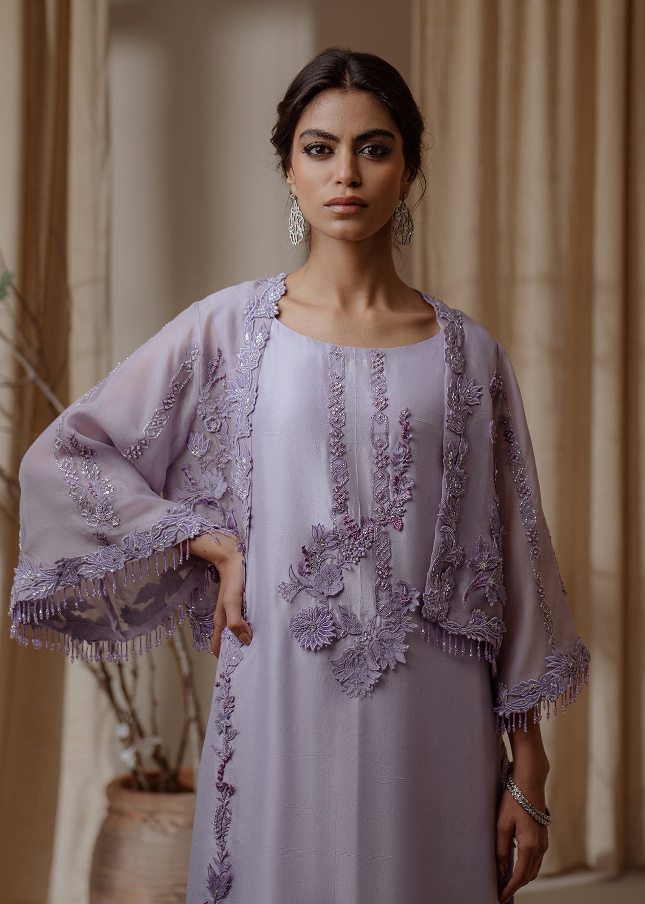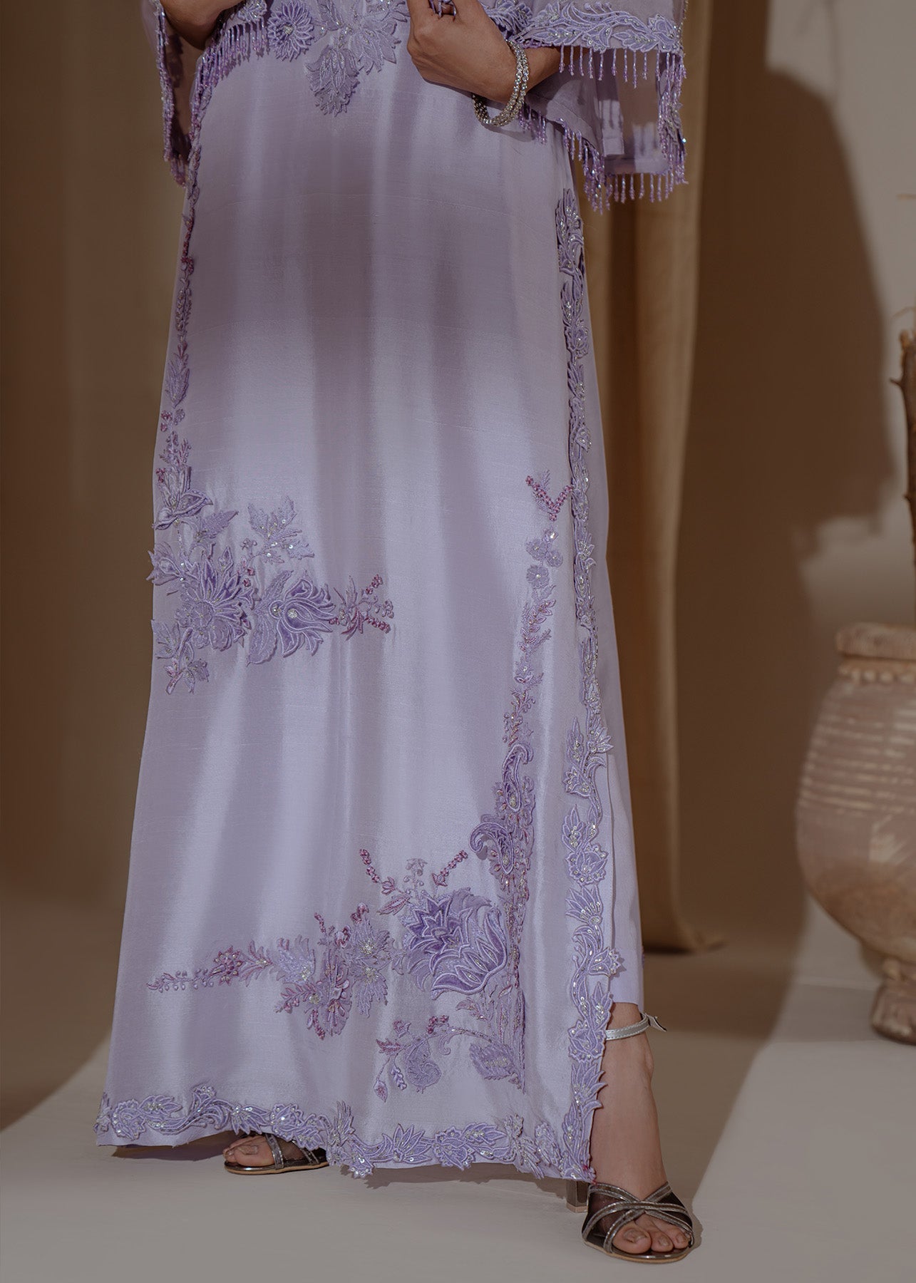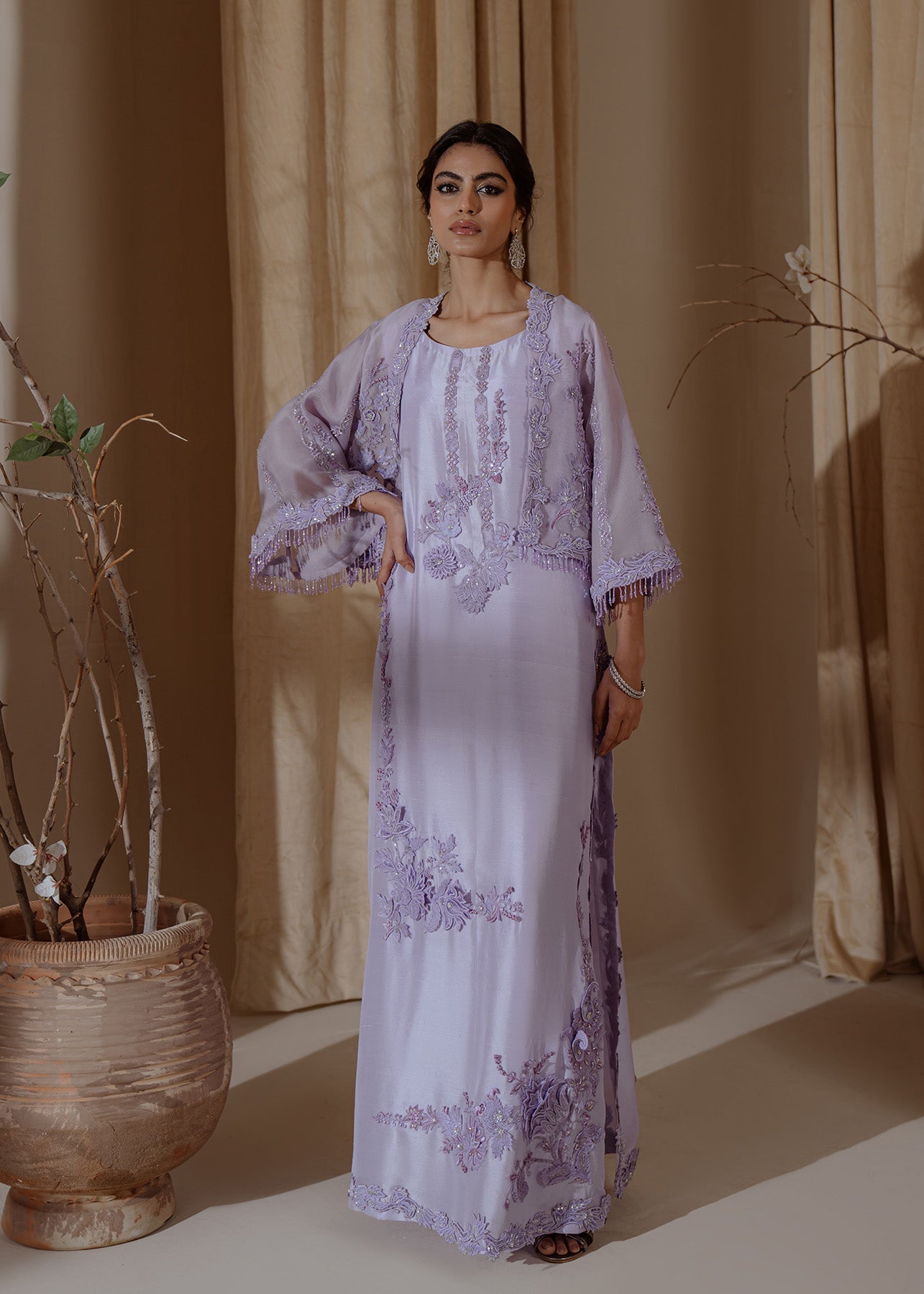 A contemporary take on a classic kaftan silhouette, cut from raw silk in an elegant shade of lilac. Silver embellishments over 3-D thread work floral motifs add a touch of uniqueness to the look, making it effortlessly classy. it is paired with beautiful organza jacket, with similar 3-D embroidery.