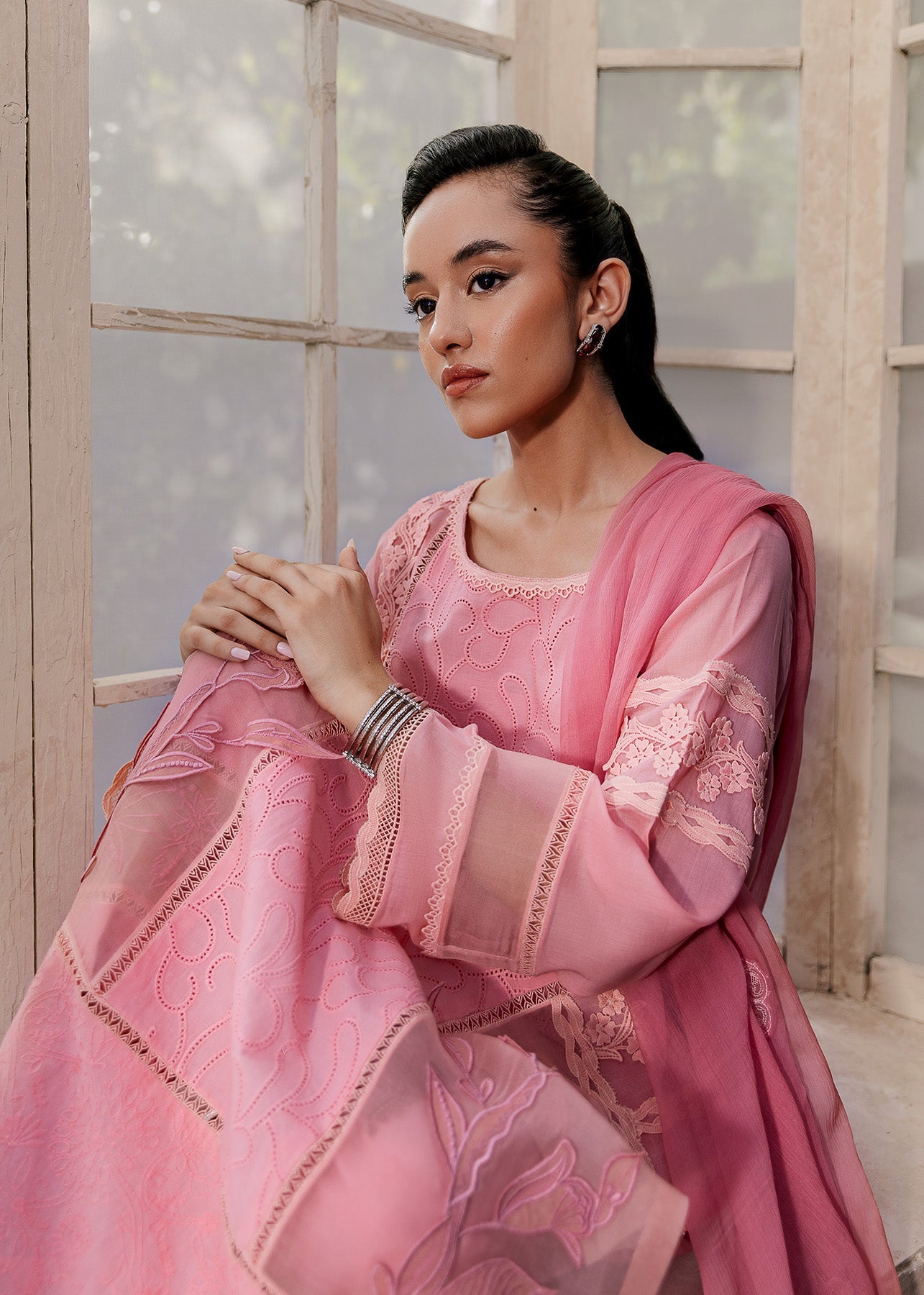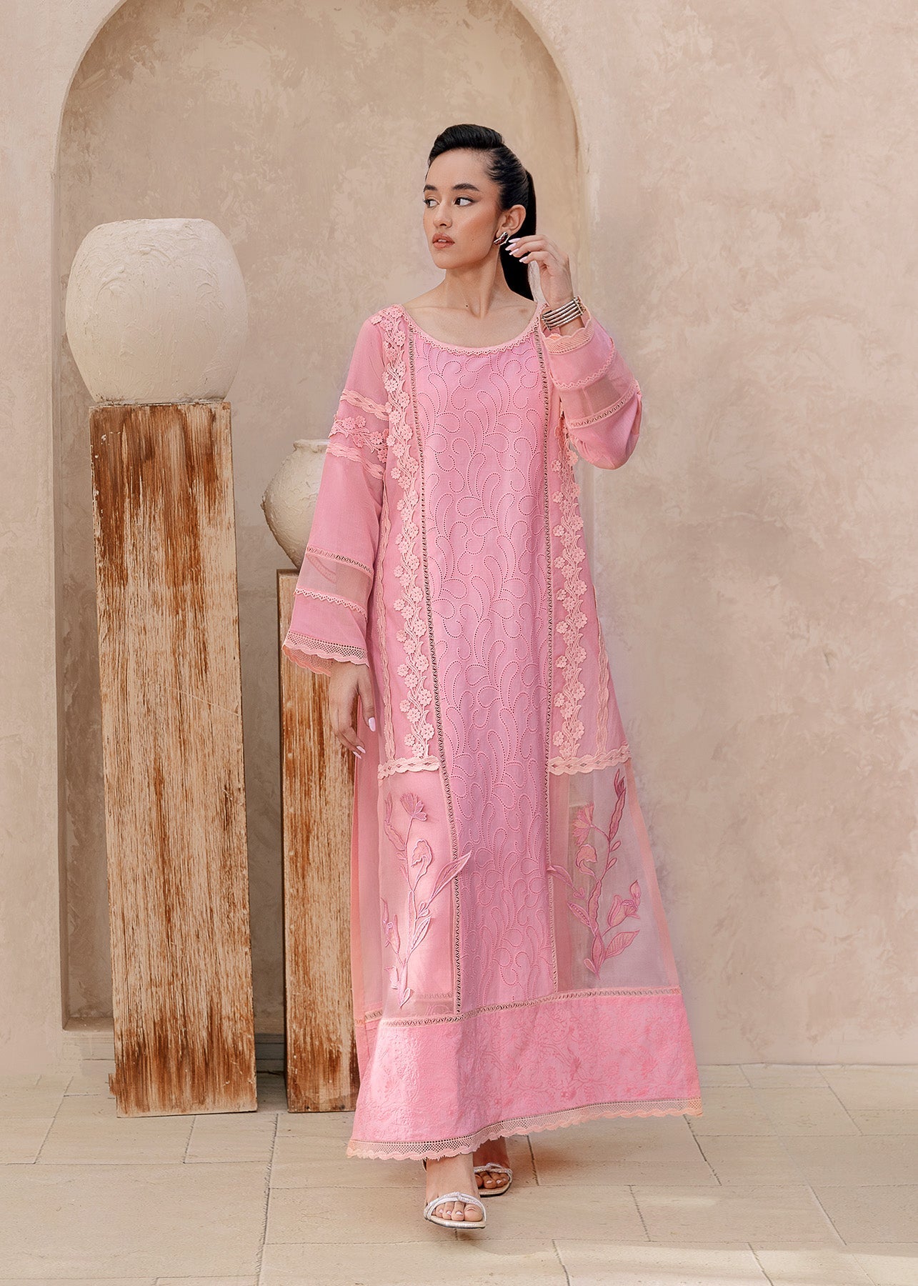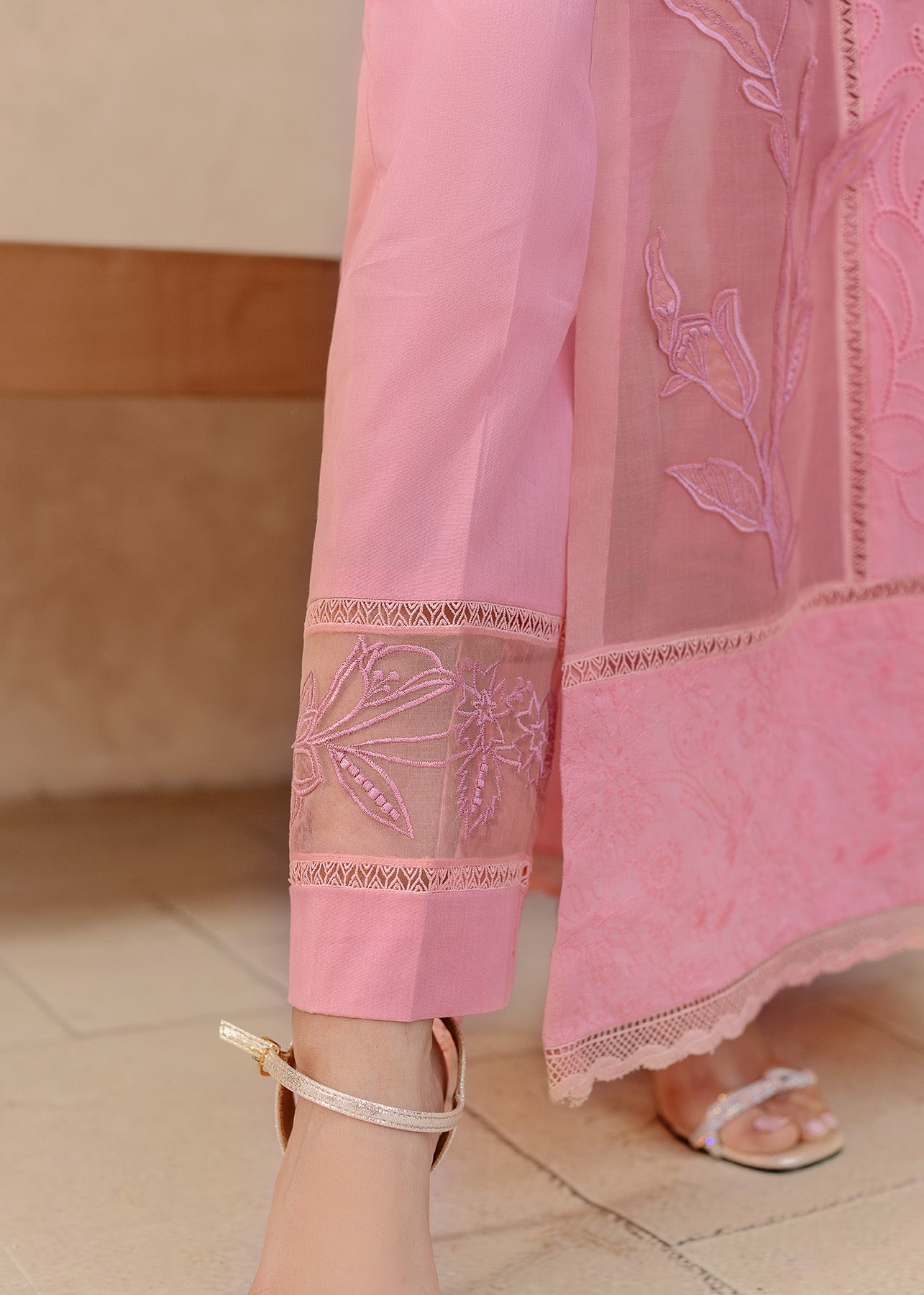 This light pink lawn creation features a charming chicken kari front panel, a traditional embroidery with intricate motifs. Adding a touch of elegance are organza panels gracefully flowing on either side. The playful touch comes in with embroidered floral laces adorning both the sleeves and the shirt itself.
