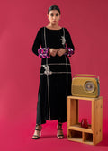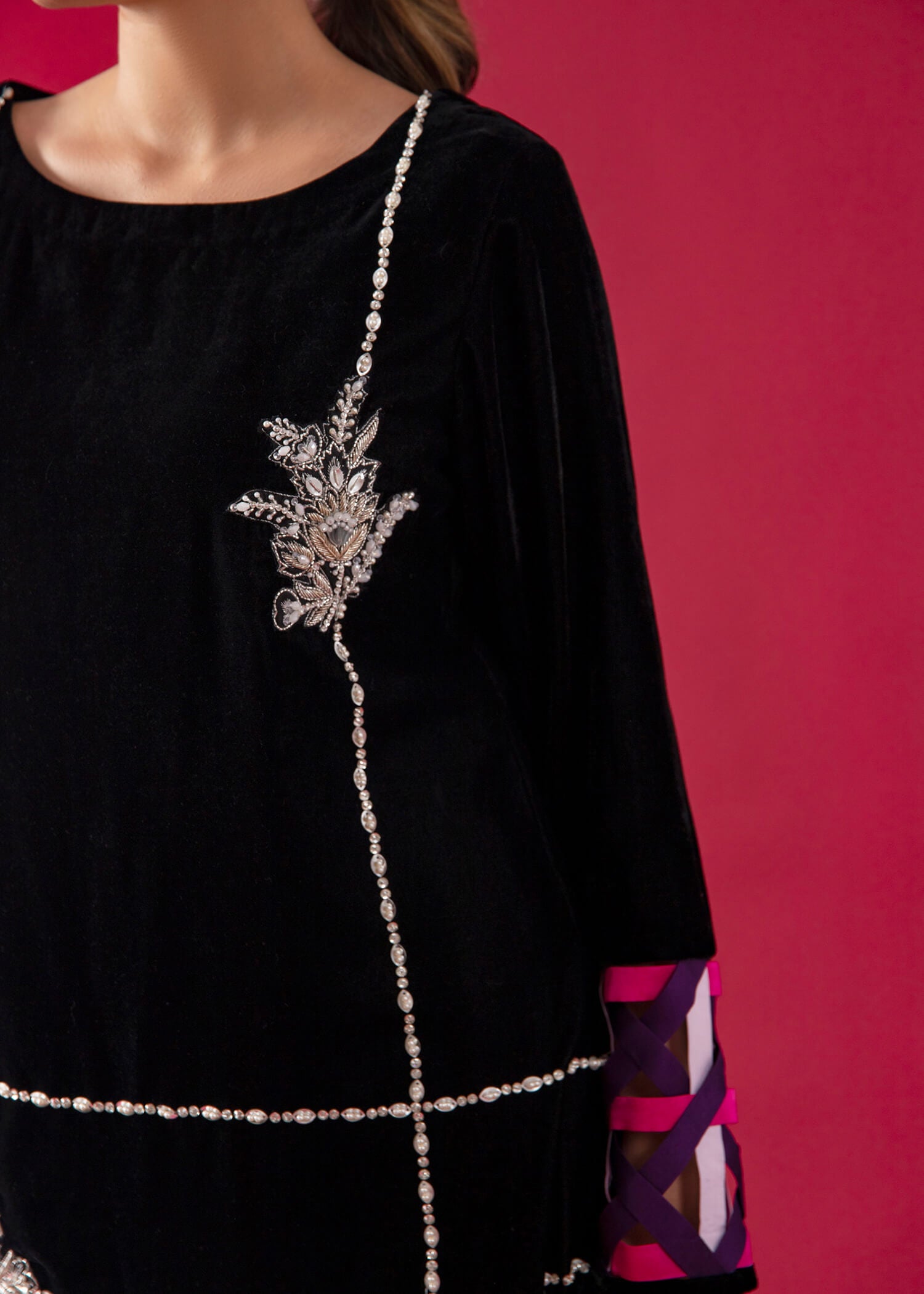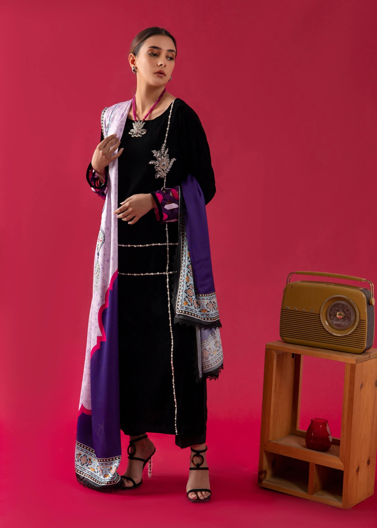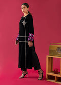 A glamourous black ensemble with contrasting printed chamose lilac dupatta. With intricate hand embroidery on shirt and stripped details on sleeves, the velvet shirt is paired with lustrous viscose silk pants. Mahsa is an ultimate choice for all the festivities of this wintery season!