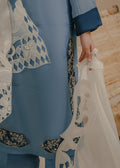 A captivating ensemble in the serene hue of cerulean blue. Crafted from pure silk net, this exquisite dress showcases meticulous hand embroidery on contrasting patches, featuring delicate cutwork for added allure, paired elegantly with plain pants.