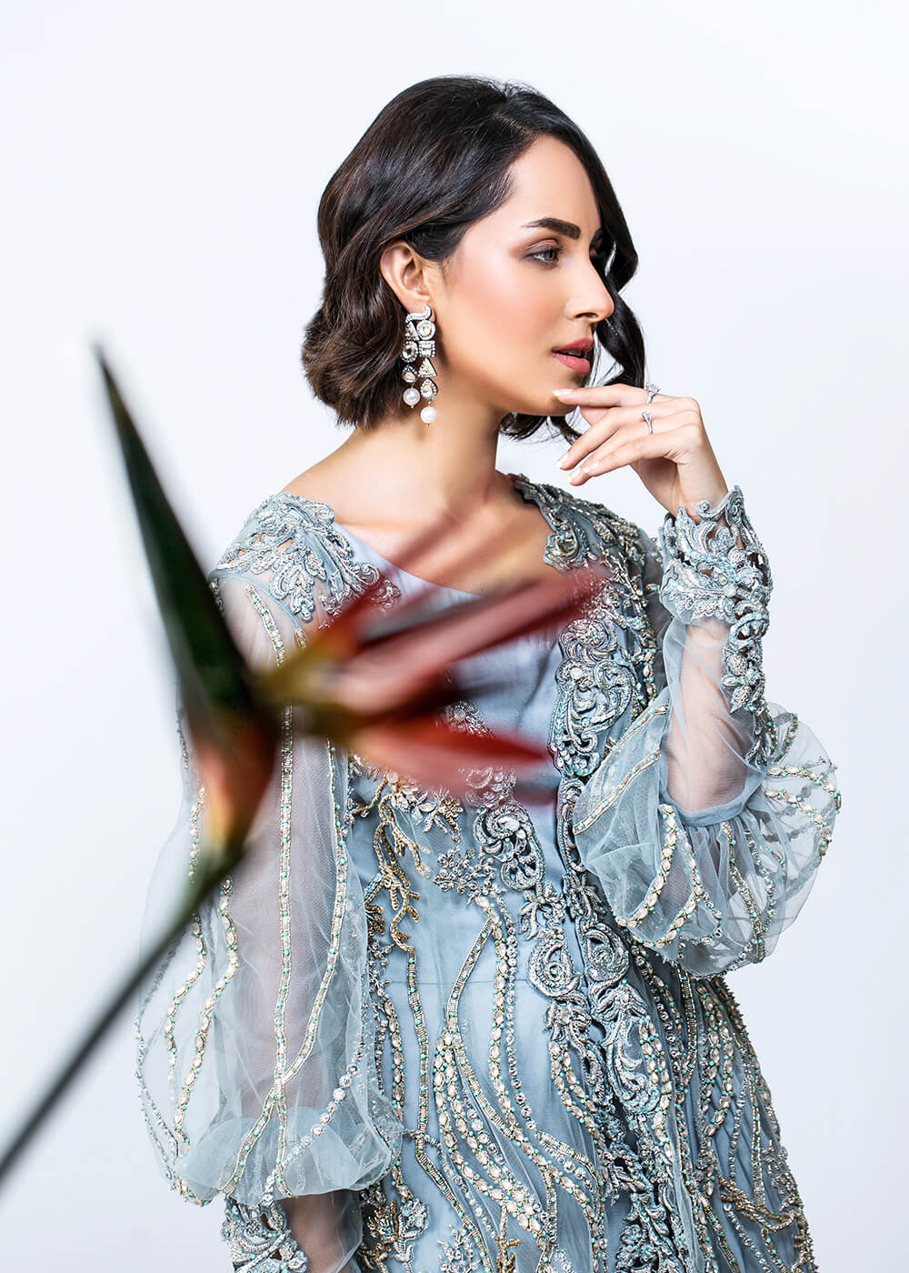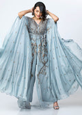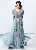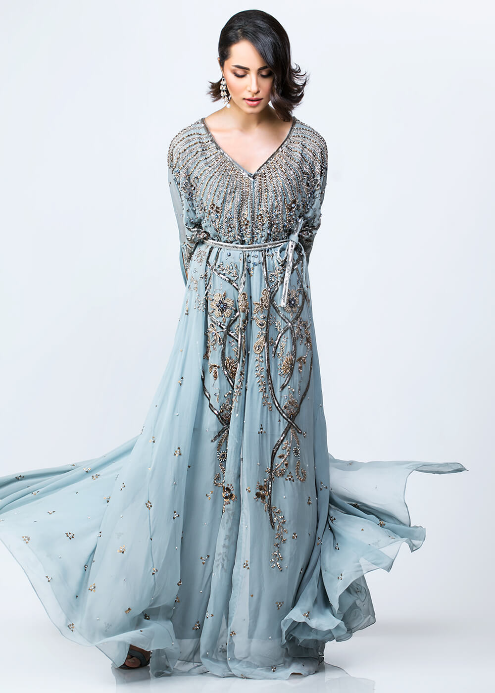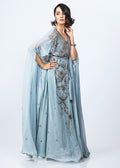 Extravagantly adorned with embroidery & gleaming sequence, this floor length cape paired with an elegant belt is the most exquisite ensemble of our Nirvana Collection. Copper floral patterns made out of crystals, precious stones and sequins, this haute design defines flamboyant grace & elegance.
