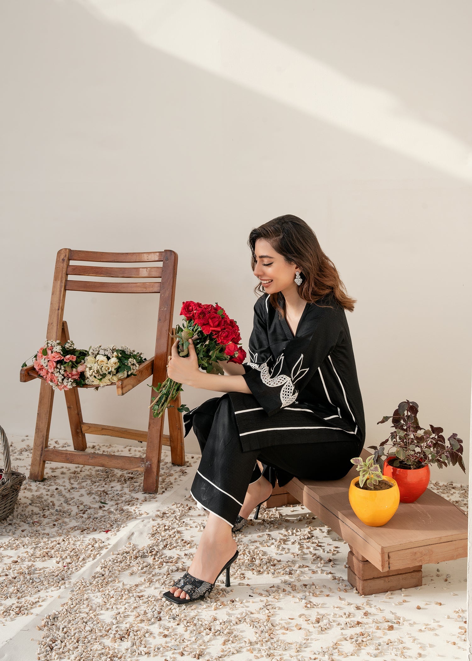 The Black color on the lawn shirt is enhanced with bold and edgy embroidery on the sleeves, creating a striking visual contrast against the black fabric, making it stand out.