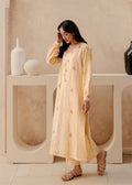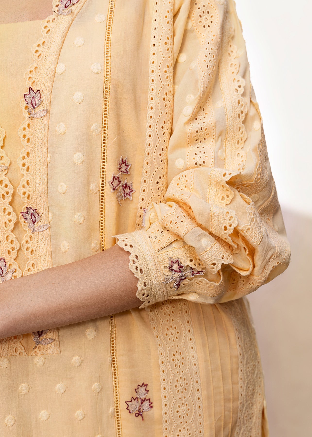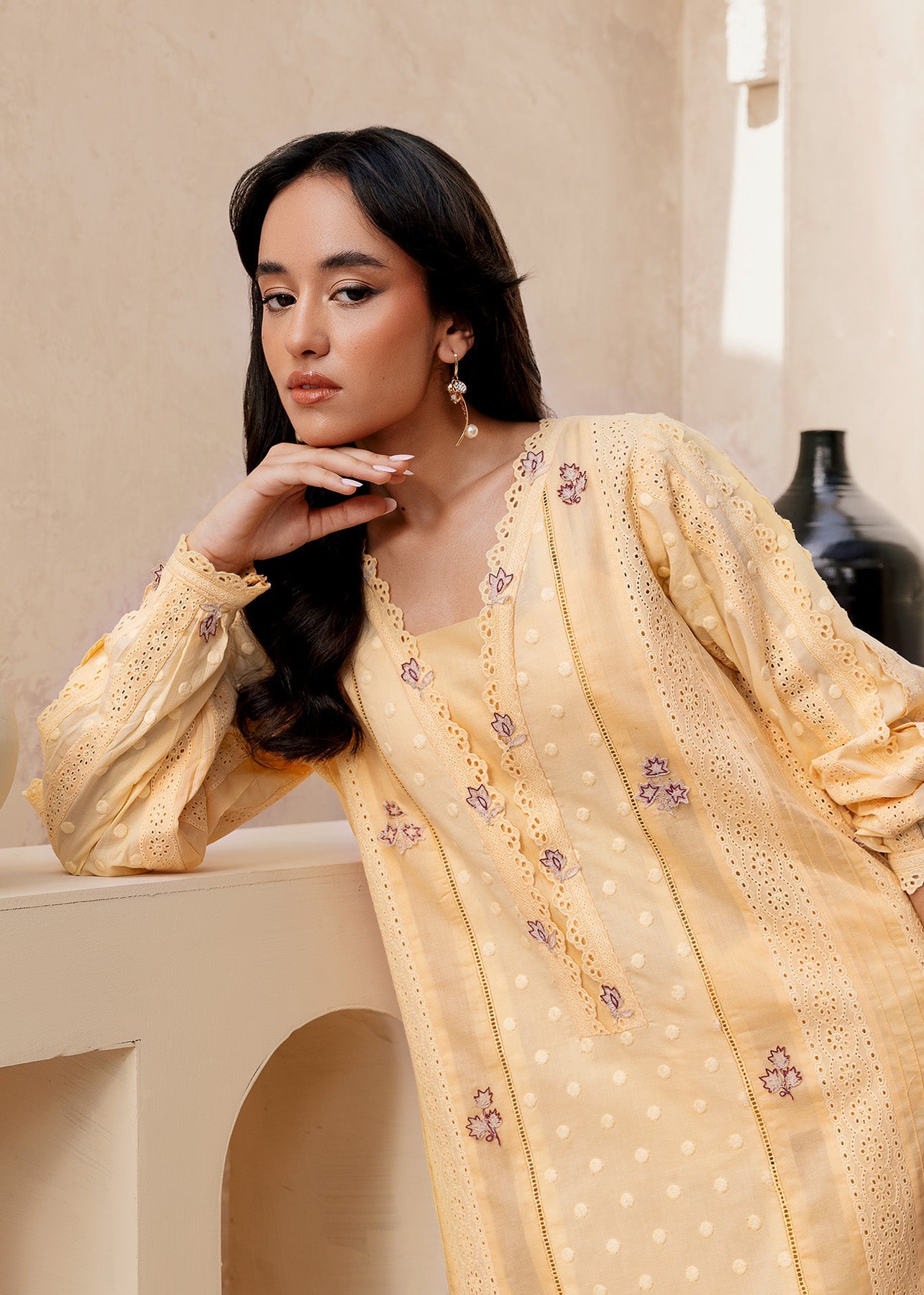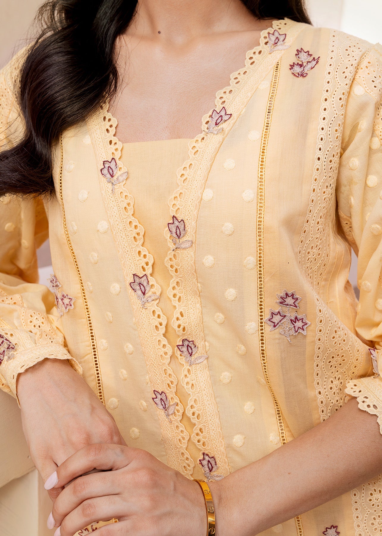 A yellow lawn ensemble brings a burst of summer joy. The star of the show is the deep purple flowers on the shirt, boasting a flattering V-neck trimmed with delicate lace of the same vibrant hue. The playful puff sleeves add a touch of whimsy, while laces that echo the shirt color cascade down the front and sleeves. The look is perfectly balanced with plain yellow trousers.
