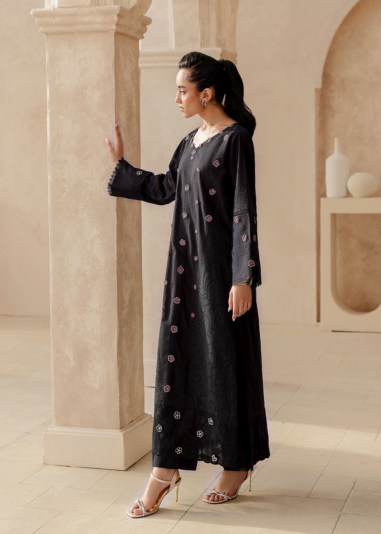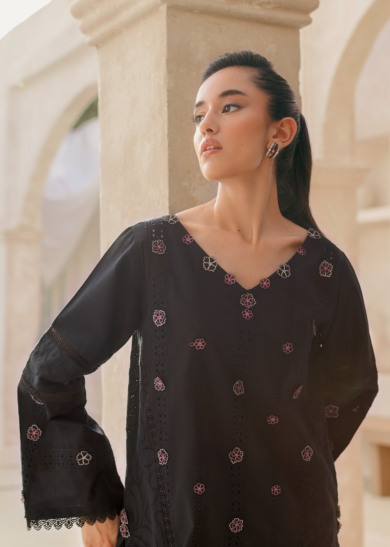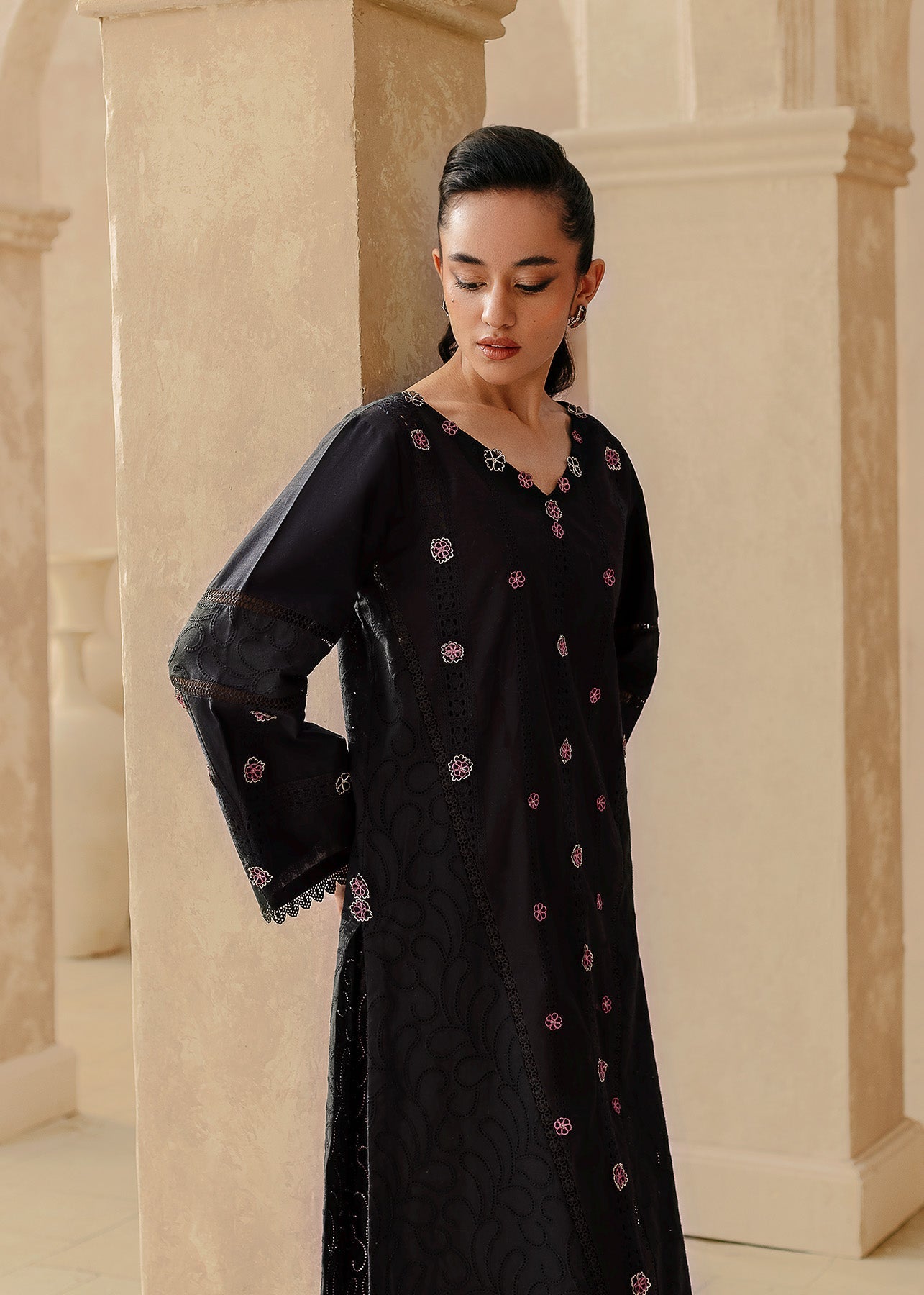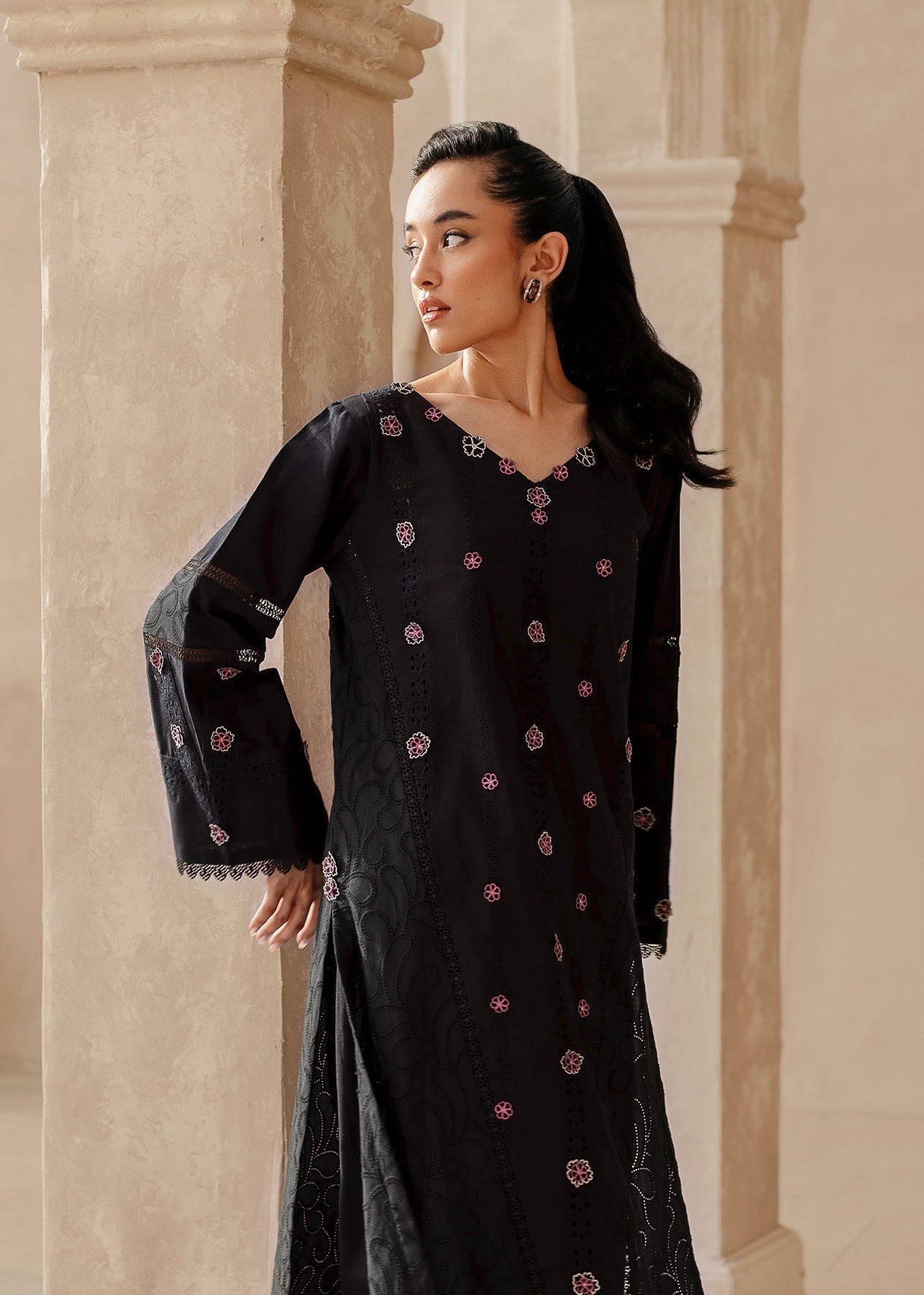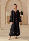 Nazak, a stunning statement piece for the bold and beautiful. This black lawn creation is a canvas for a captivating display of floral embroidery, where delicate pink and white blooms dance across the entire shirt and sleeves. Black embroidery adds another layer of depth. Delicate laces on the sleeves add a hint of femininity. Paired with classic black trousers.