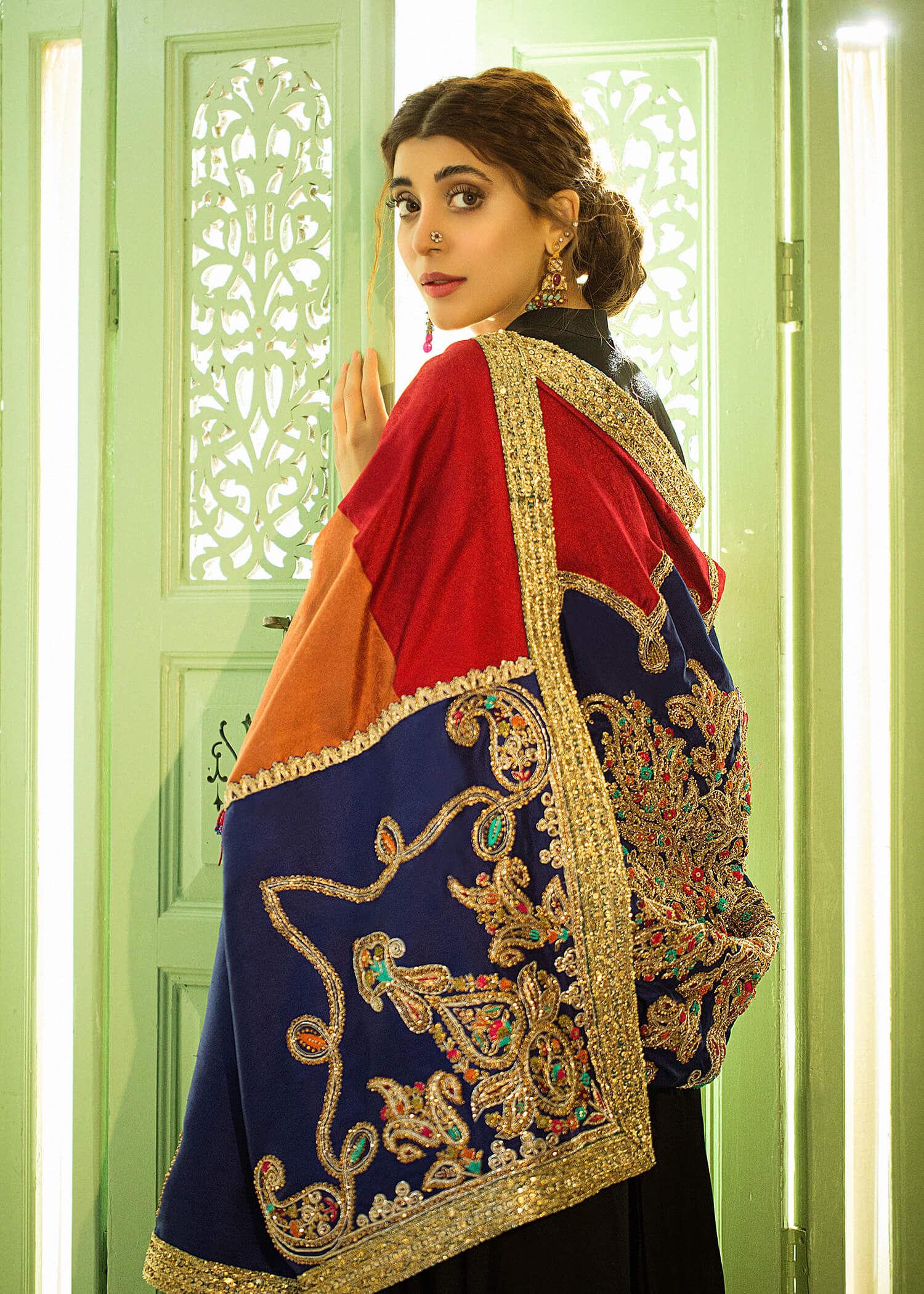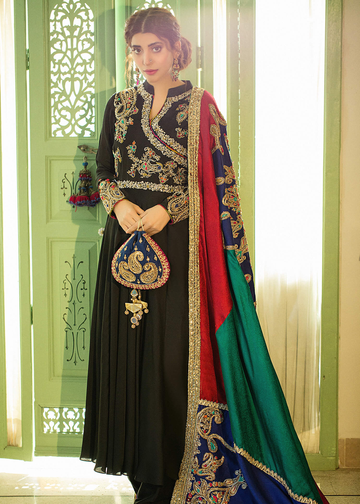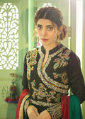 Nazneen is a timeless piece of our ethereal artistry depicting the royal charm of old times. Featuring an exquisite tapestry of colors, this outfit is an epitome of grace embellished with tilla work the dress! Paired along is a timeless fully embroidered shawl (priced separately), making this ready-to-wear dress perfect for any festivity!
