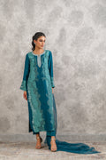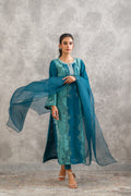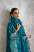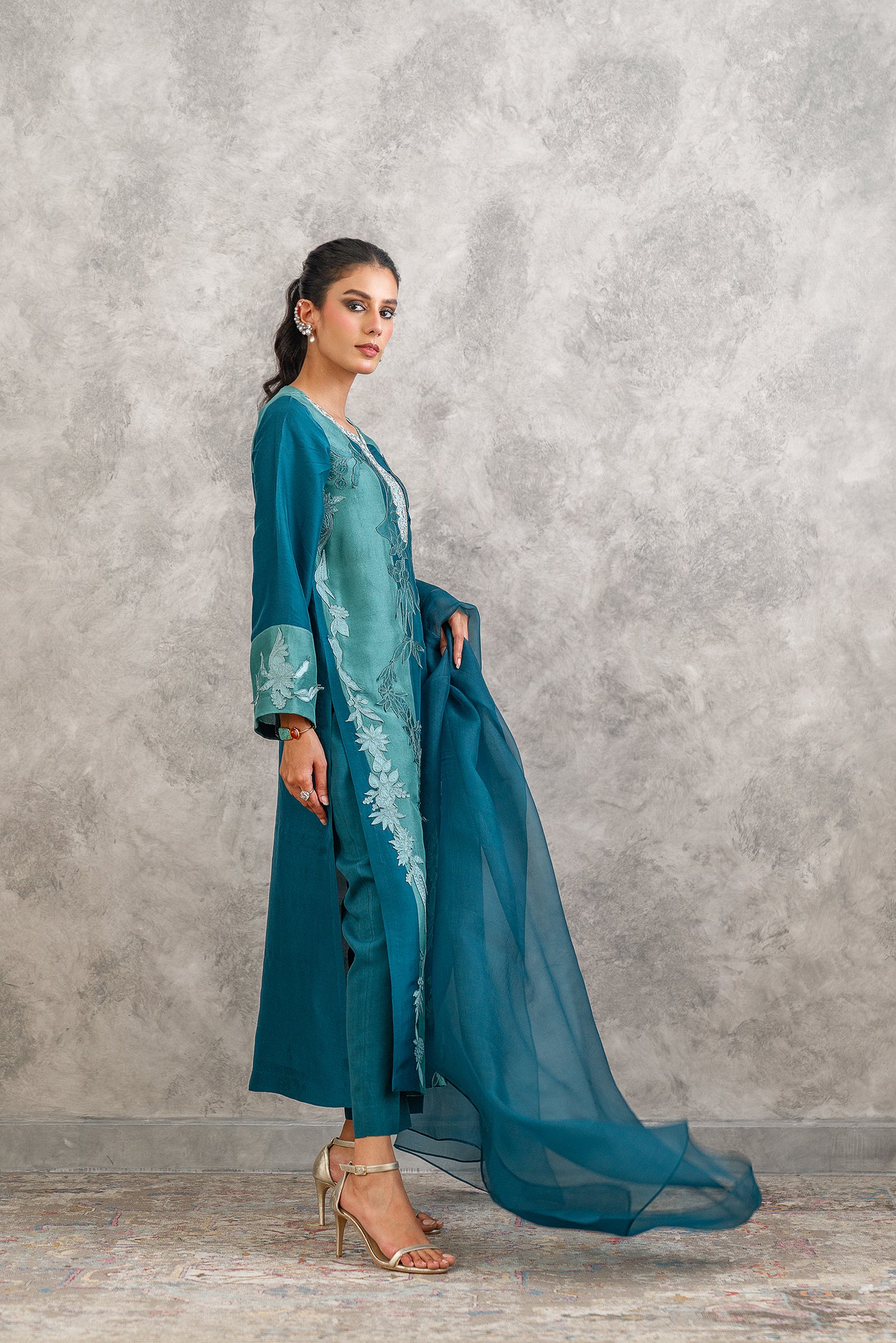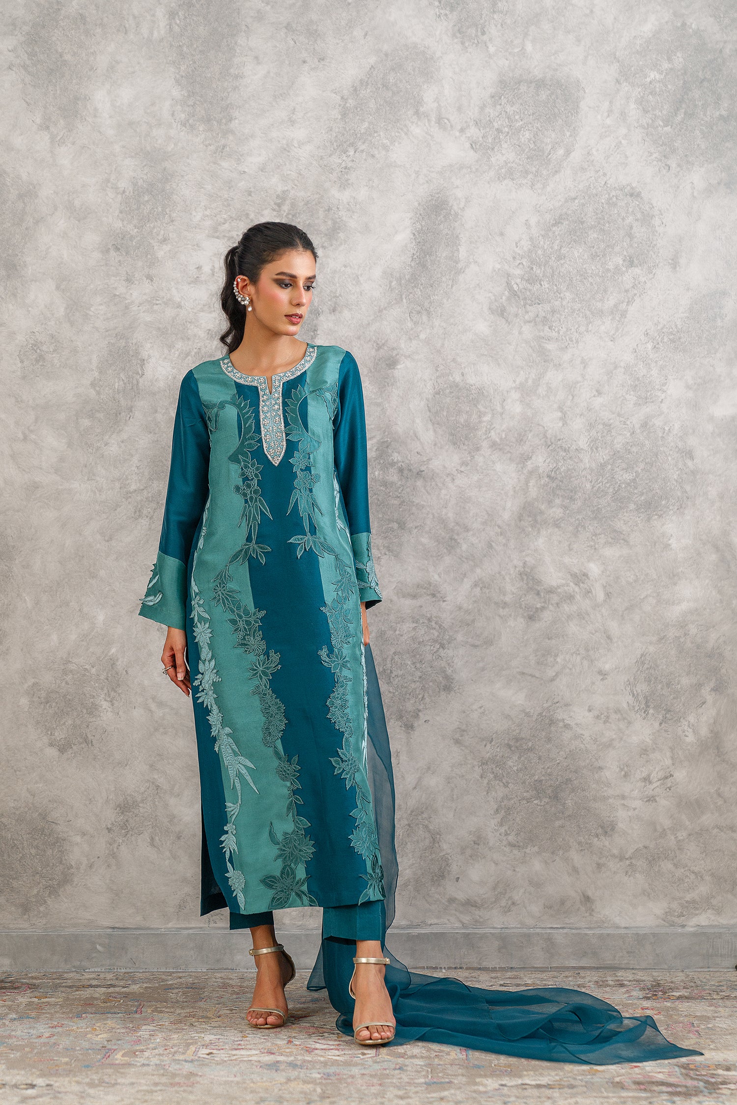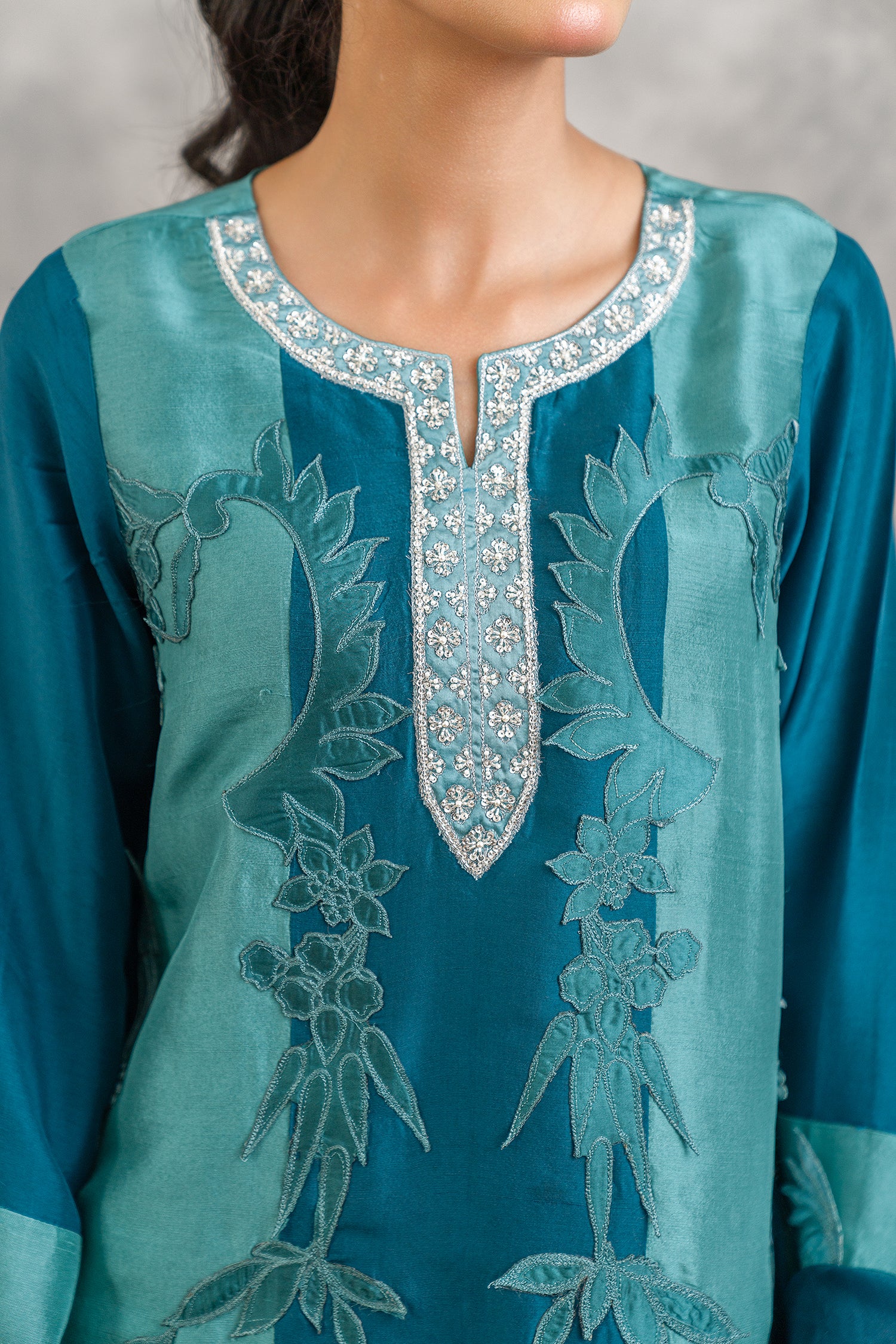 Crafted from pure raw silk, this outfit features panels in different tones of zinc with delicate botanical applique motifs and hand embroidered neckline, paired with organza dupatta and straight viscose silk pants, for timeless elegance.