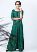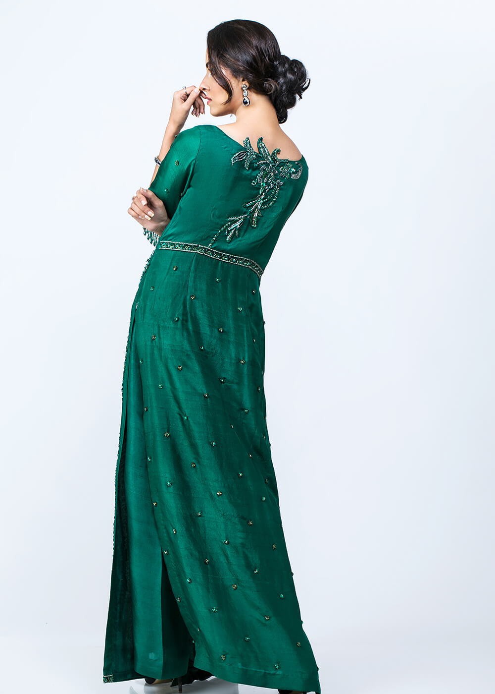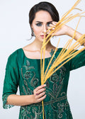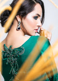 Ocean Breeze, An ingenious design with intricate embroidery on raw silk, Ocean Breeze is a classic floor length front open straight gown rendered in a vivid sequence work with striking semi-precious stones and gorgeous crystals adornment. Its delicate & outstanding Qora and Dabka work beautifully come together to further enhance its royal aura. This fabulously feminine seamless emerald green gown is impeccable for evenings filled with love & romance.