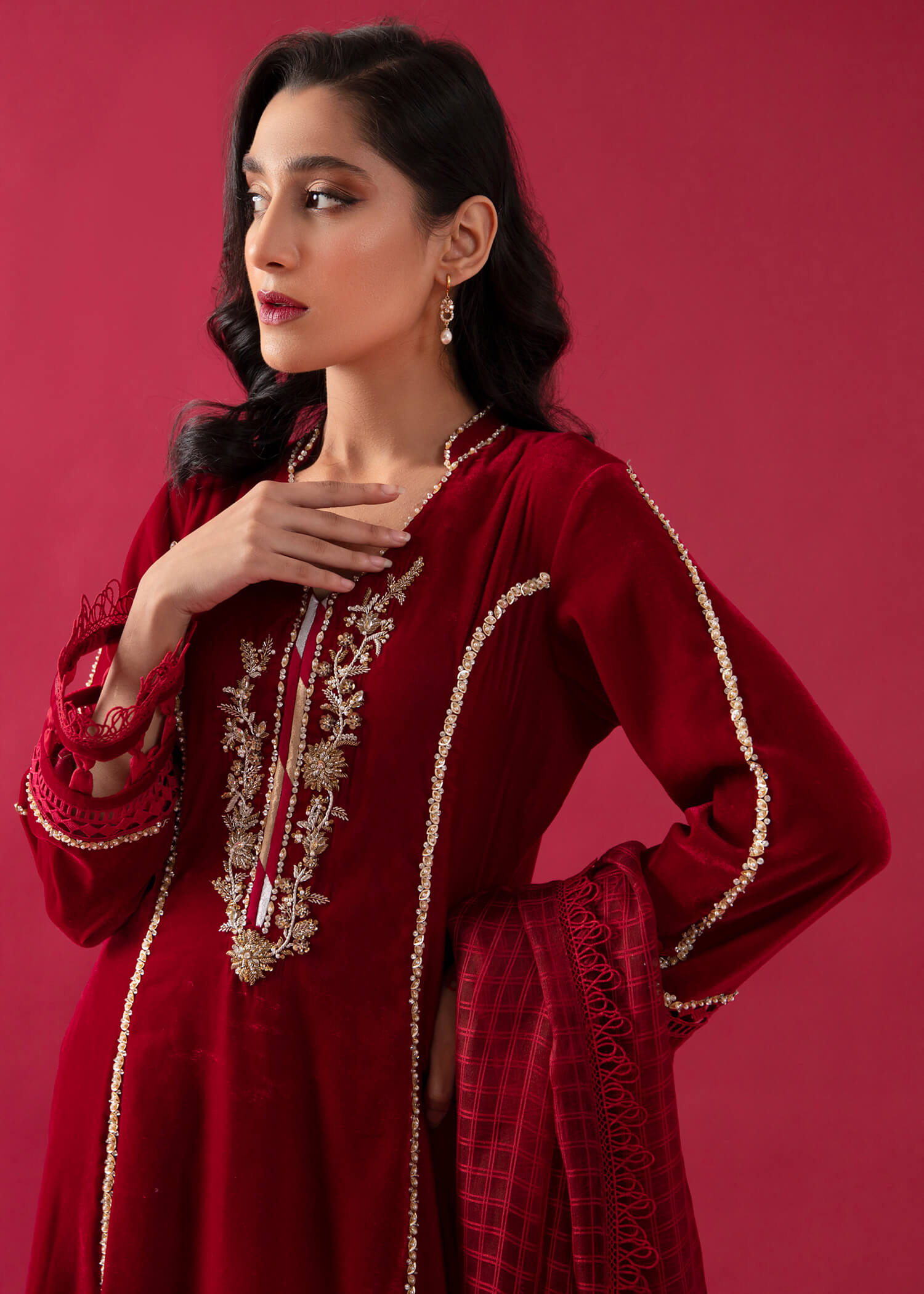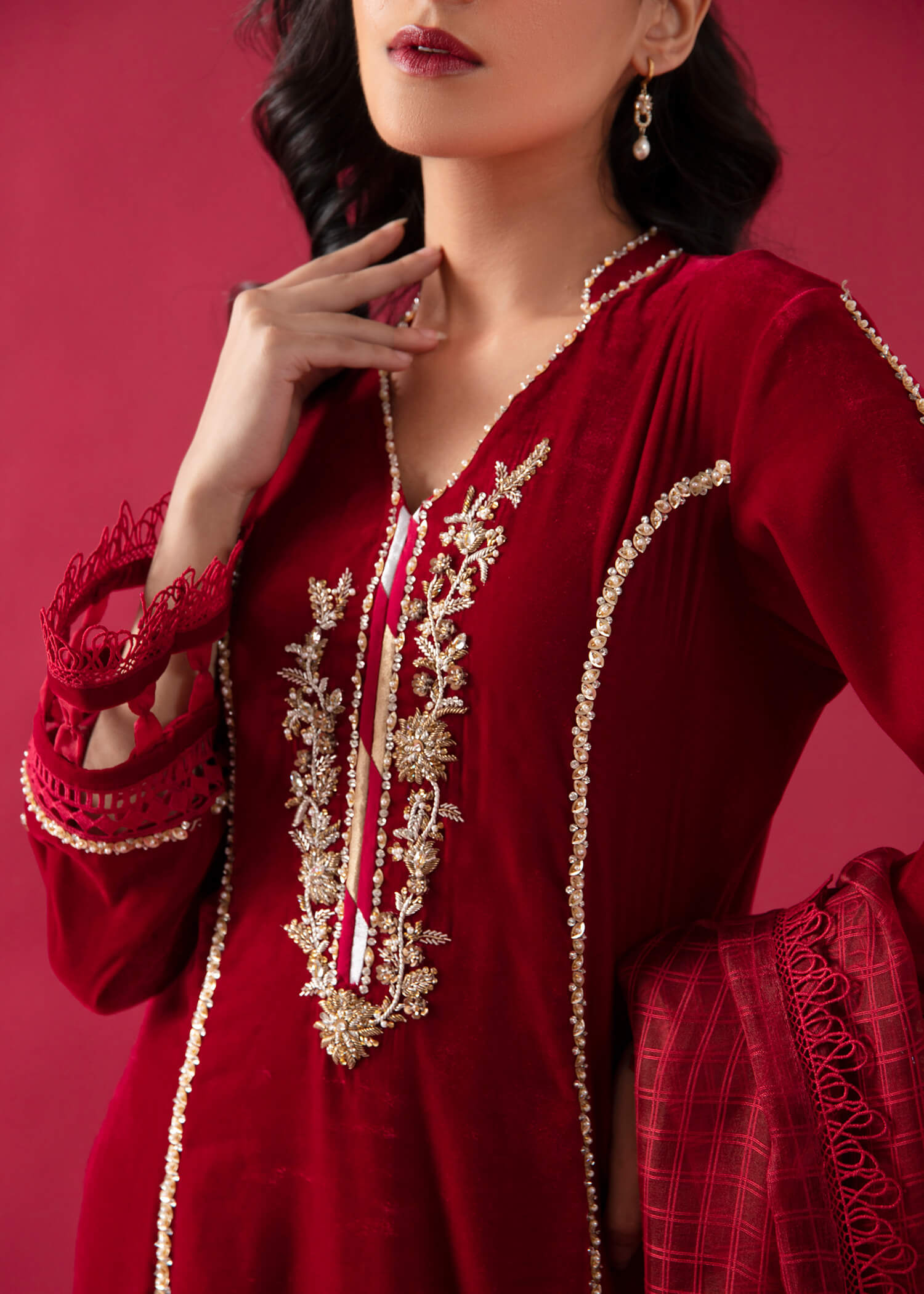 A gorgeous deep red velvet ensemble paired with satiny viscose silk pants and striking jacquard organza dupatta. This finery comes with intricate hand embroidery on the neck, sleeves and panels making it a perfect choice for your winter wardrobe!