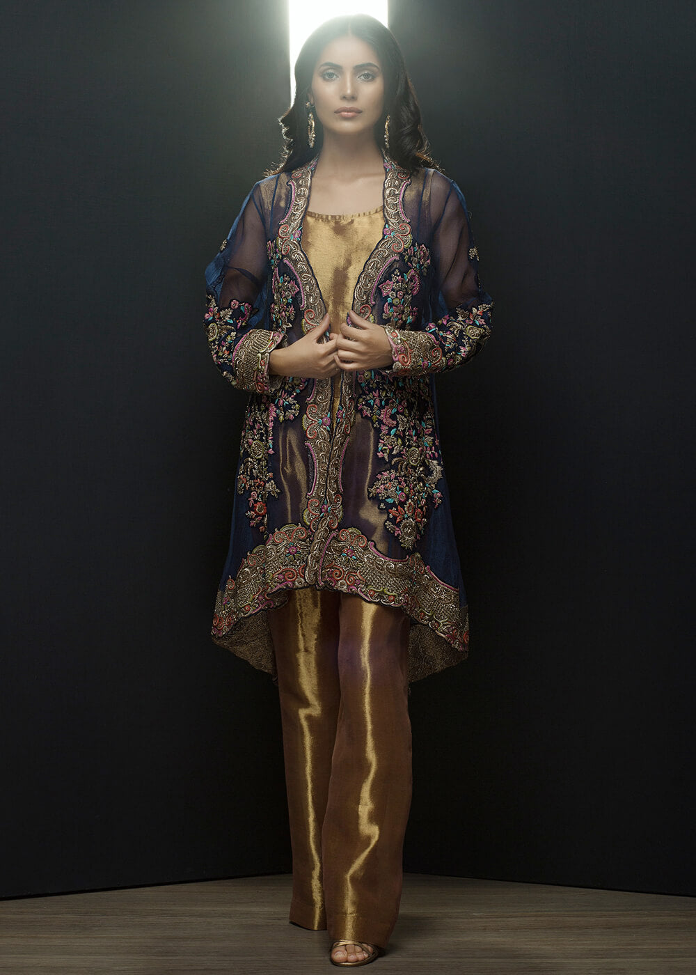 Indulge in most luxurious hand embroided jacket with tissue under shirt and pants to give regal as well as trendy look.