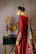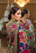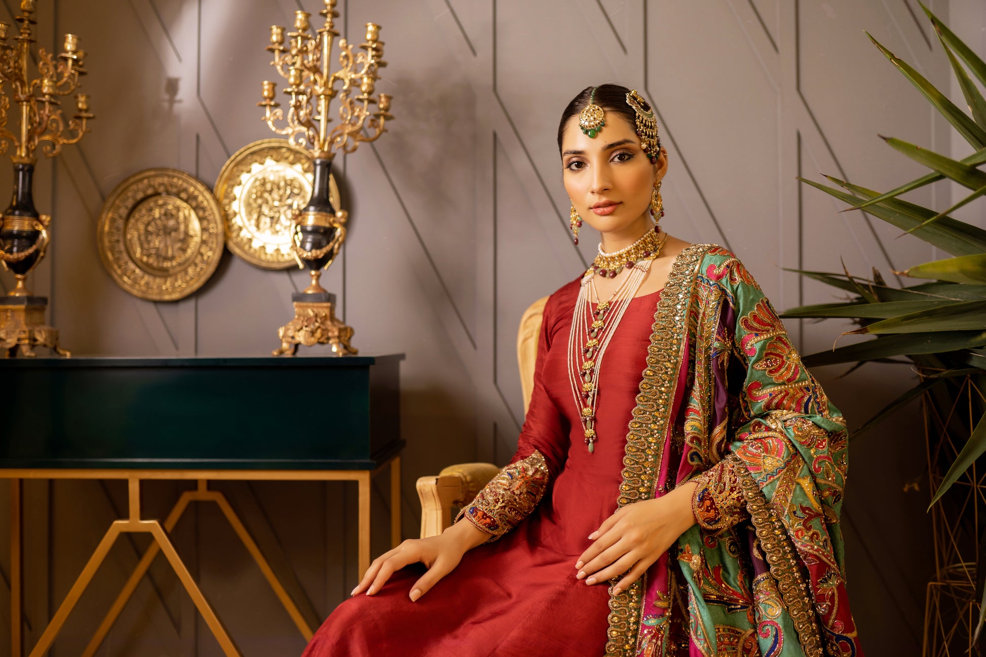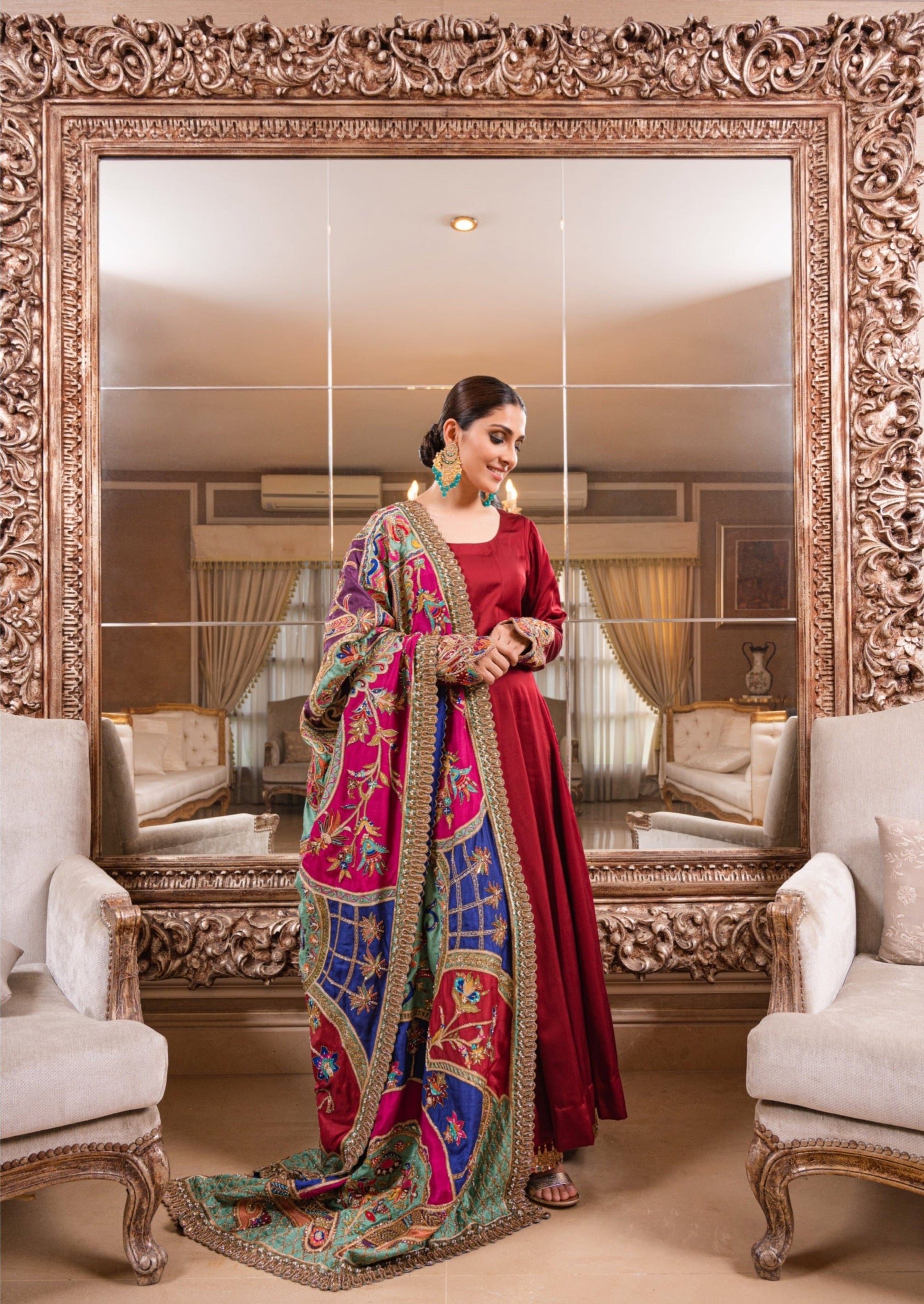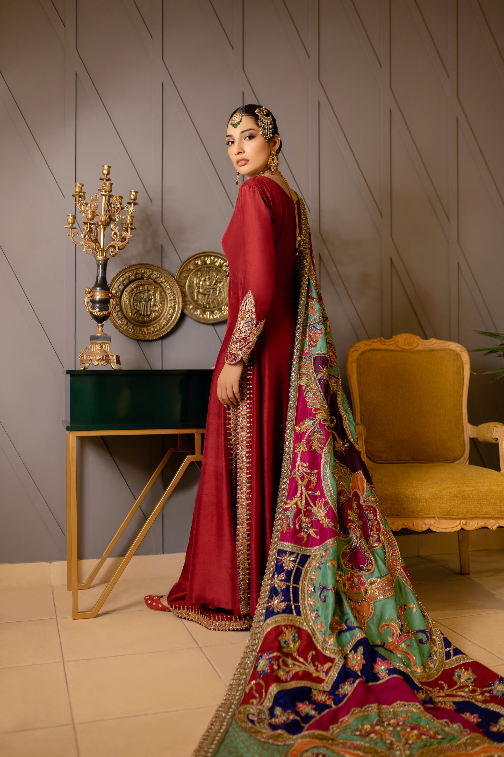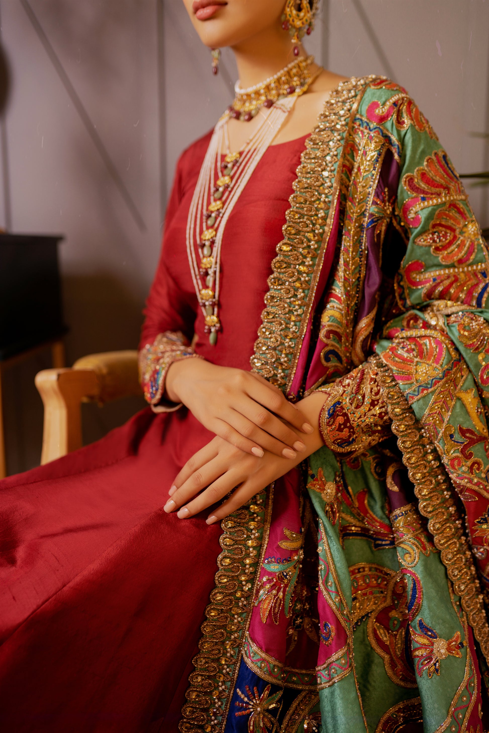 Adorned with lavish Zardozi embroidery, shimmering metallic threads trace regal patterns across the surface, adding a touch of opulence. Delicate resham (silk thread) embroidery softens the composition, bringing balance and artistic finesse through vibrant, hand-stitched motifs that echo the grandeur of Mughal design.