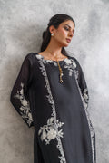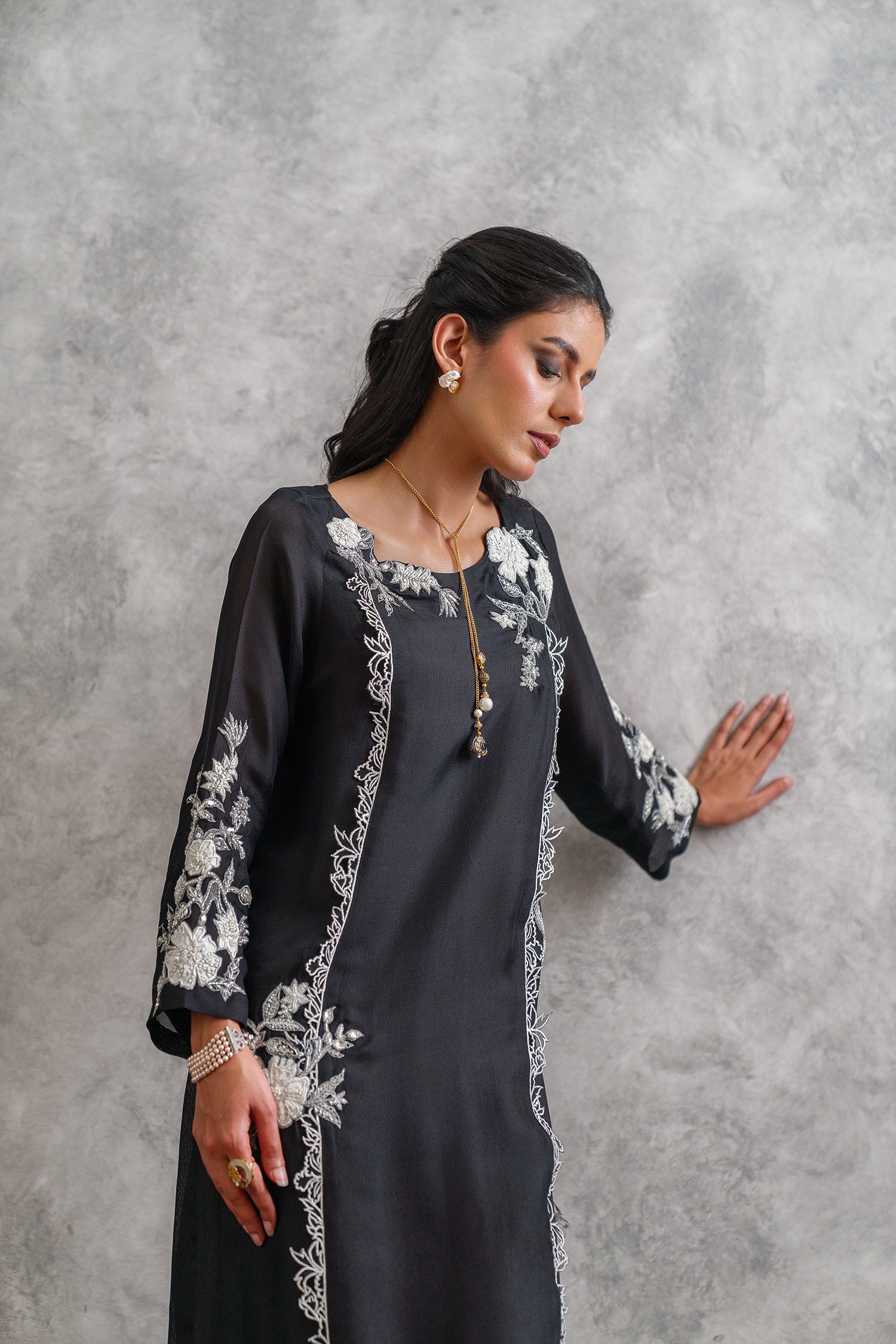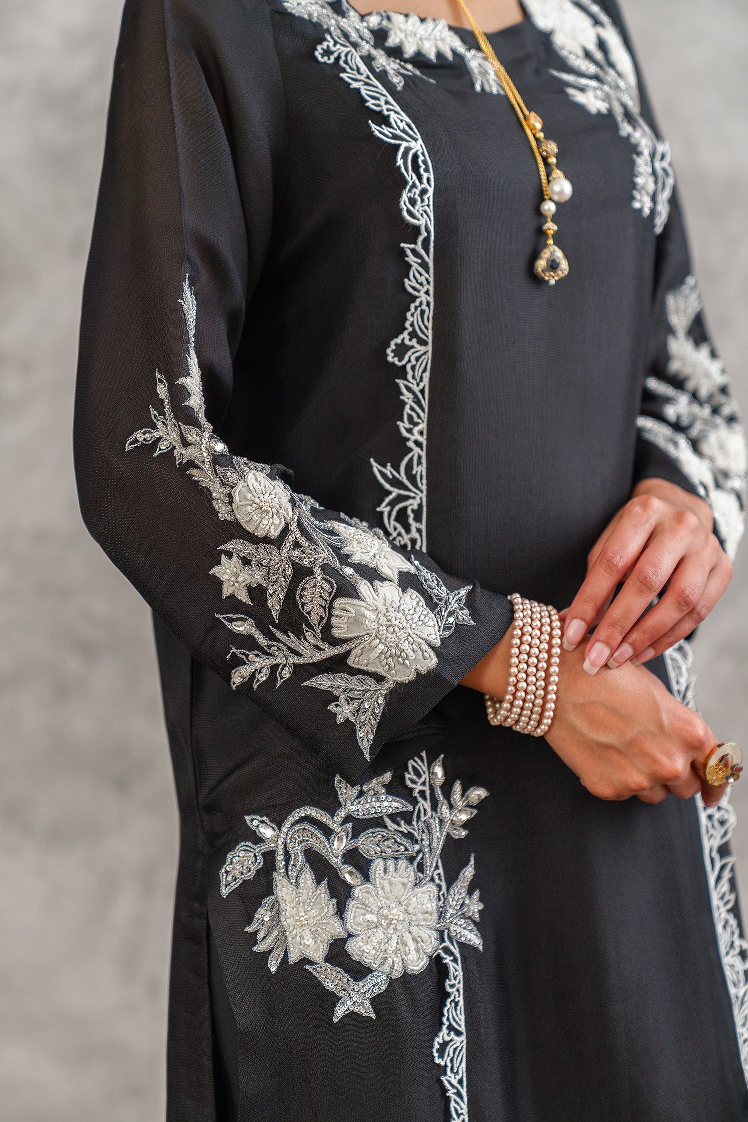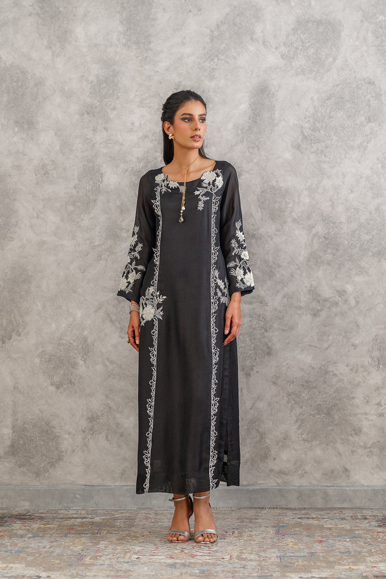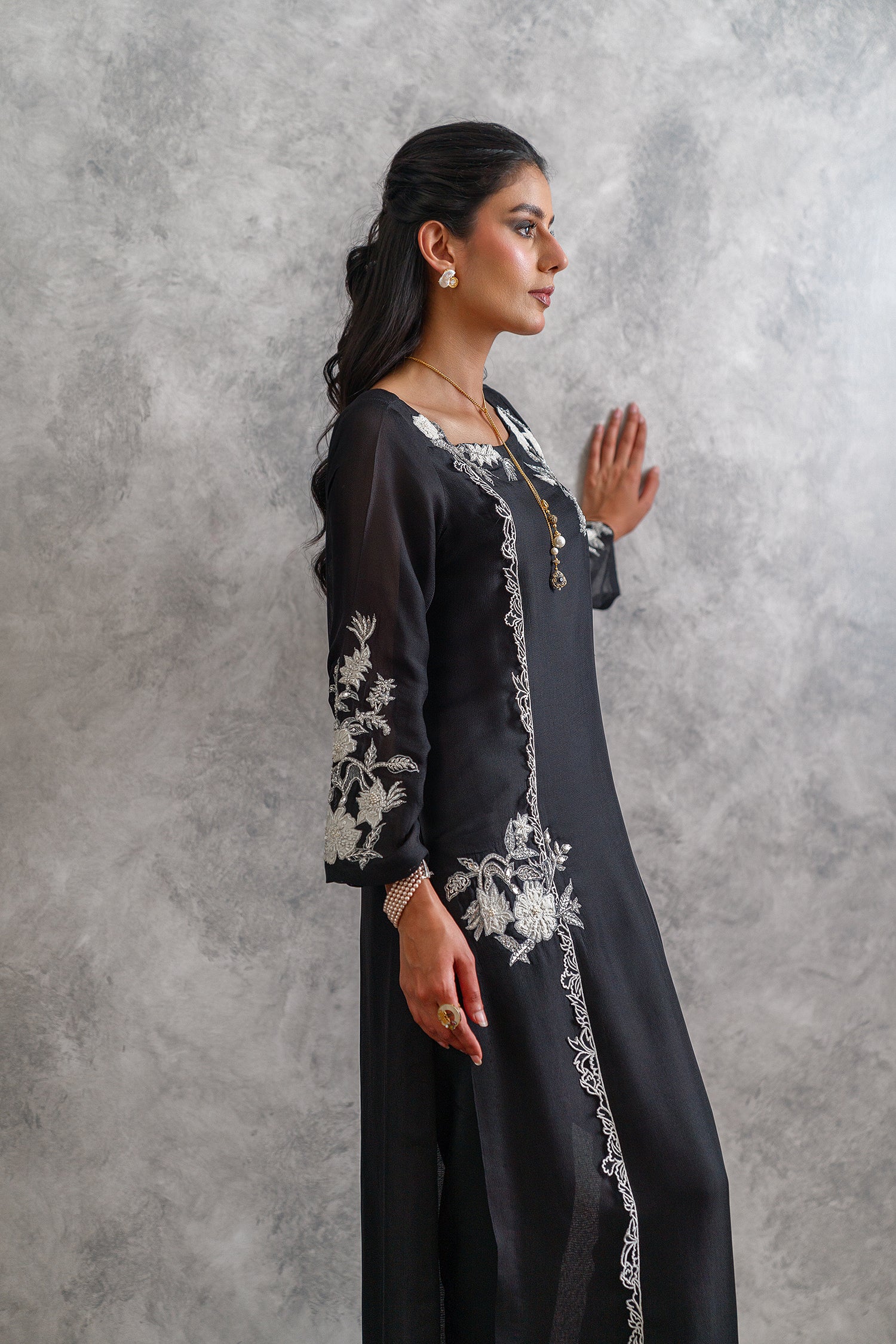 An elegant black kaftan is cut from pure silk net and adorned with intricate hand embroidery. Paired with straight pants, this monochromatic embroidery lends a contemporary charm to a classic look.