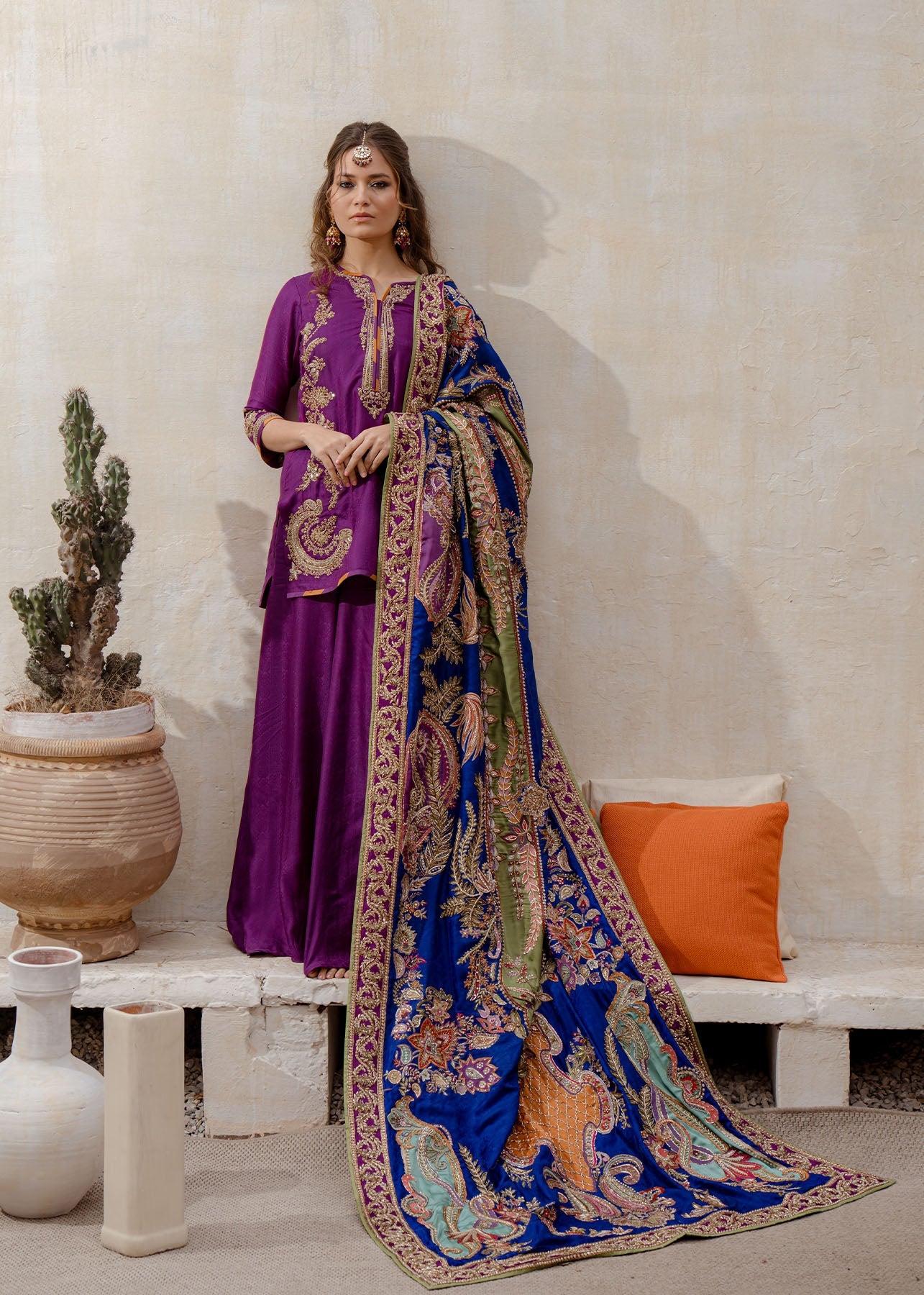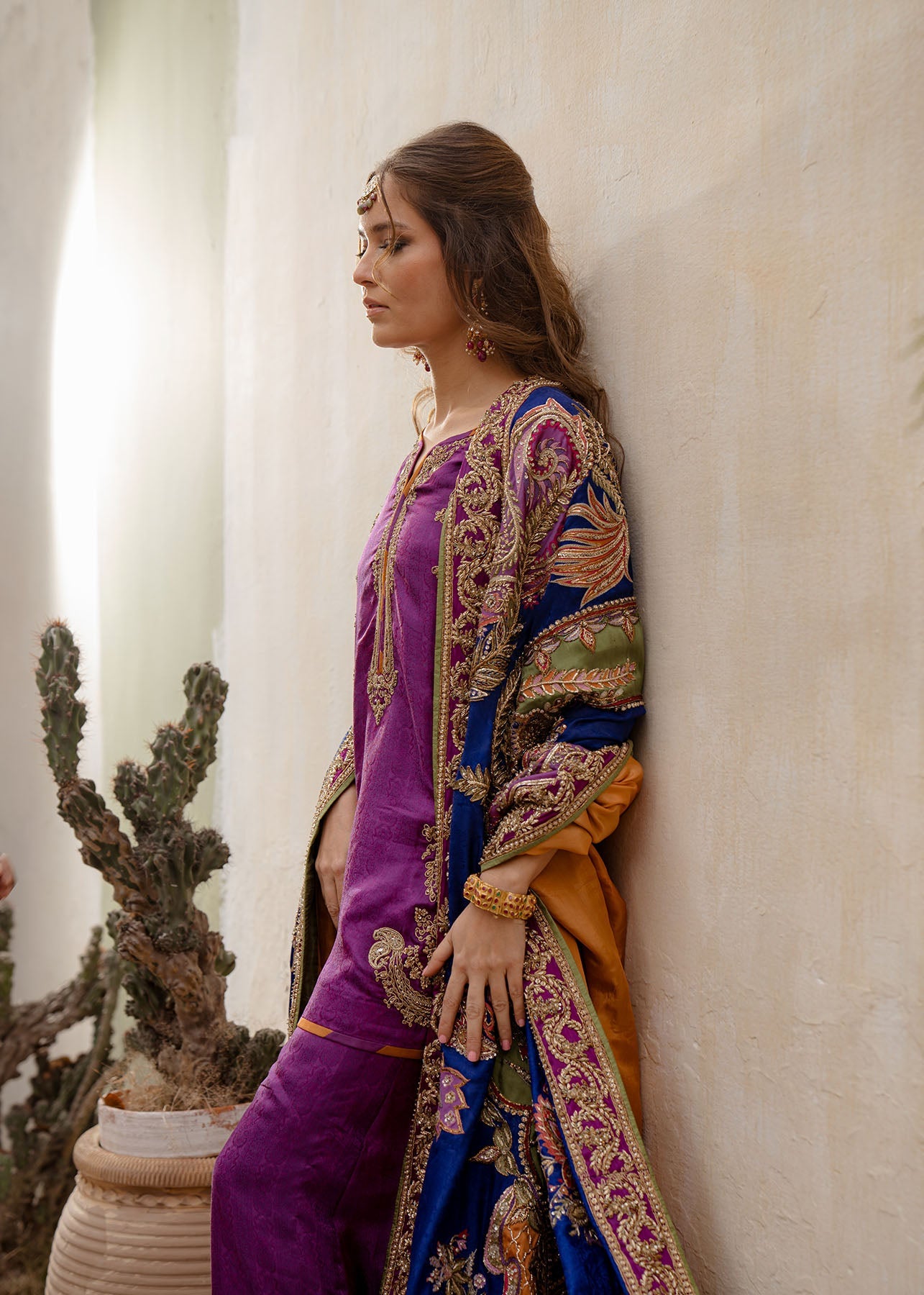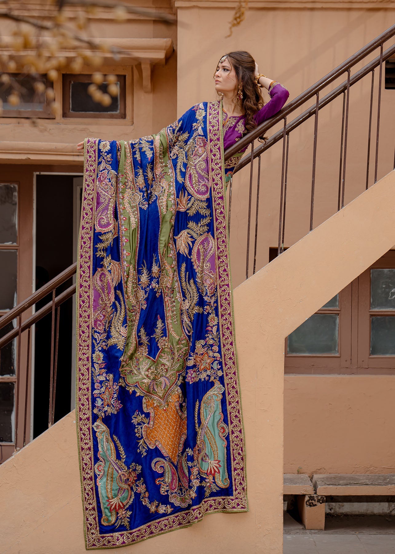 Zora is a true labor of love, adorned with beautifully composed patch work embroidery in detailed hues blue, green, rust and cream over a canvas of pure silk maroon jamawar, . Paired with a gorgeous contrasting silk jamawar dress featuring marrori embroidery and chatta patti details.