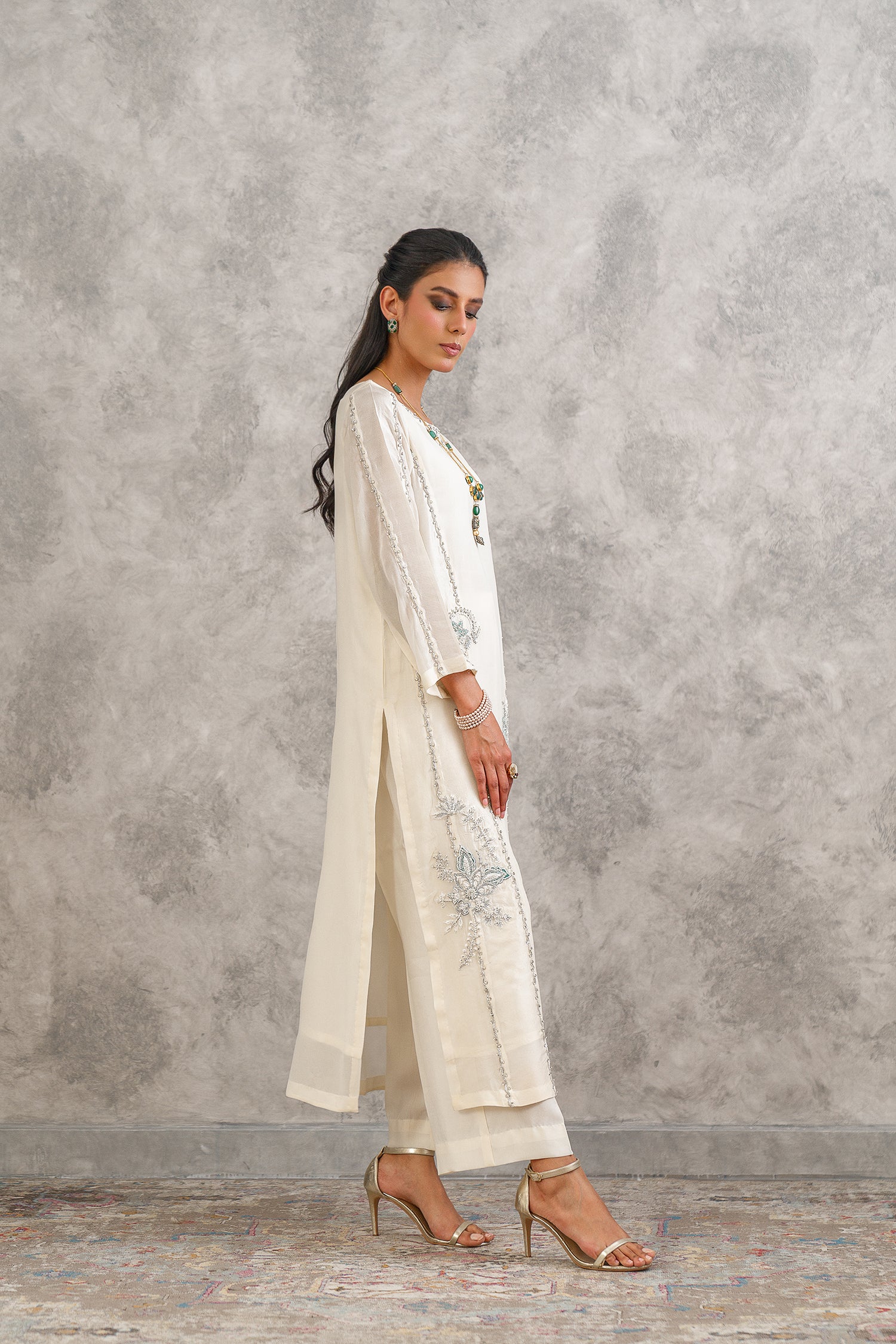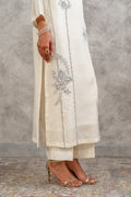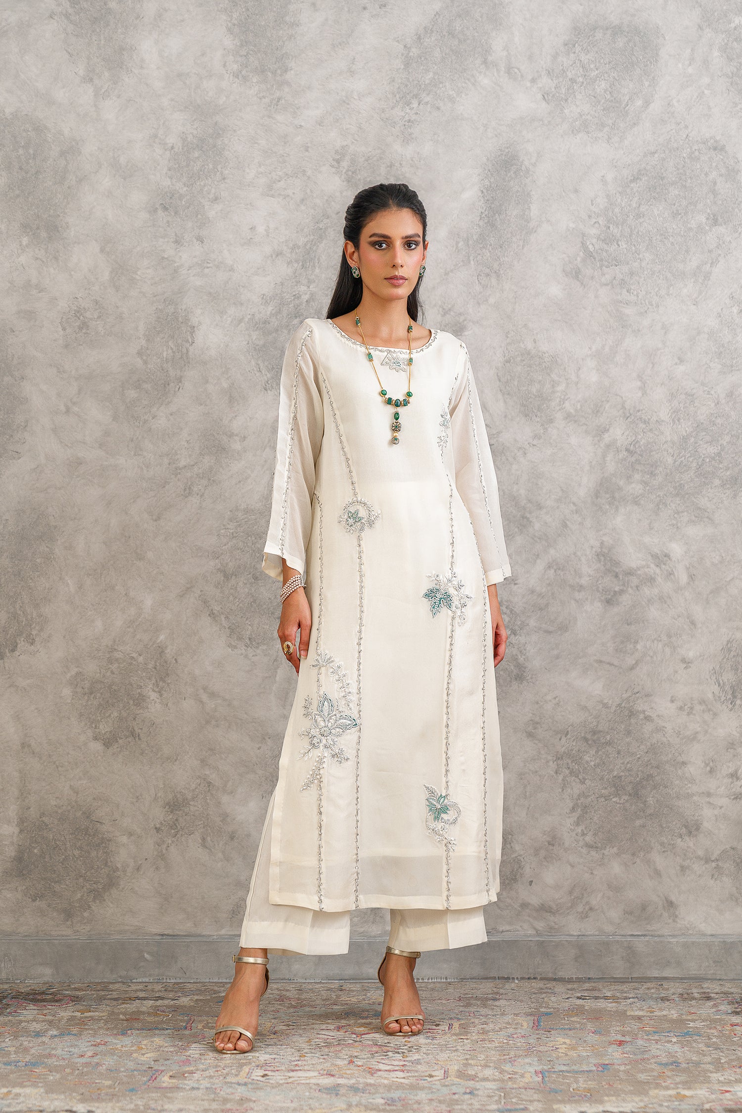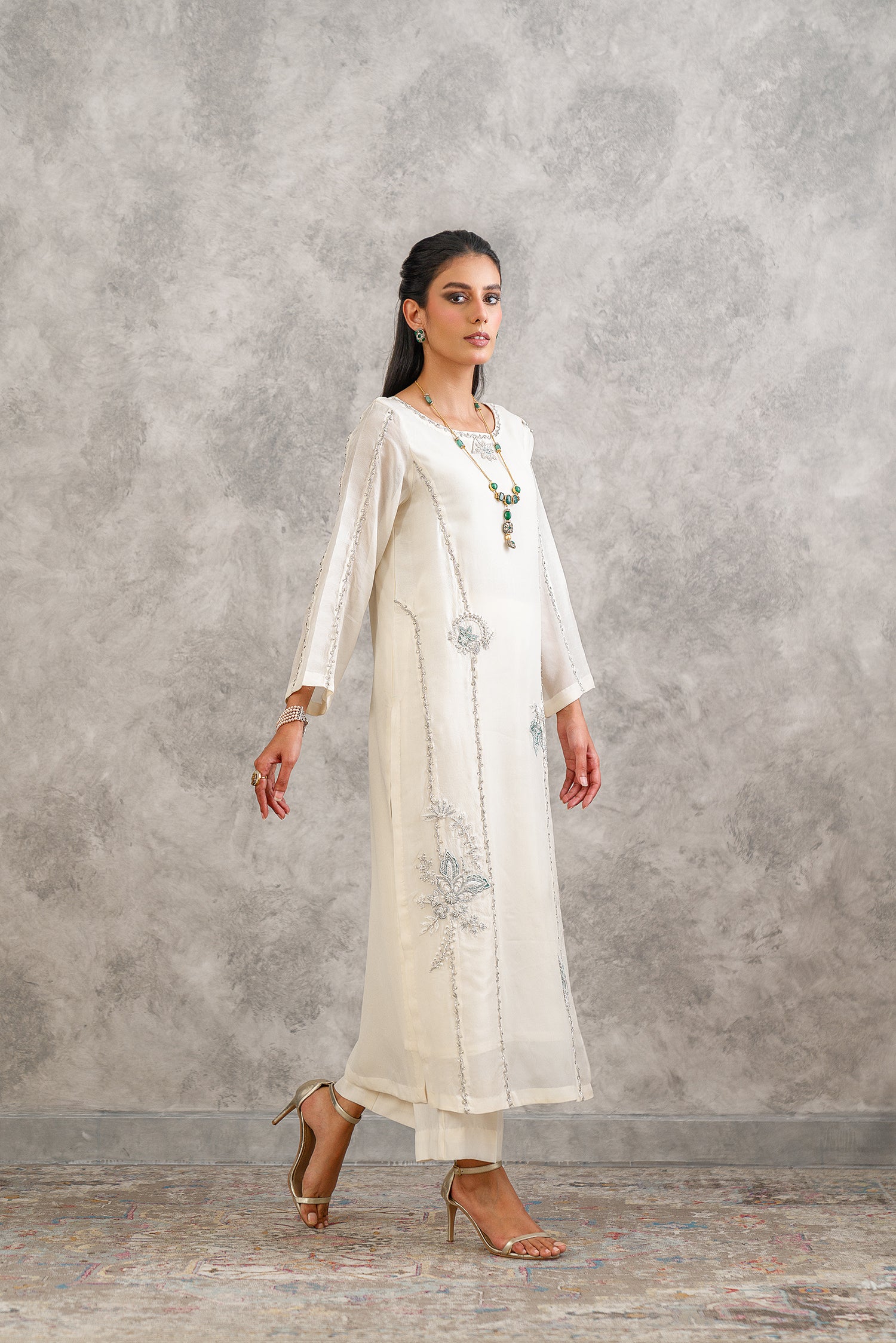 Indulge in the allure of this white pearl white chiffon embroidered shirt adorned with delicate hand embroidered motifs over raw silk panels, exquisitely complemented by straight loose pants. This ensemble is paired chiffon dupatta.